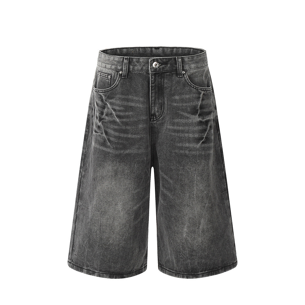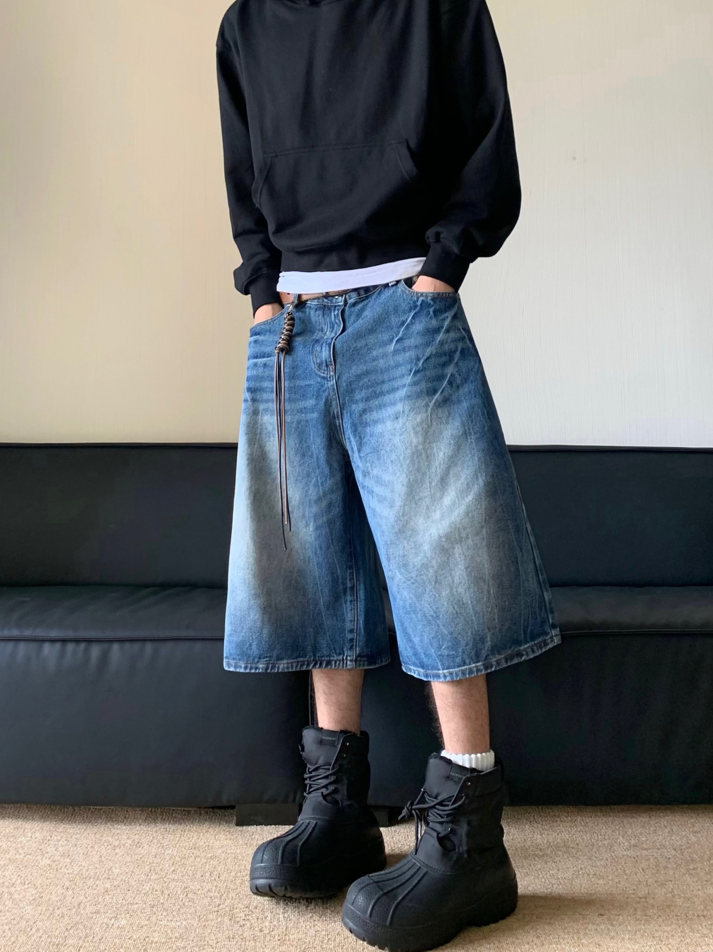 아메리칸 레트로 올드 번개 패턴 스트레이트 데님 반바지 남성 여름 신작 루즈 크롭 팬츠 드레이프 와이드 레그