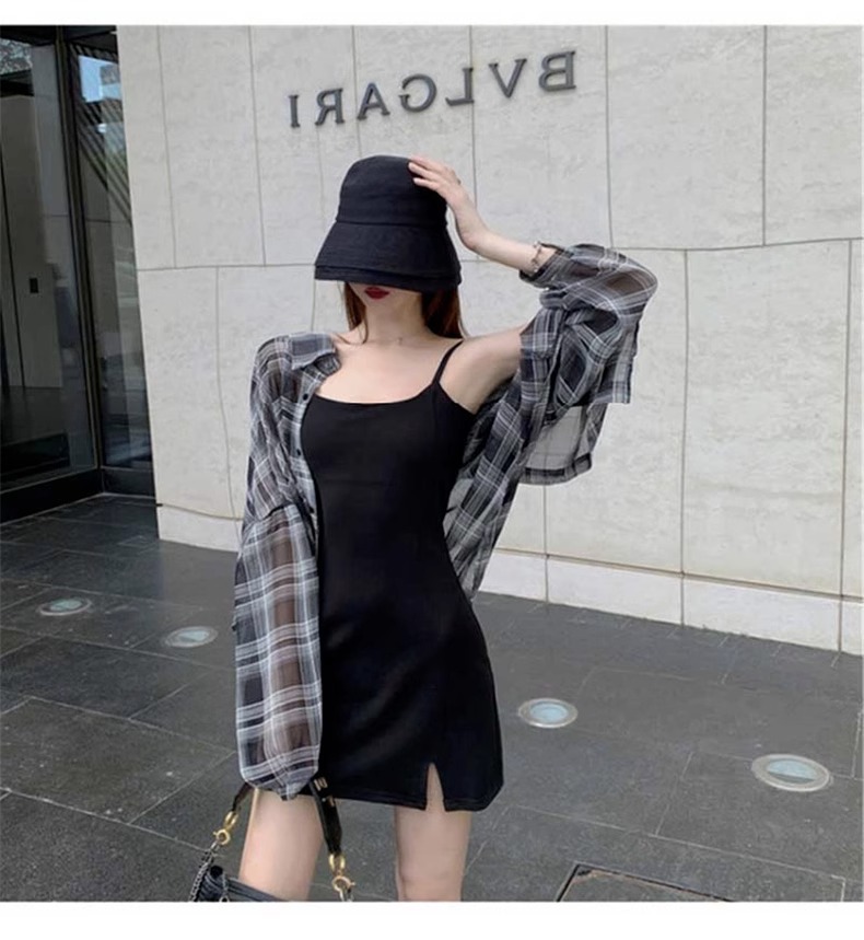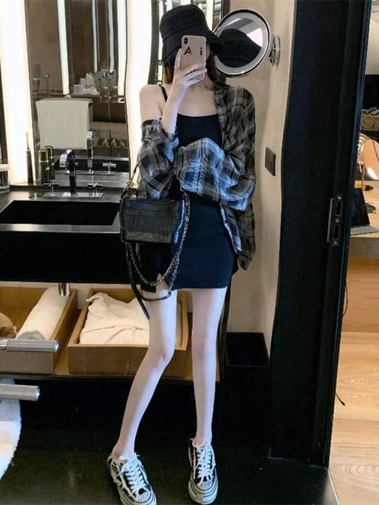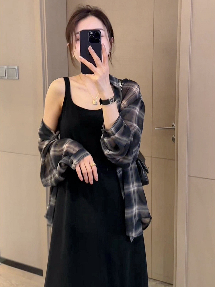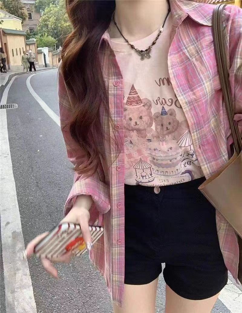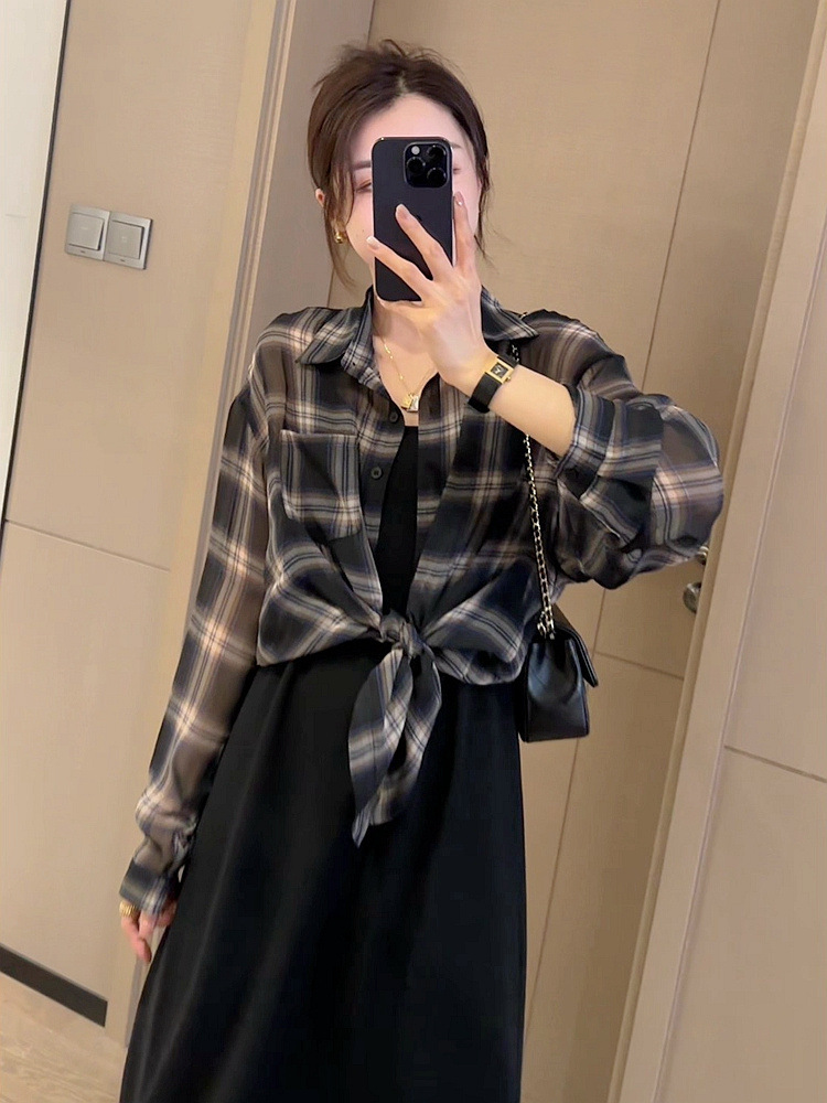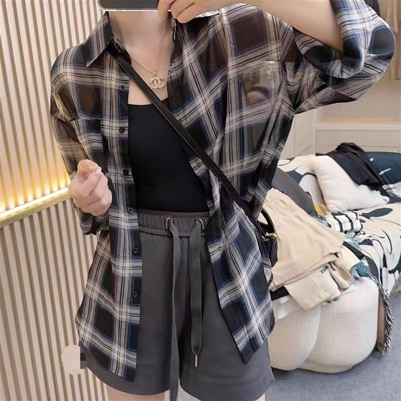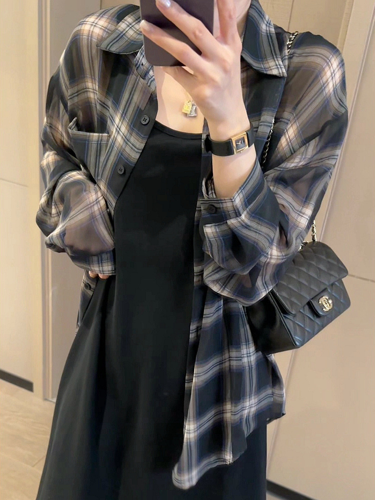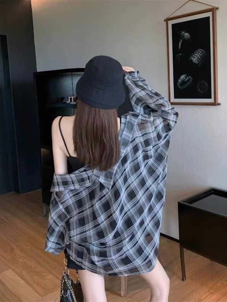 2024 여름 자외선 차단 셔츠 얇은 스타일 프렌치 스타일 초가을 루즈핏 체크 셔츠 여성용 면 긴팔스토어 가기