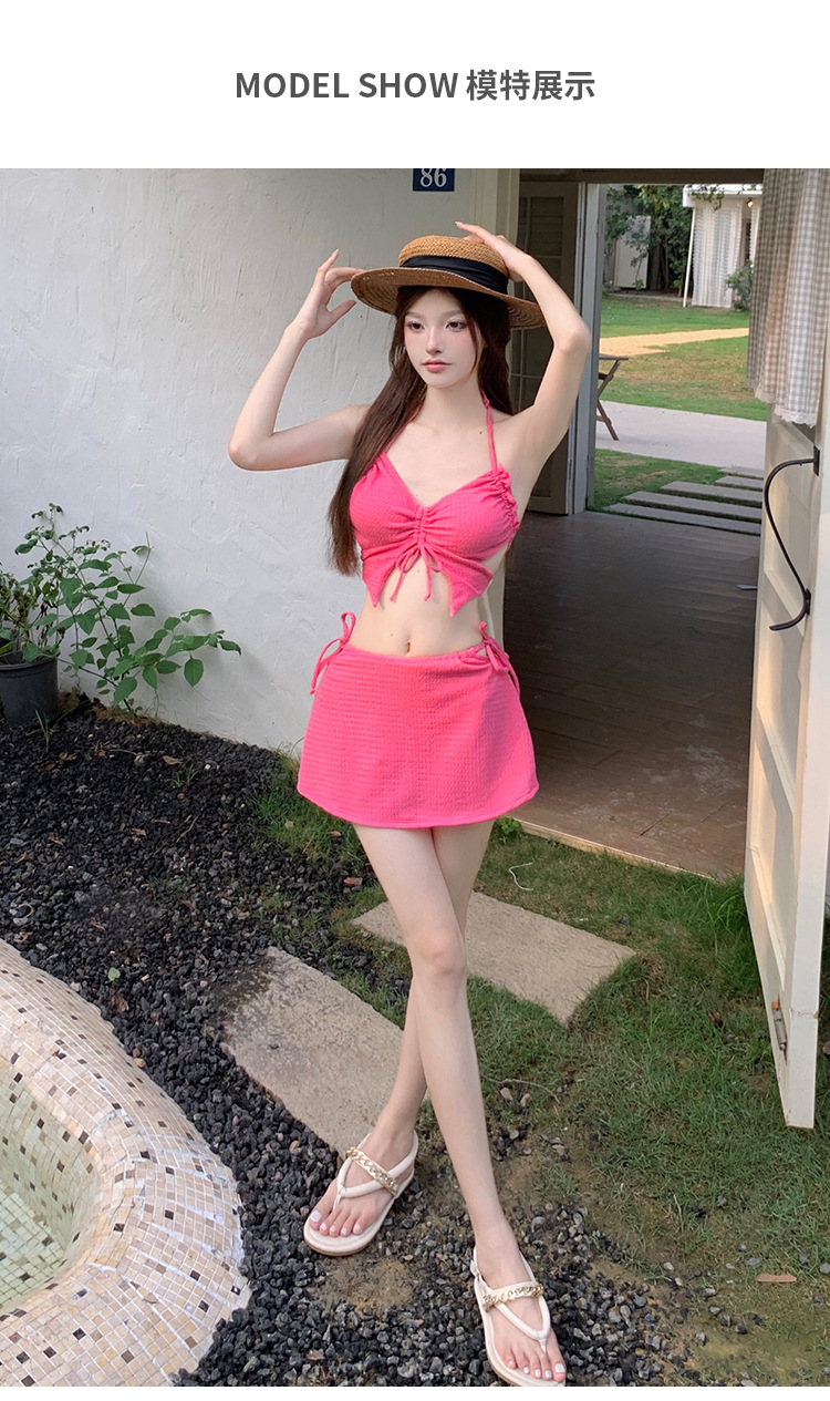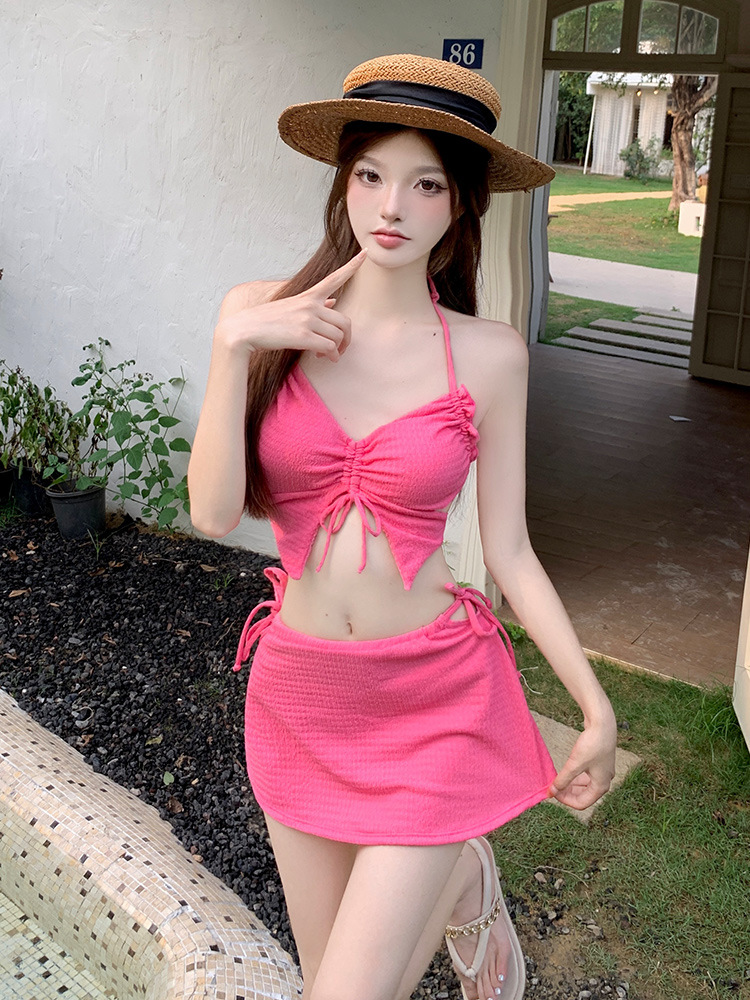 새로운 순수 비키니 3 피스 세트 달콤한 섹시한 로즈 레드 스파이스 소녀 비치 휴가 스커트 스플릿 수영복 여성스토어 가기