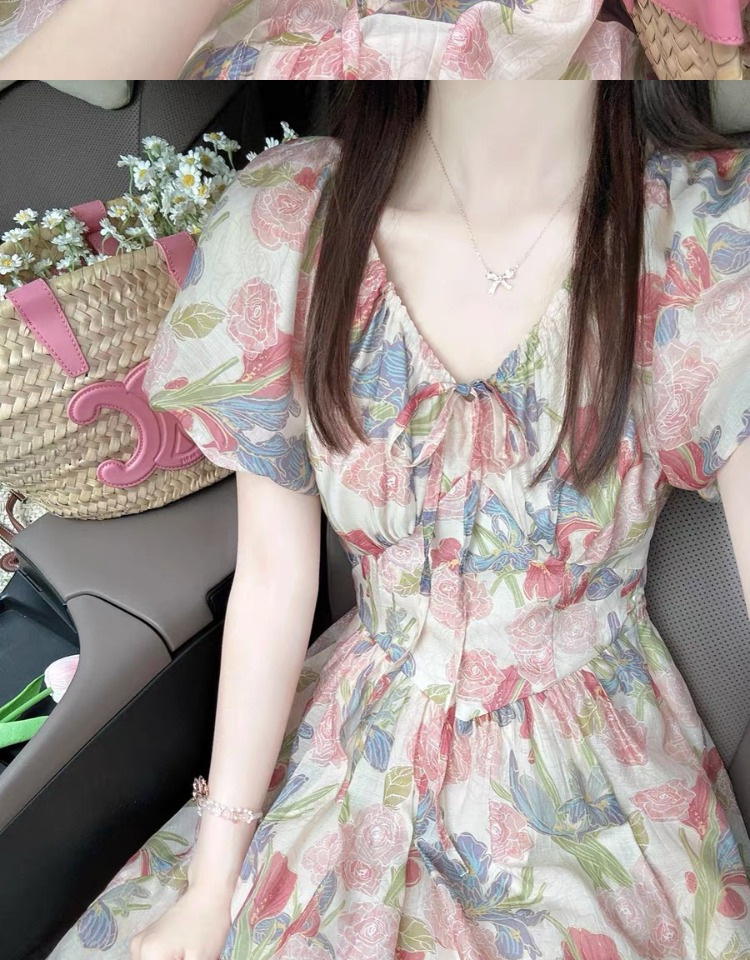 플러스 사이즈 목가적 인 스타일 프랑스 스타일 V 넥 반팔 원피스 여성 여름 통통녀 꽃 A 라인 스커트 슬림 핏 커버 스커트스토어 가기
