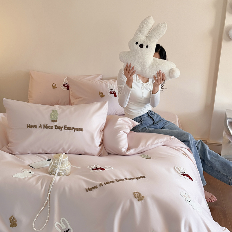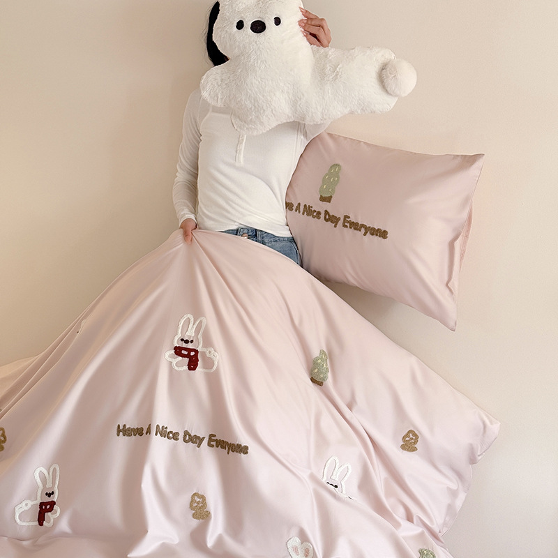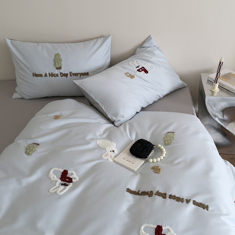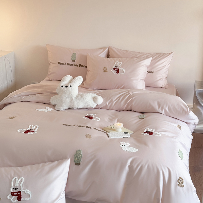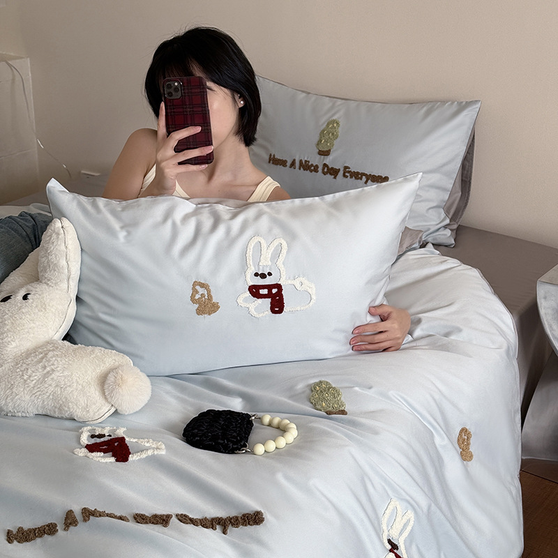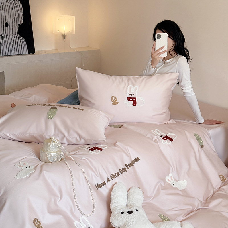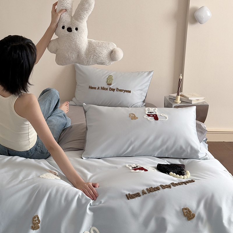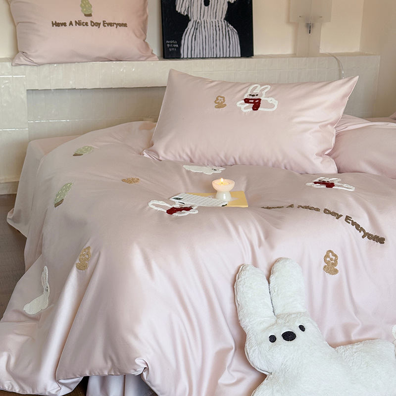 100S 긴 스테이플 코튼 4 피스 세트 봄과 여름 만화 침대 시트 퀼트 커버 침구 어린이 수건 자수 4 피스 세트스토어 가기