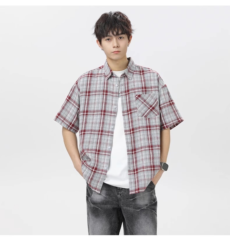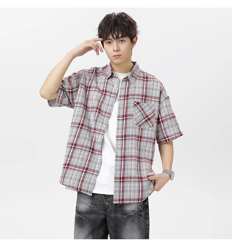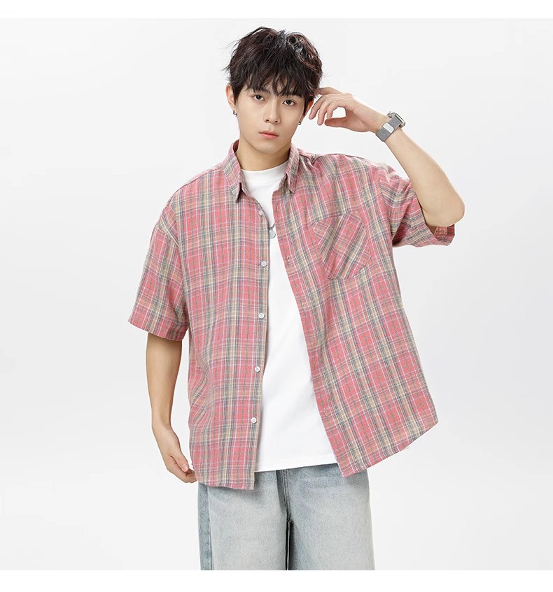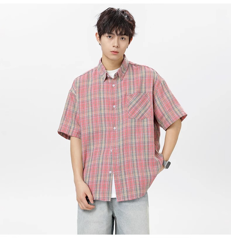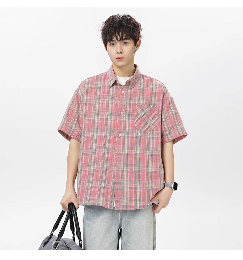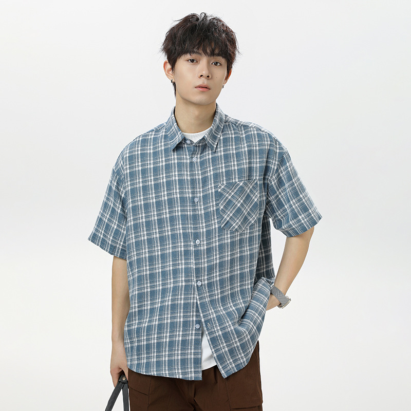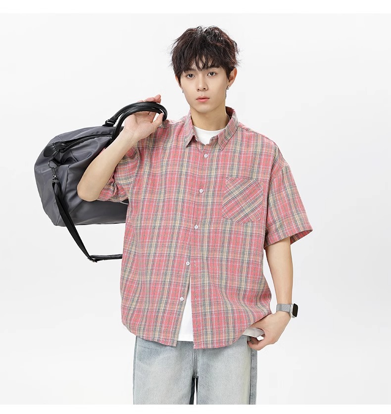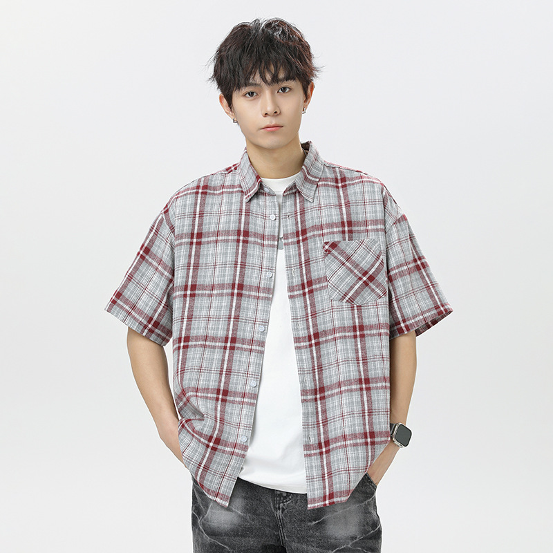 NASA 여름 2025 새로운 패션 브랜드 일본 스타일 체크 캐주얼 반팔 셔츠 남성 디자인 감각 느슨한 반팔 셔츠스토어 가기