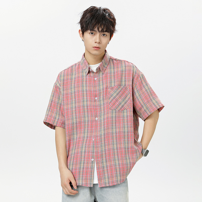 NASA 여름 2025 새로운 패션 브랜드 일본 스타일 체크 캐주얼 반팔 셔츠 남성 디자인 감각 느슨한 반팔 셔츠