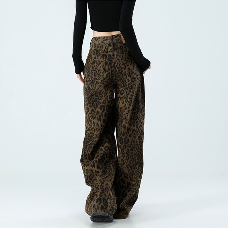 여성을 위한 루즈한 와이드 레그 청바지, 레트로 드레이프 바닥 길이 팬츠 디자인, 2025 봄 여름 커피 브라운 레오파드 프린트 팬츠스토어 가기