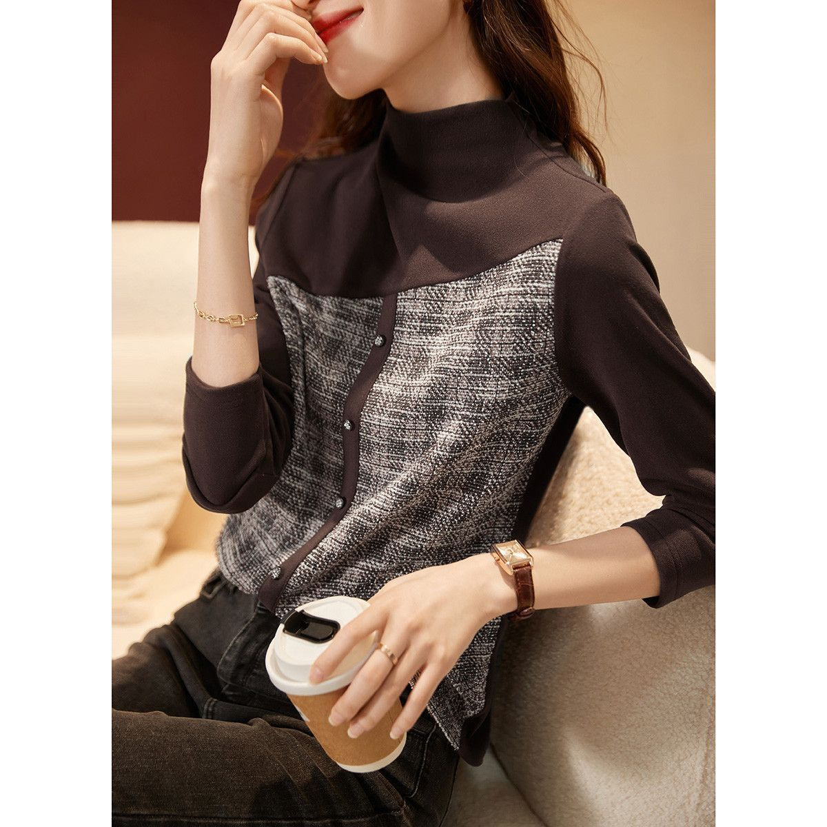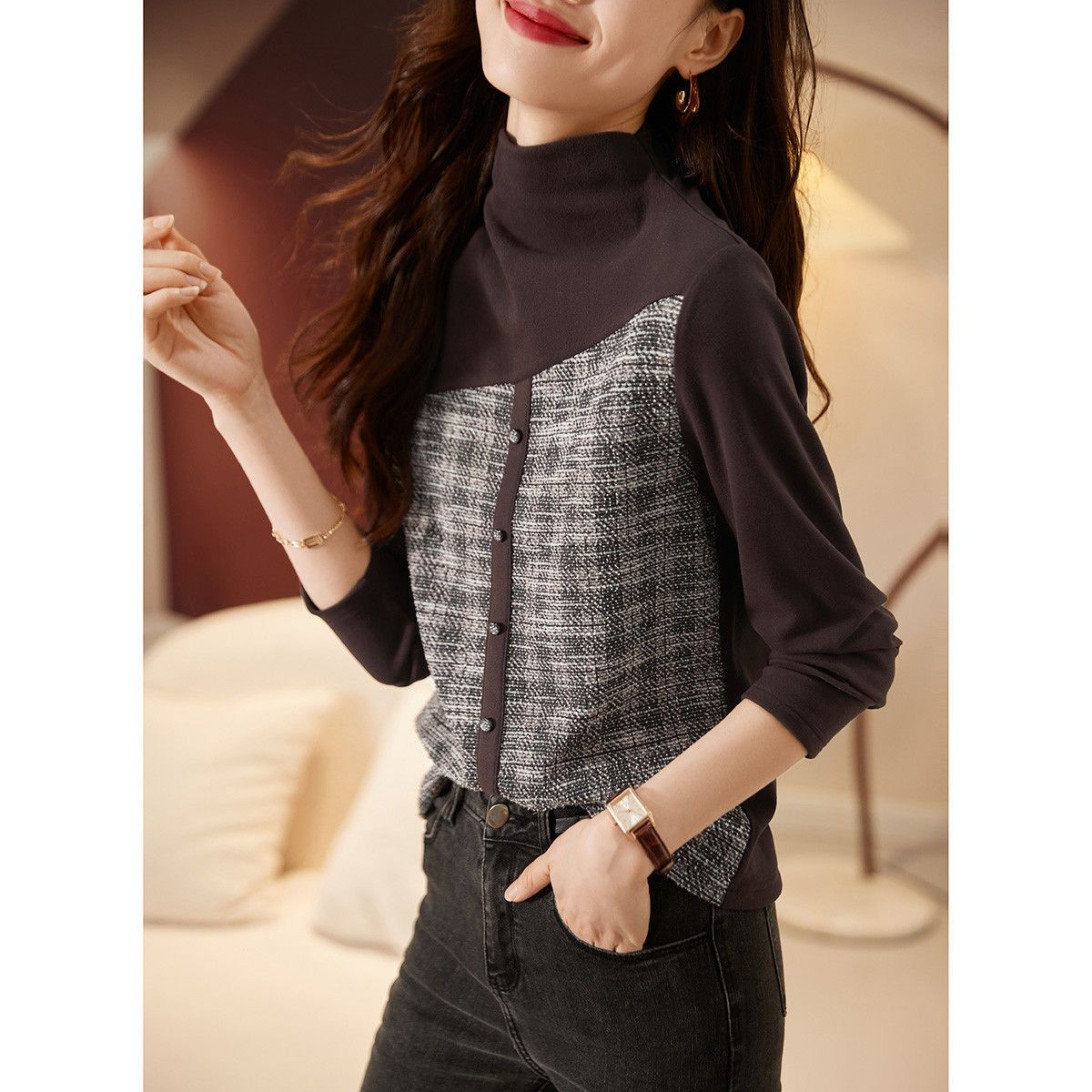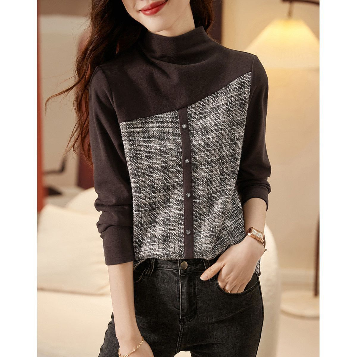 따뜻한 반 높이 칼라베이스 셔츠 긴팔 티셔츠 여성용 2024 가을 새 내복 슬리밍 꽉 끼는 세련된 옷