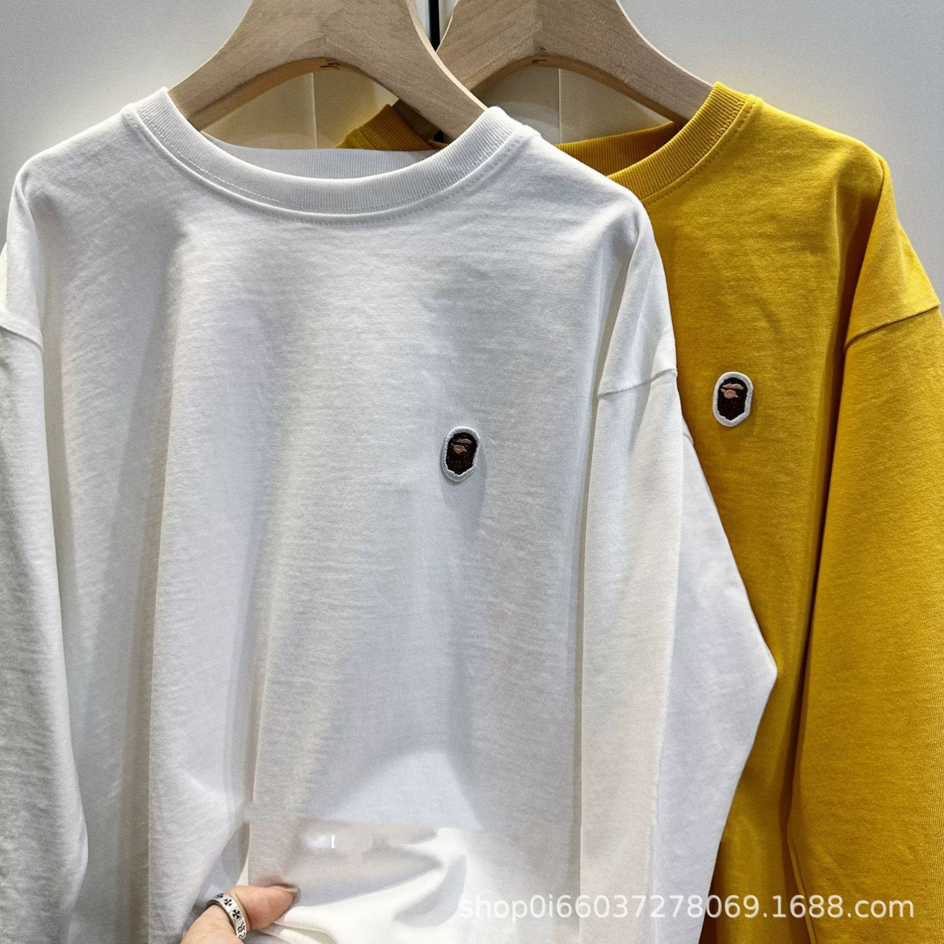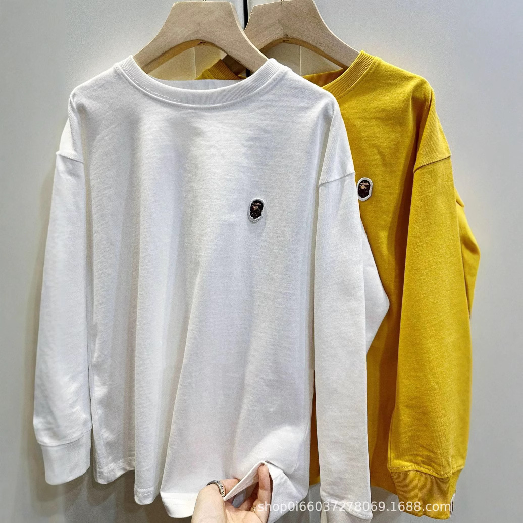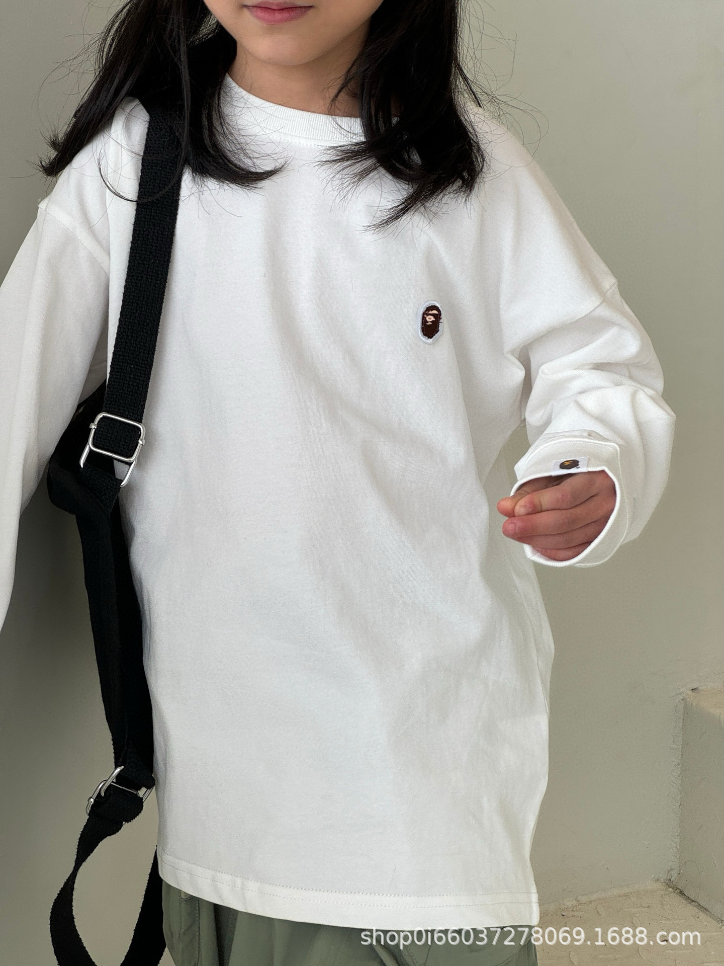 멋지고 스타일리시한 아동용 단색 긴팔 티셔츠 일본 트렌디 브랜드 남아용 라운드 넥 순면 바닥 셔츠 화이트 탑스토어 가기
