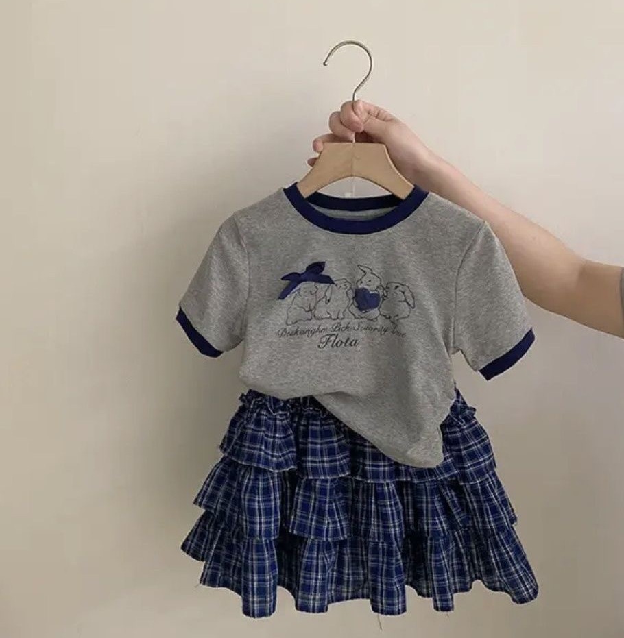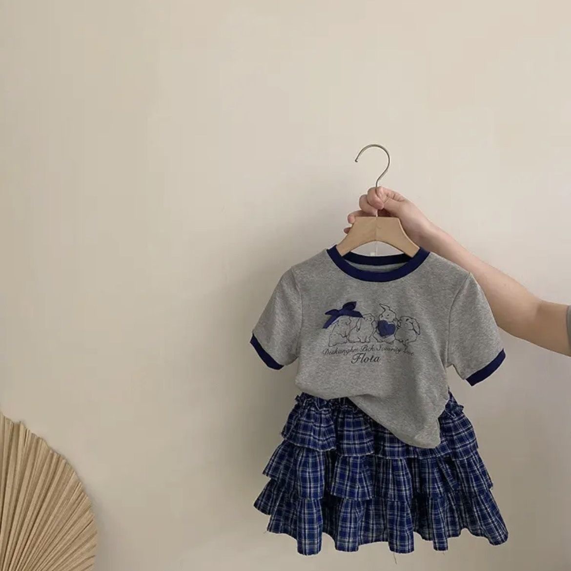 • 그레이 프린트 티셔츠 + 체크무늬 스커트
