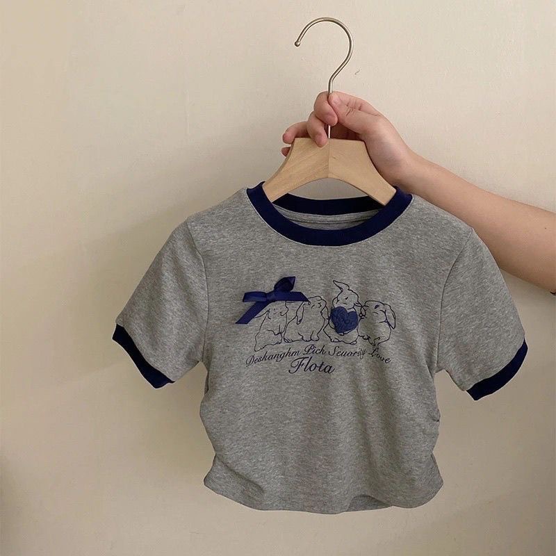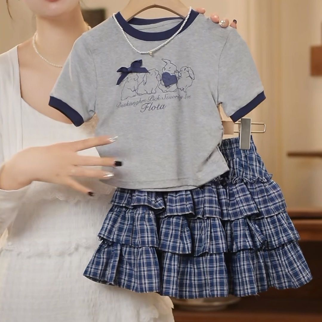 소녀 여름 새 세트 2025 중년 어린이 여름 원피스 활 인쇄 반팔 체크 케이크 스커트 투피스 세트스토어 가기