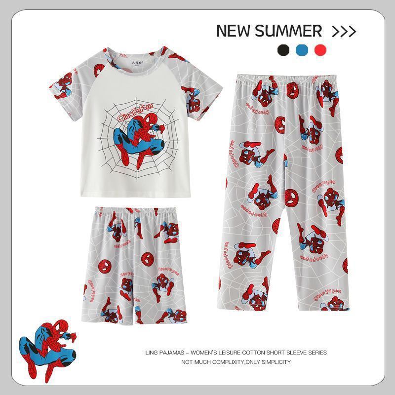 여름 어린이 잠옷 소년 짧은 소매 바지 3 조각 세트 소녀 소년 중형 및 대형 어린이 에어컨 홈 의류 도매스토어 가기
