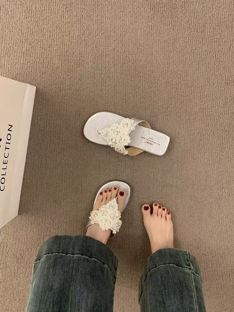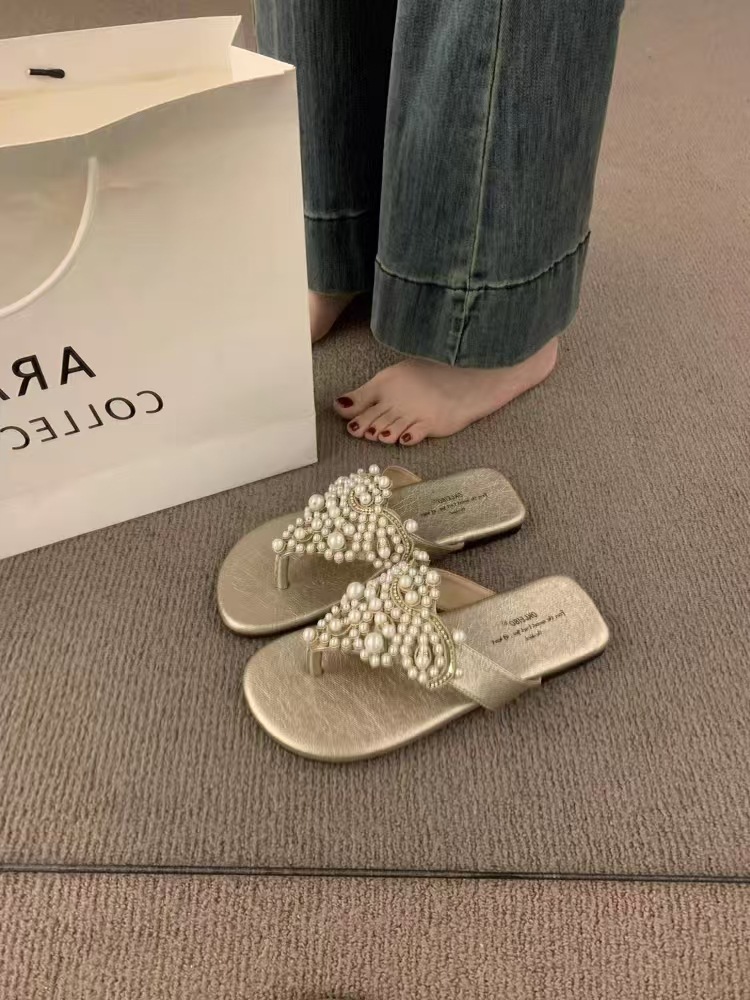 부드러운 요정 스타일 플립 플롭 여성 여름 의상 레트로 보헤미안 스타일 샌들 펄 플립 플롭 샌들