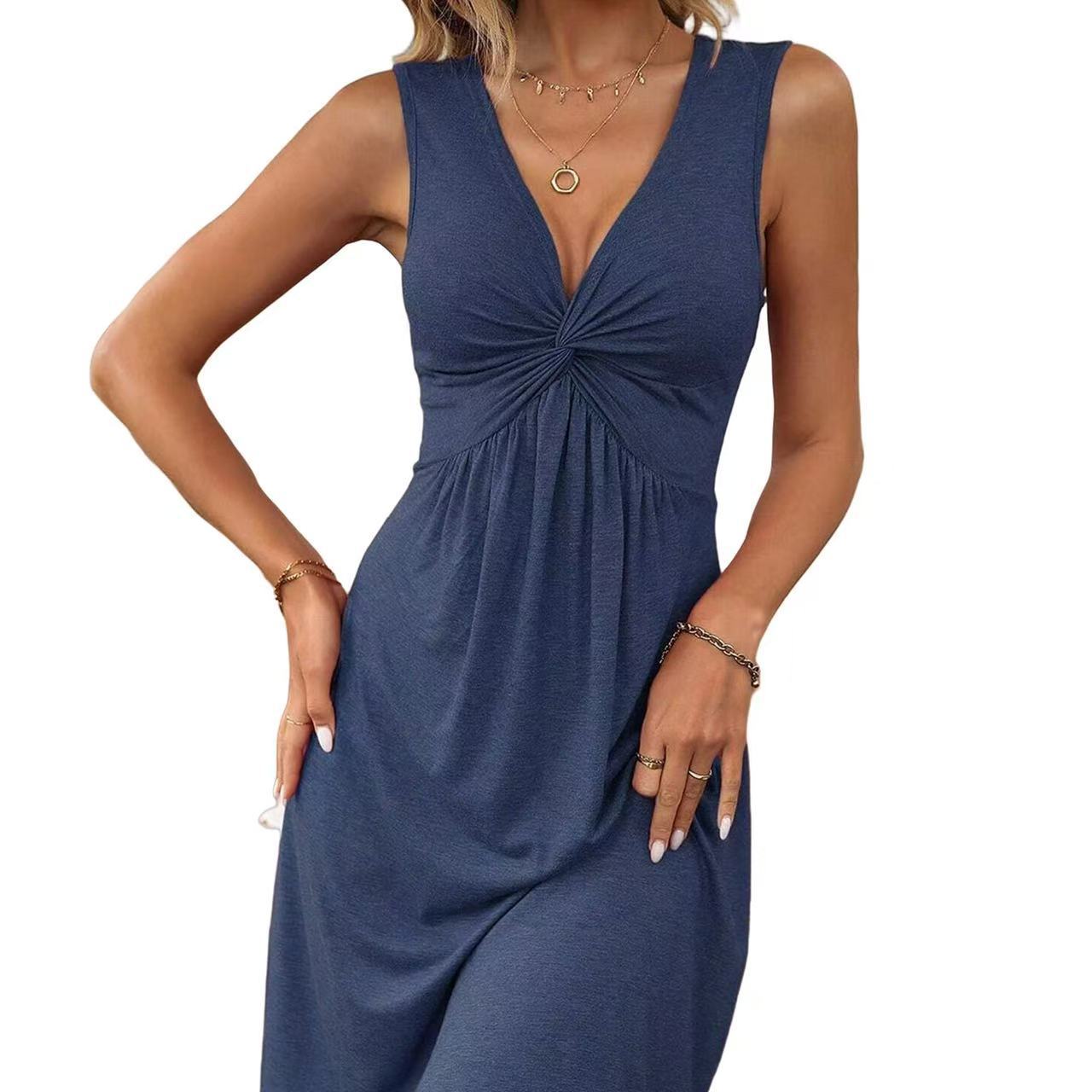 2025 유럽과 미국 국경 아마존 테무 민소매 V 넥 디자인 감각 가슴 꼬임 주름진 허리 원피스스토어 가기