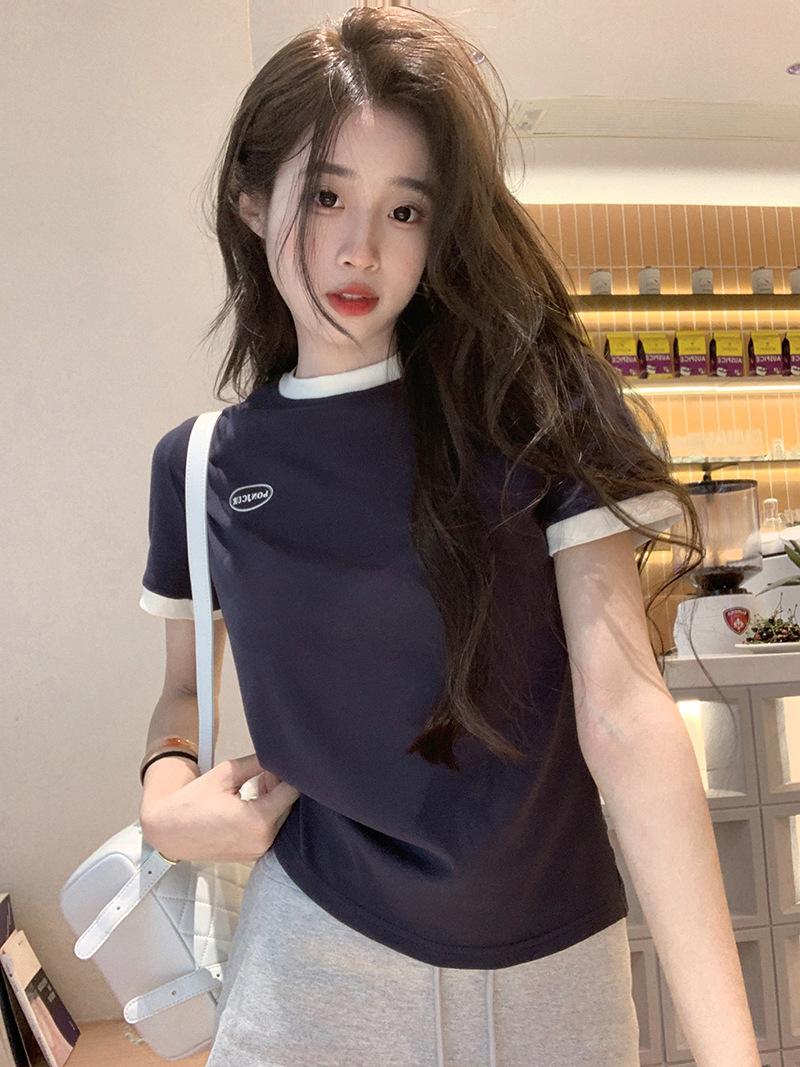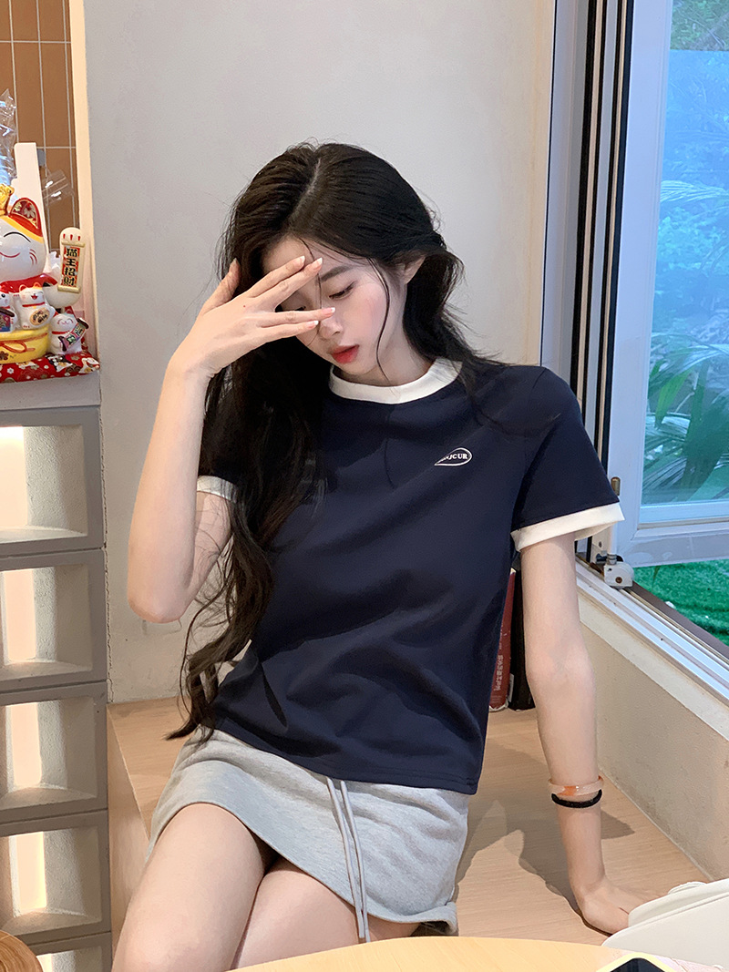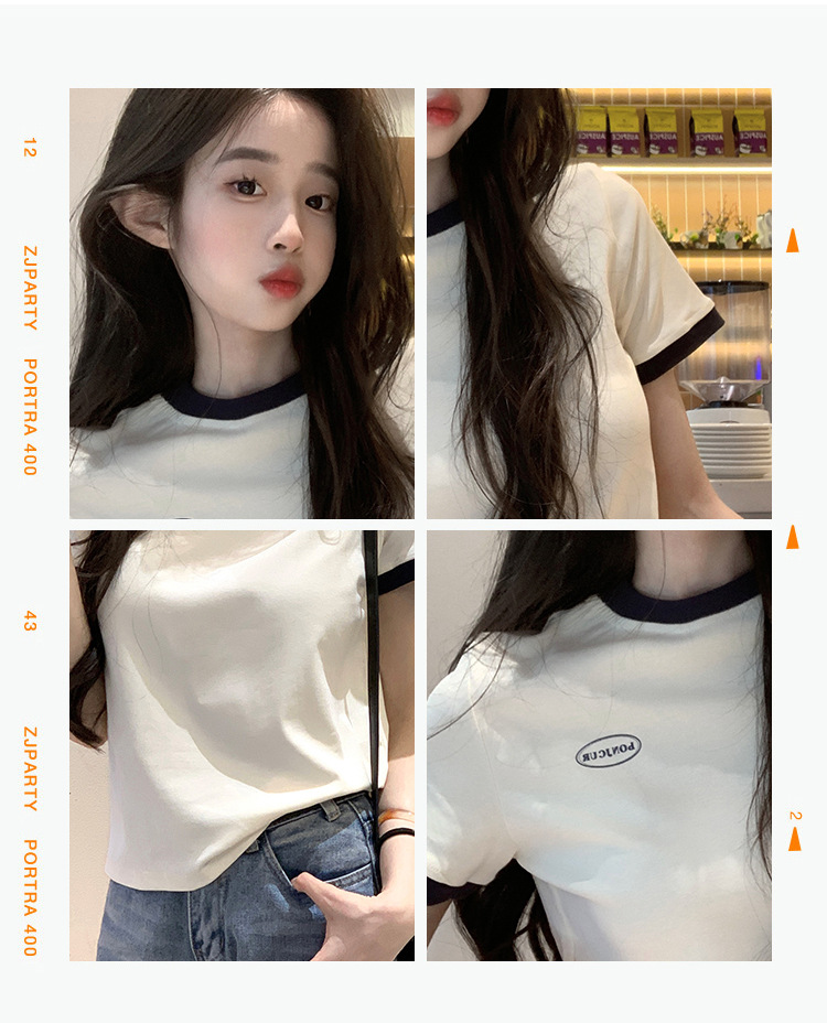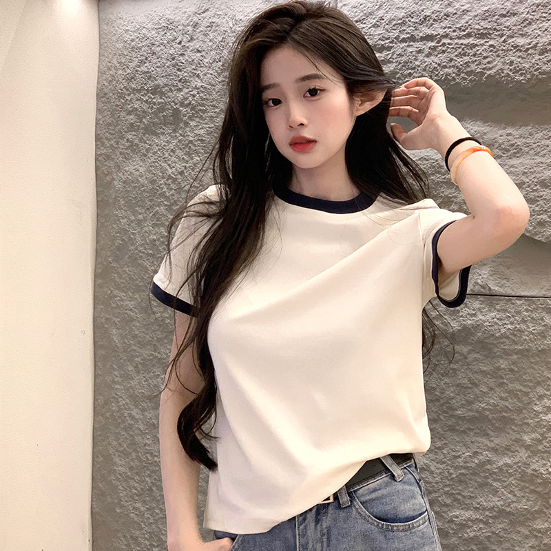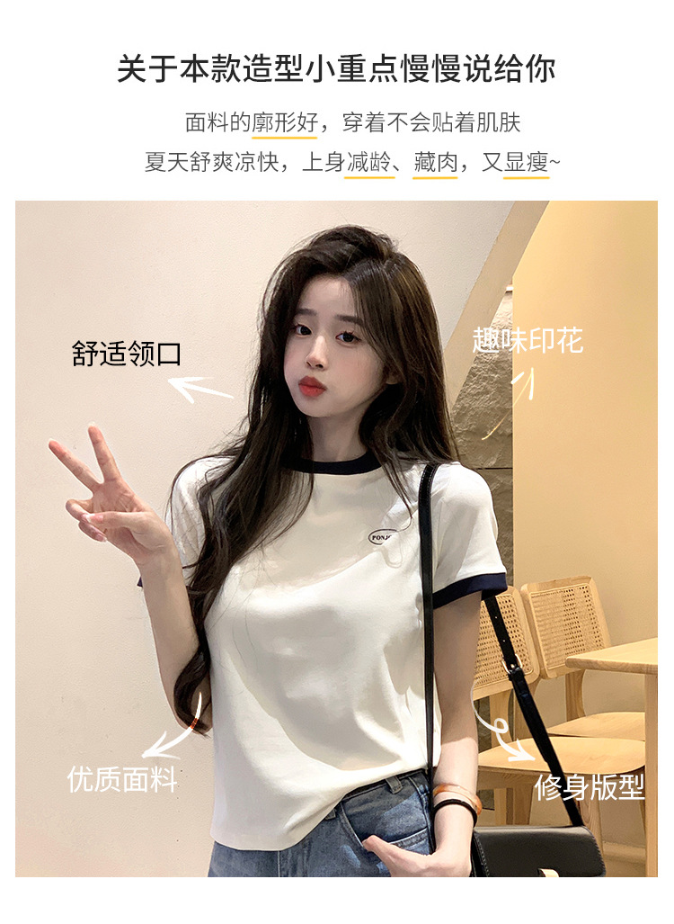 210g 헤비 코튼 반팔 티셔츠 여성 여름 2025 새로운 한국식 대비 컬러 크루 넥 인쇄 슬림 핏 쇼트 탑