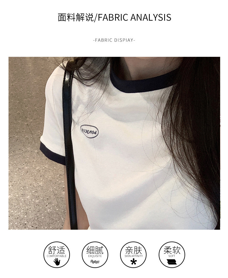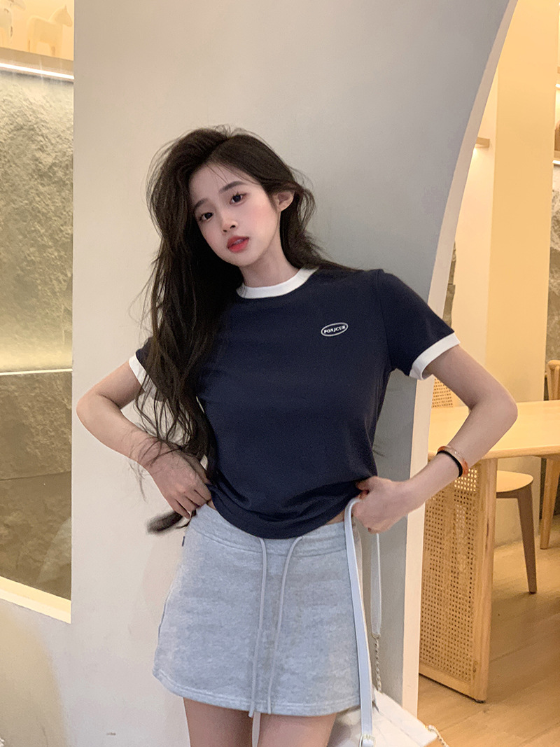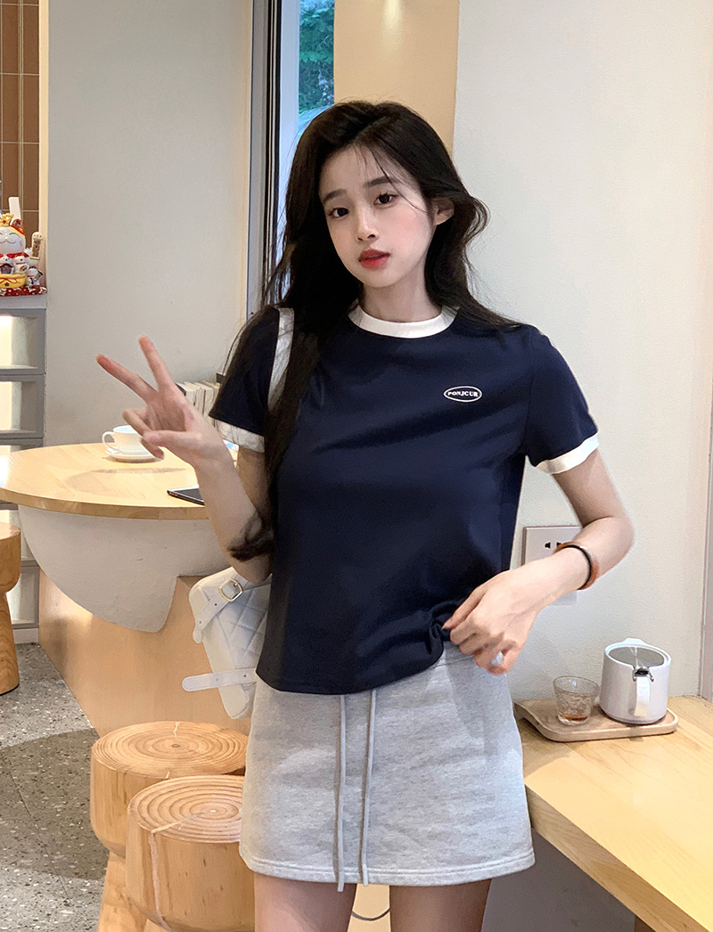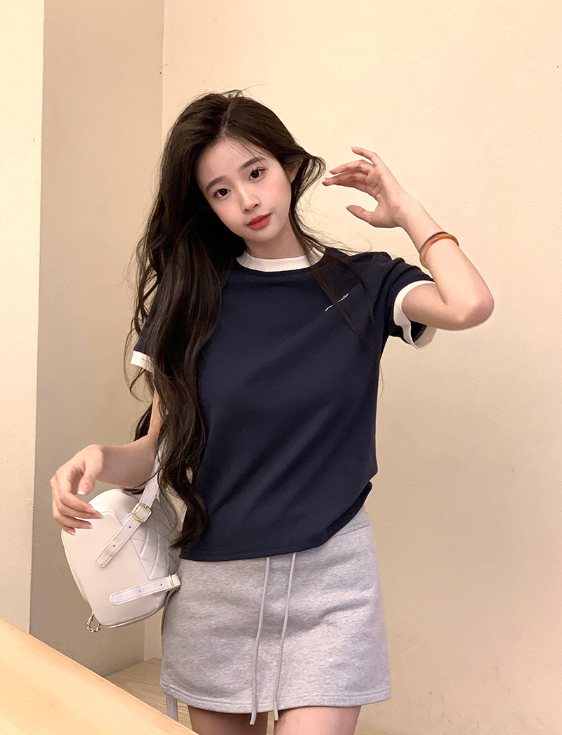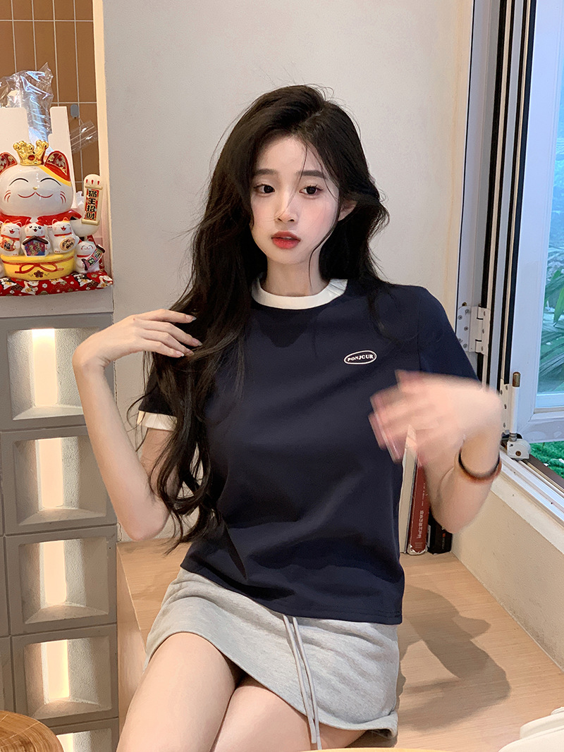 210g 헤비 코튼 반팔 티셔츠 여성 여름 2025 새로운 한국식 대비 컬러 크루 넥 인쇄 슬림 핏 쇼트 탑