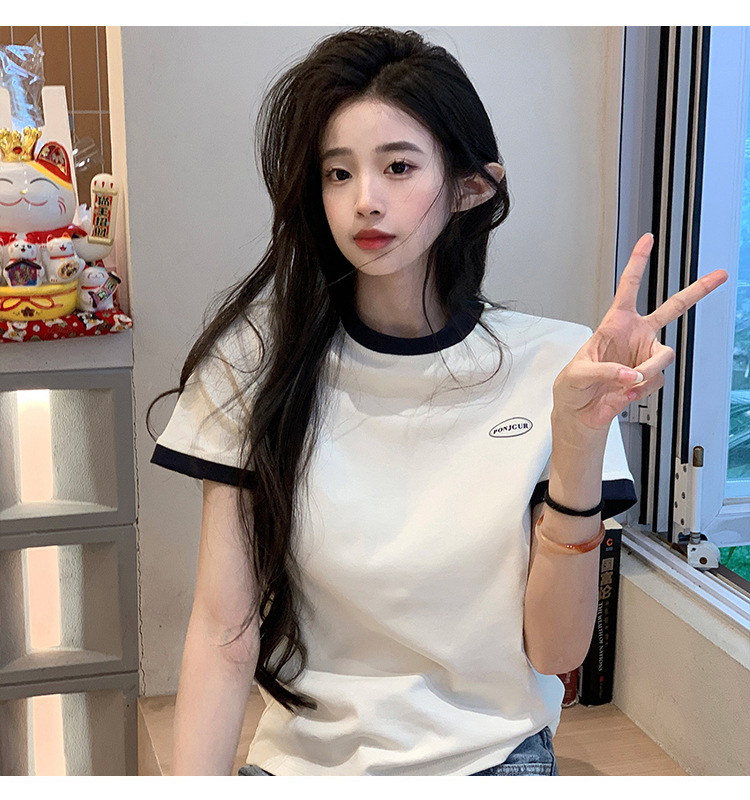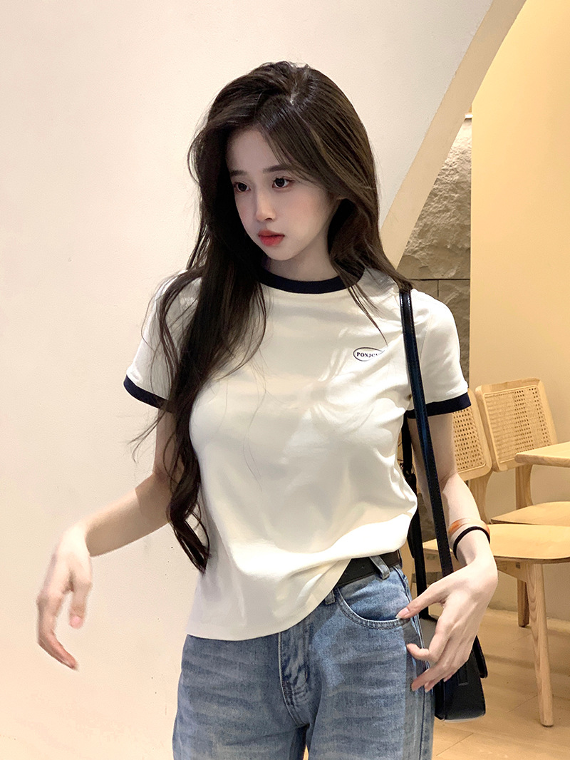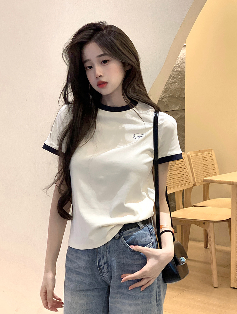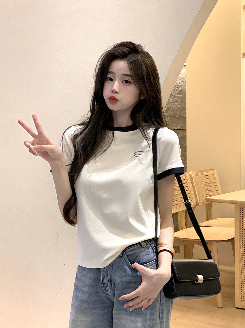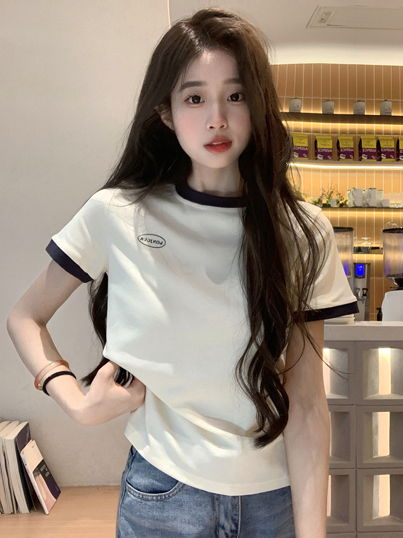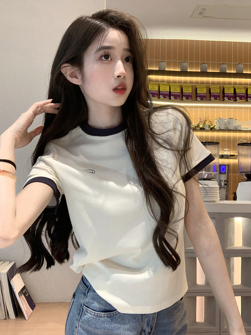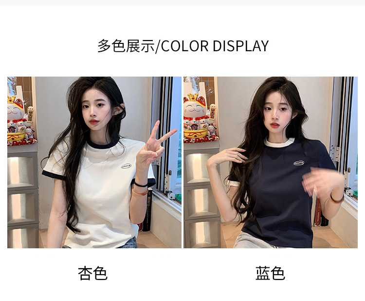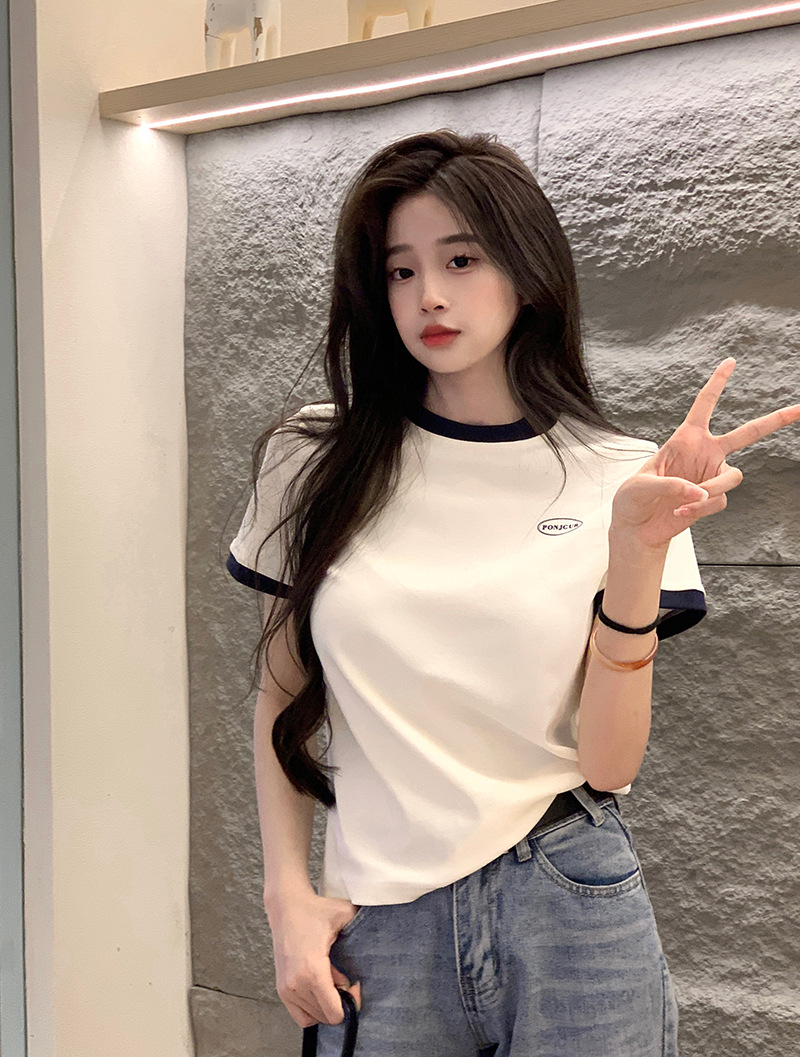 210g 헤비 코튼 반팔 티셔츠 여성 여름 2025 새로운 한국식 대비 컬러 크루 넥 인쇄 슬림 핏 쇼트 탑스토어 가기