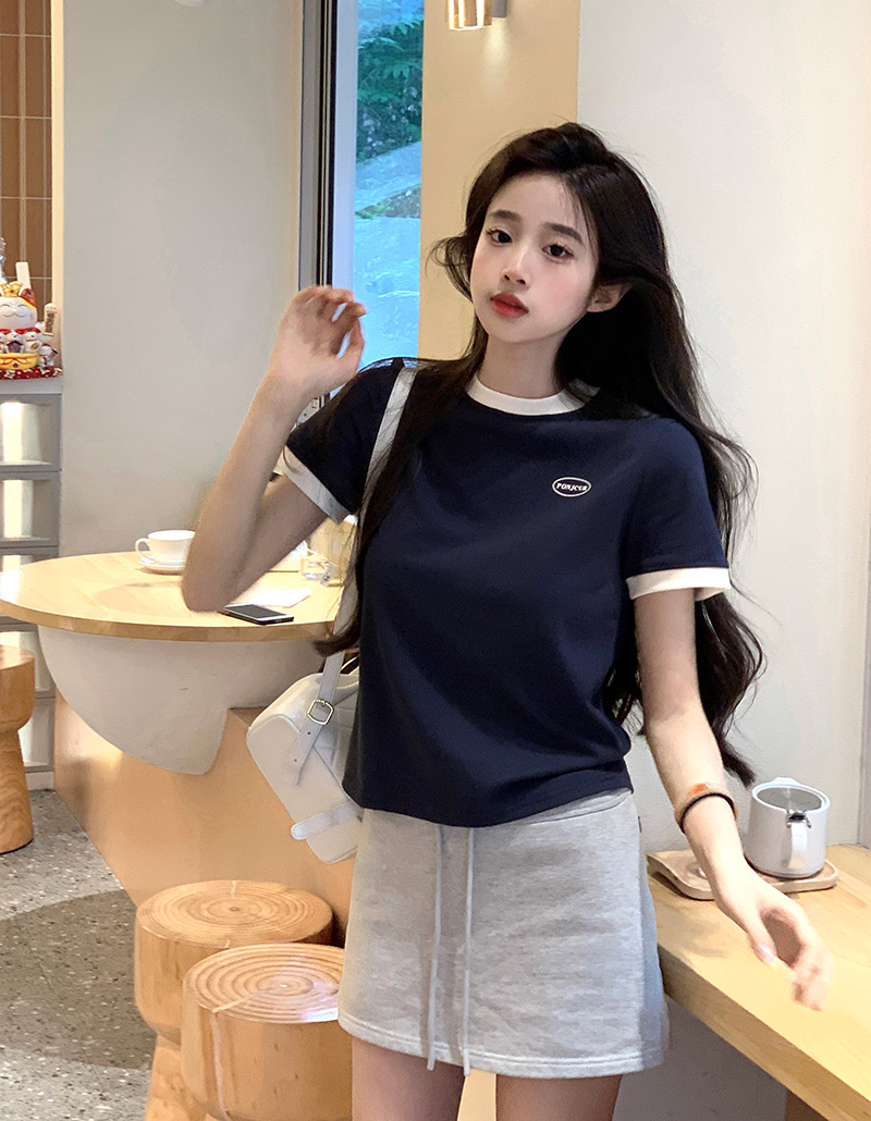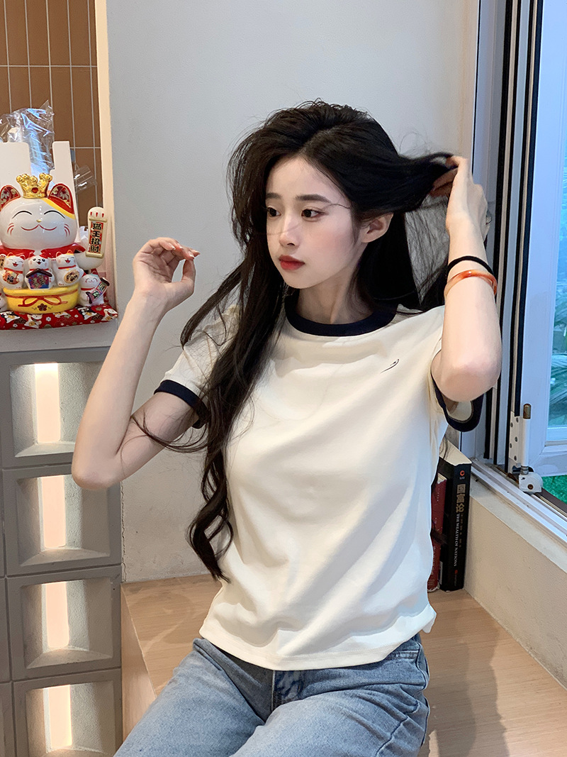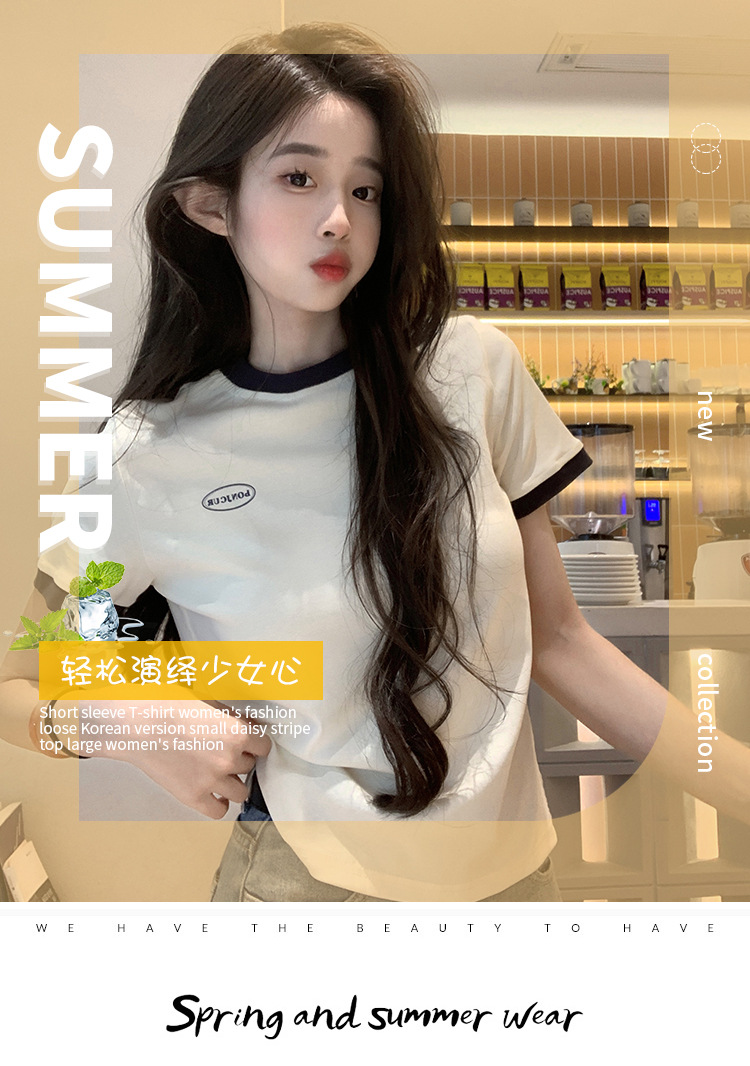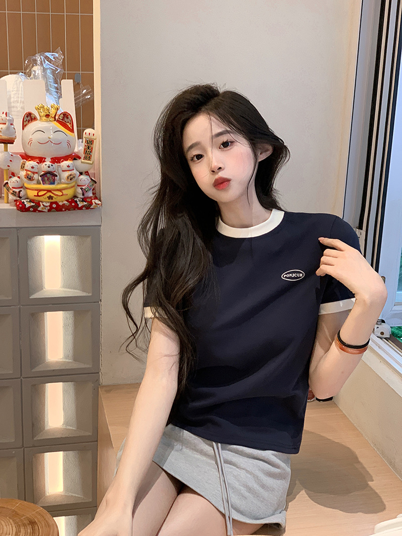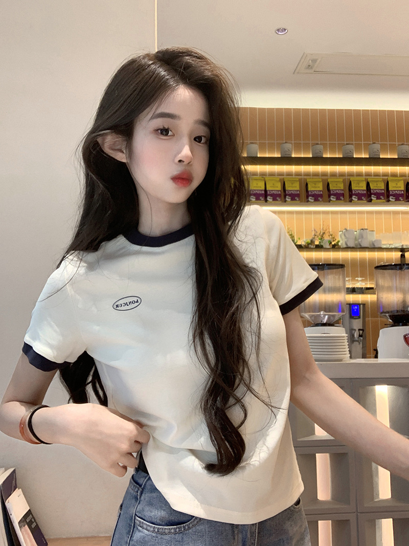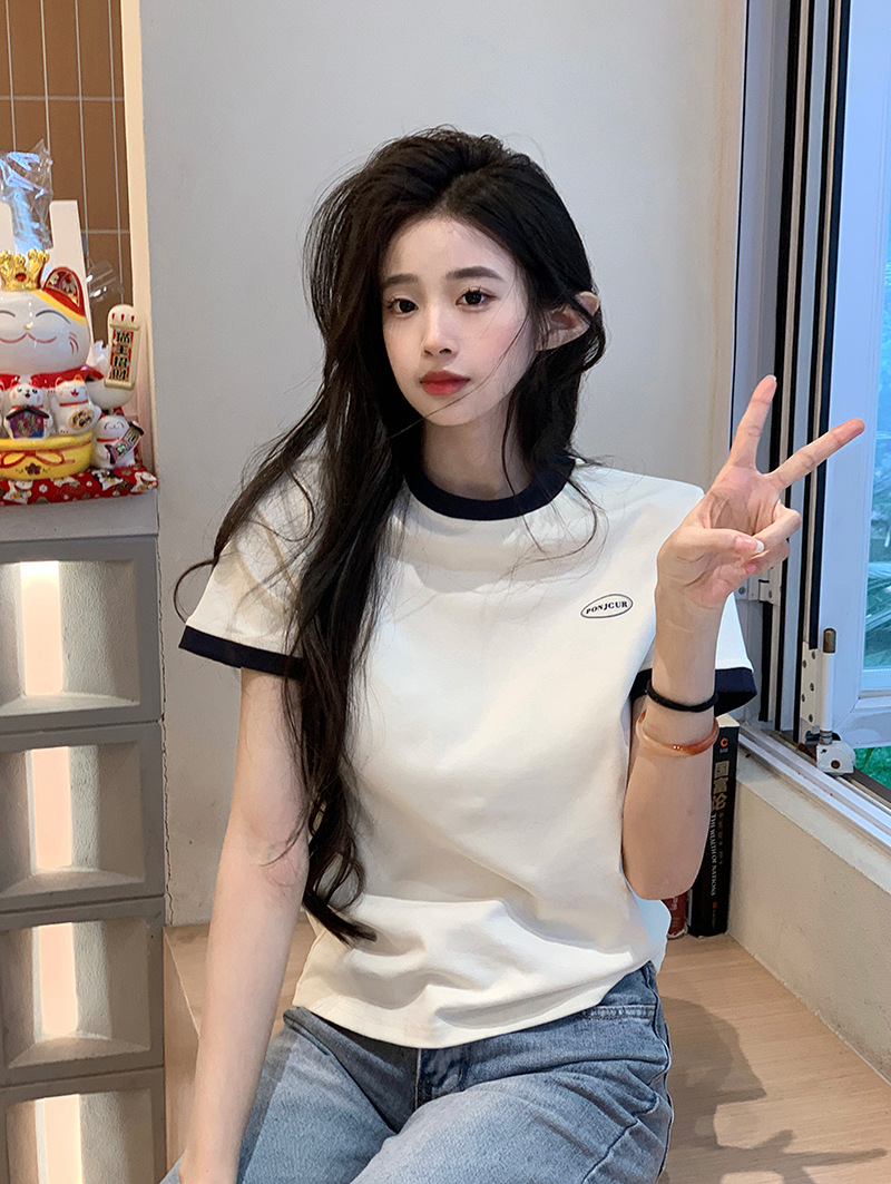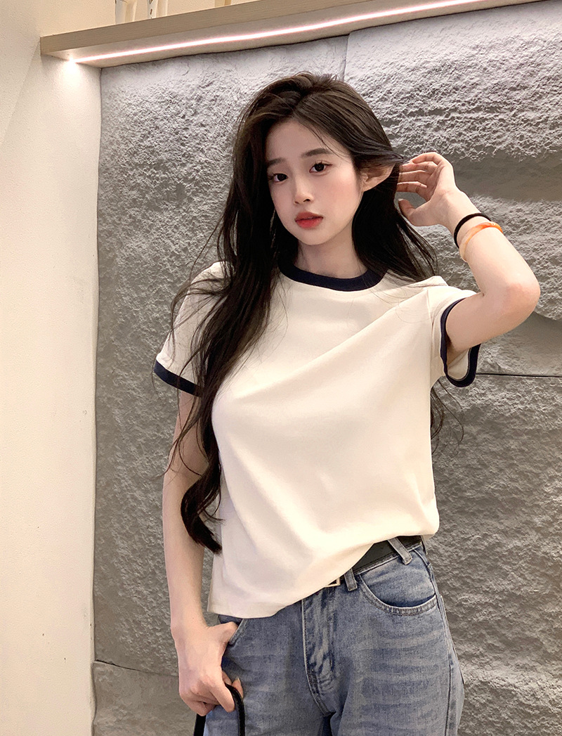 210g 헤비 코튼 반팔 티셔츠 여성 여름 2025 새로운 한국식 대비 컬러 크루 넥 인쇄 슬림 핏 쇼트 탑스토어 가기