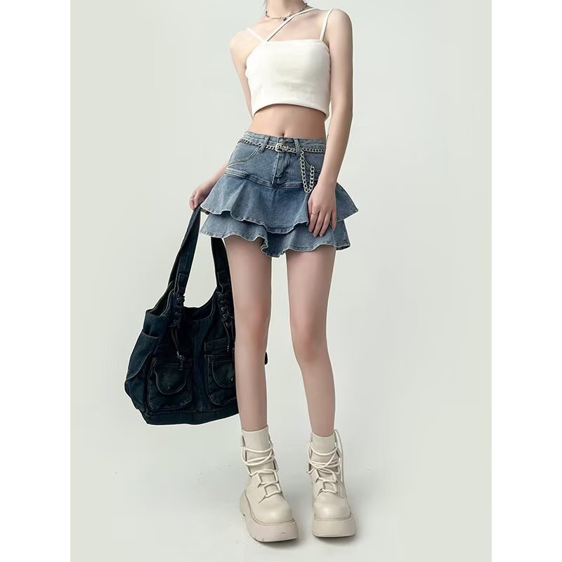 러플 데님 짧은 치마 여성 여름 높은 허리 케이크 스커트 슬리밍 엉덩이 A 형 스파이스 소녀의 짧은 피쉬 테일 스커트