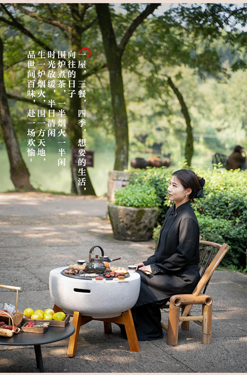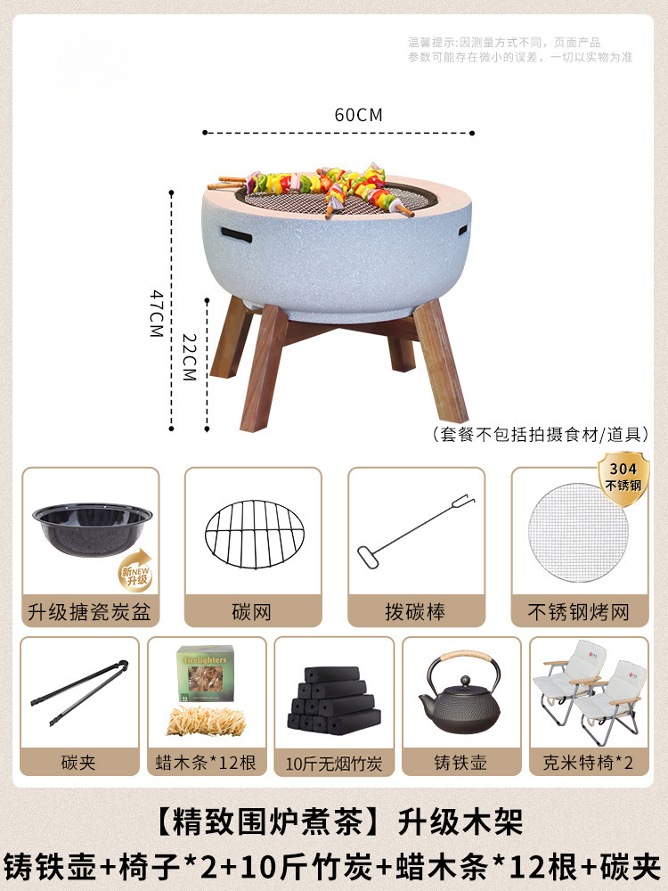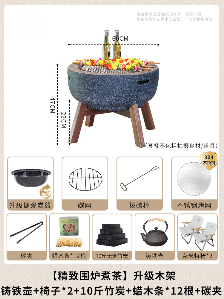 • [난로 주변의 절묘한 차 만들기] 업그레이드된 나무 프레임 + 주철 주전자 + 의자*2 + 대나무 숯 5kg개 + 왁스 나무