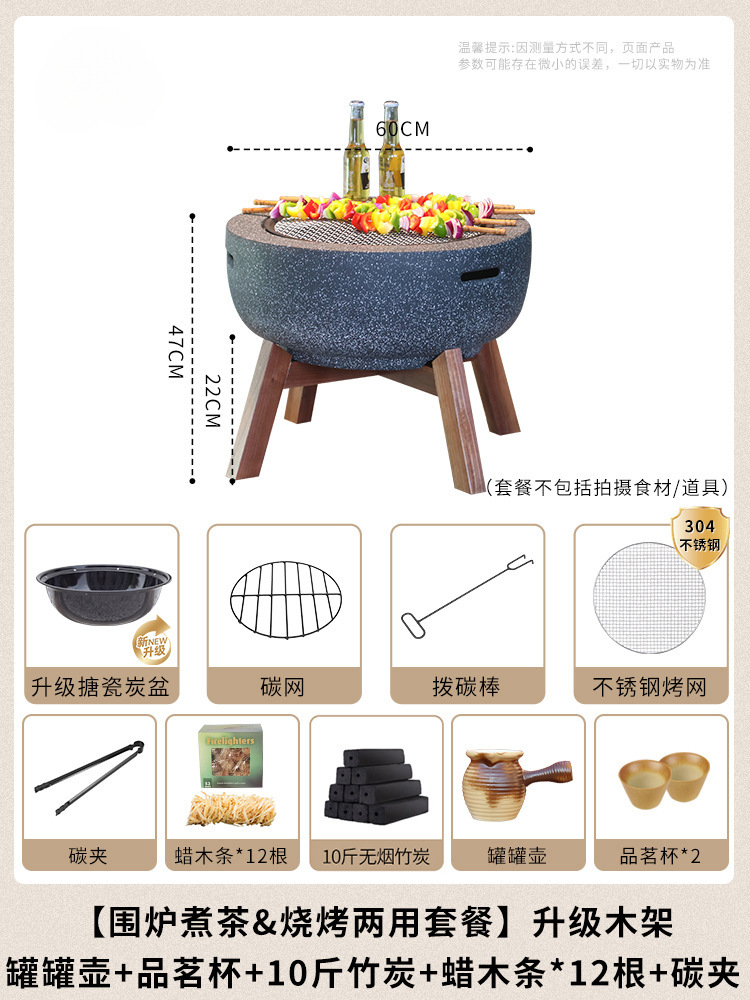 • [새로운 어두운 색 난로에서 차 만들기 & 바비큐 이중 목적 패키지] + 업그레이드된 나무 프레임 + 대나무 5kg개