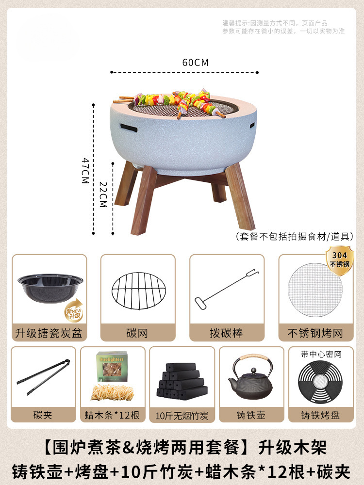 • [난로 옆 차와 바비큐 겸용 정식] 업그레이드된 나무틀 + 주철 주전자 + 주철판 + 10