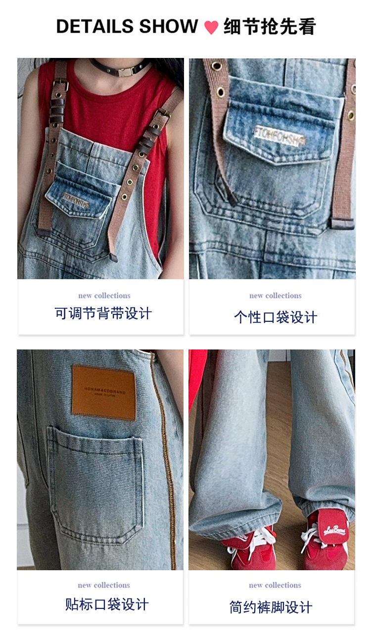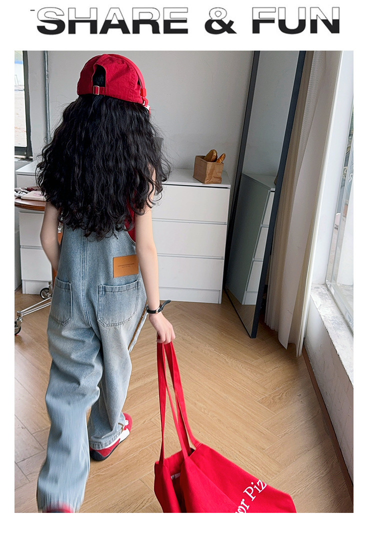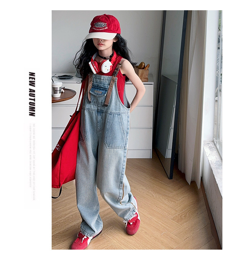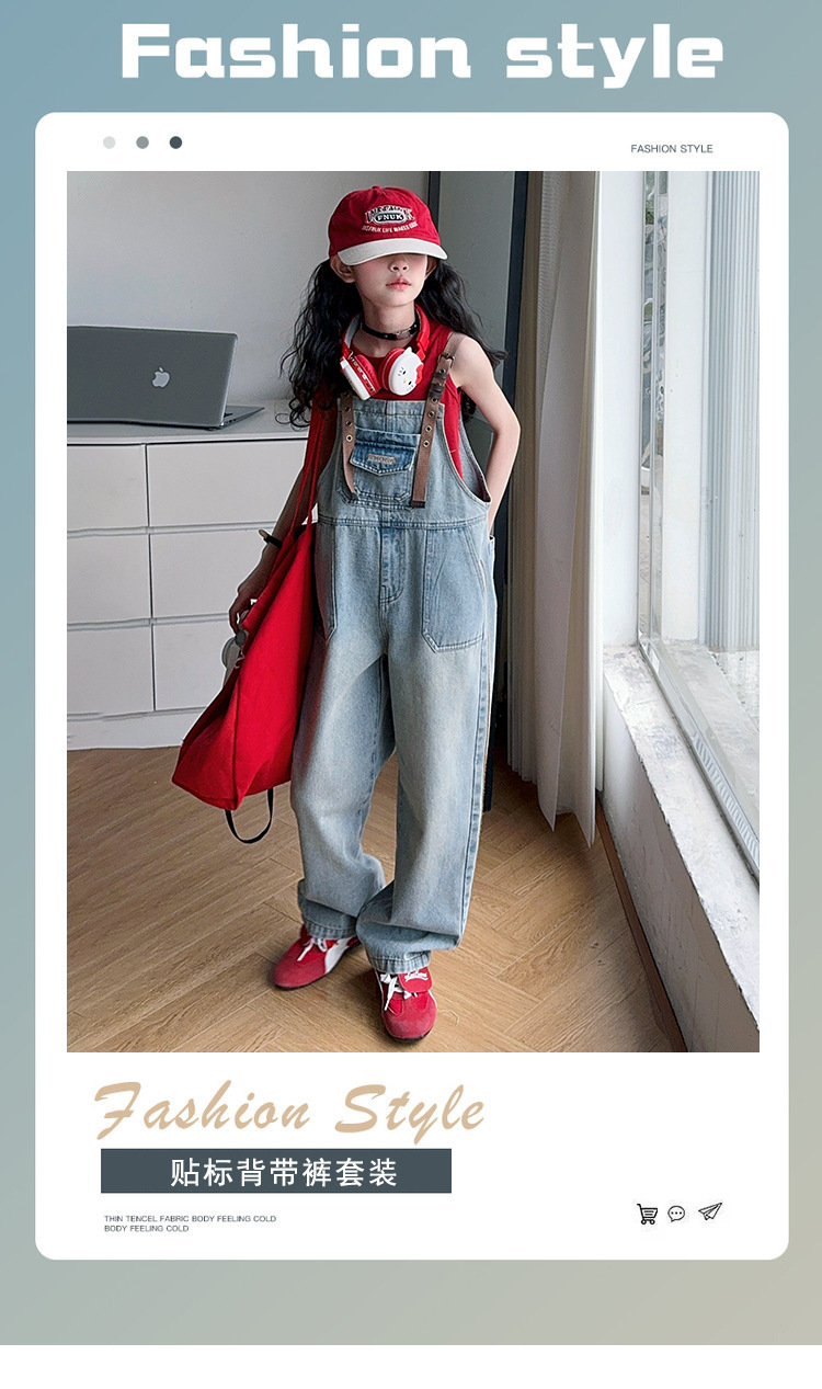 소녀 아메리칸 스타일 빈티지 데님 스트랩 팬츠 여름 얇은 중형 및 대형 어린이 스트레이트 툴링 와이드 레그 바지 트렌디 슬링 바지스토어 가기