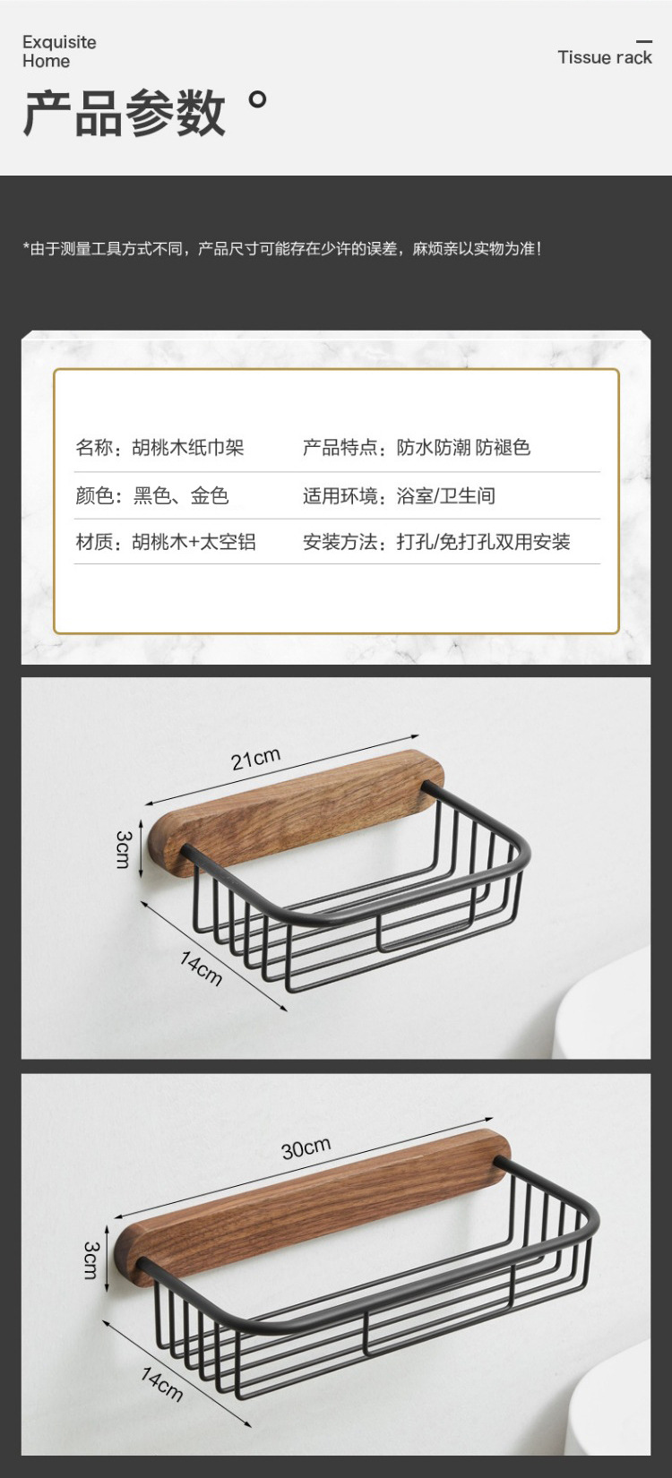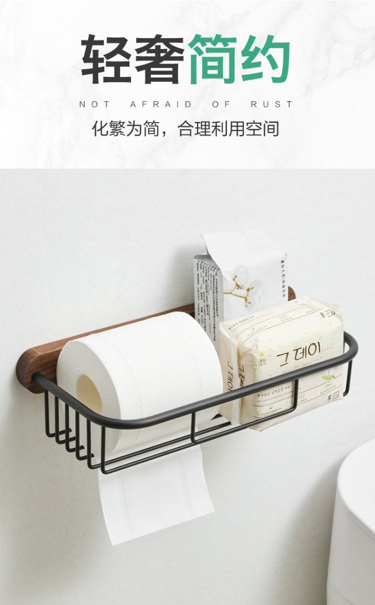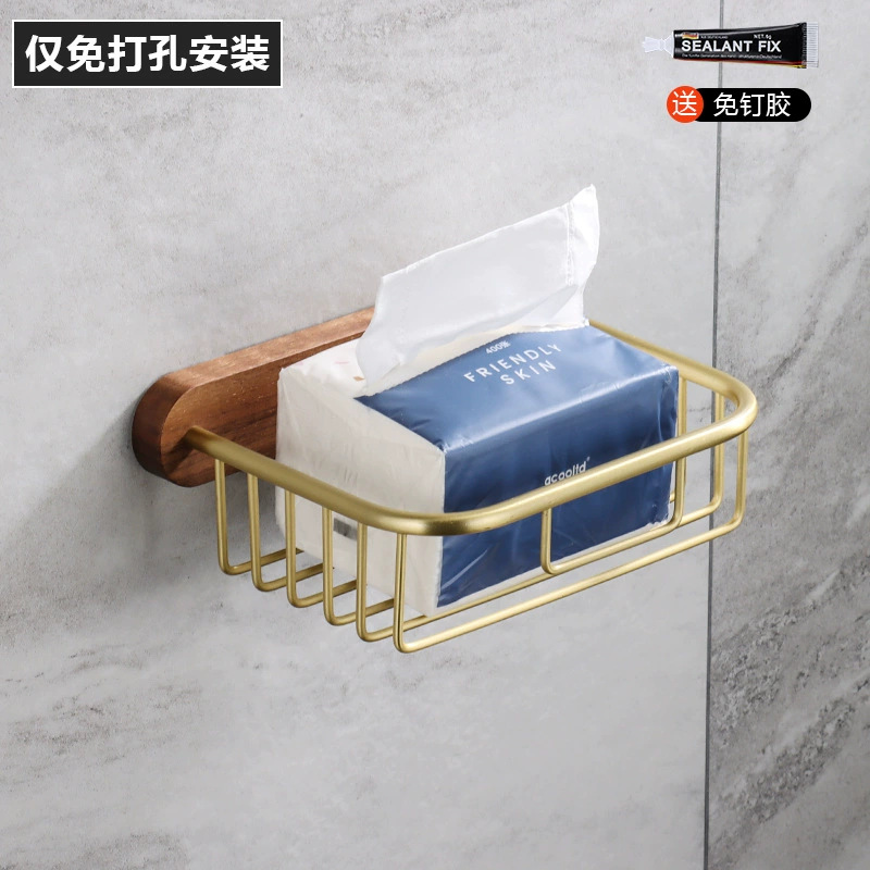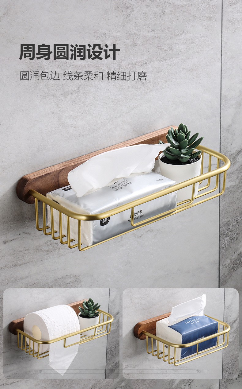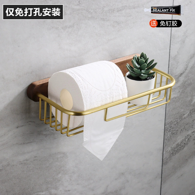 가벼운 고급 단단한 나무 수납 선반, 구멍이 없는 욕실 티슈 홀더, 종이 타월 선반, 호두 브러시드 골드 수납 선반스토어 가기