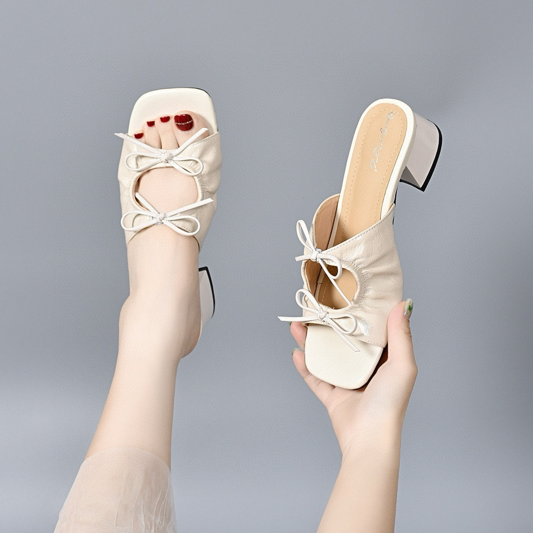 슬리퍼 여성 2025 년 여름 한국식 광장 발가락 오픈 발가락 보우 샌들 심야 스타일 두꺼운 힐 하이힐 여성용 슬리퍼