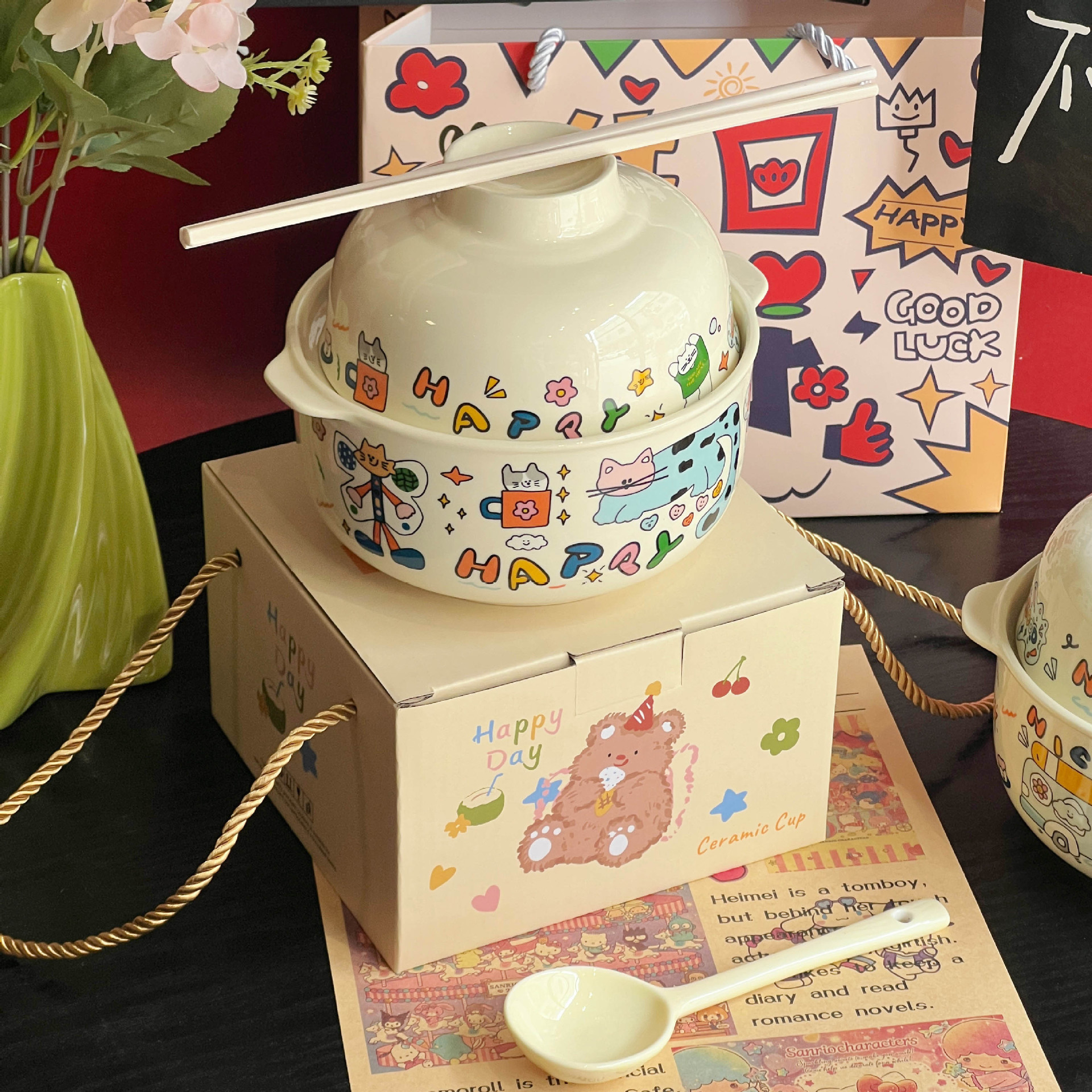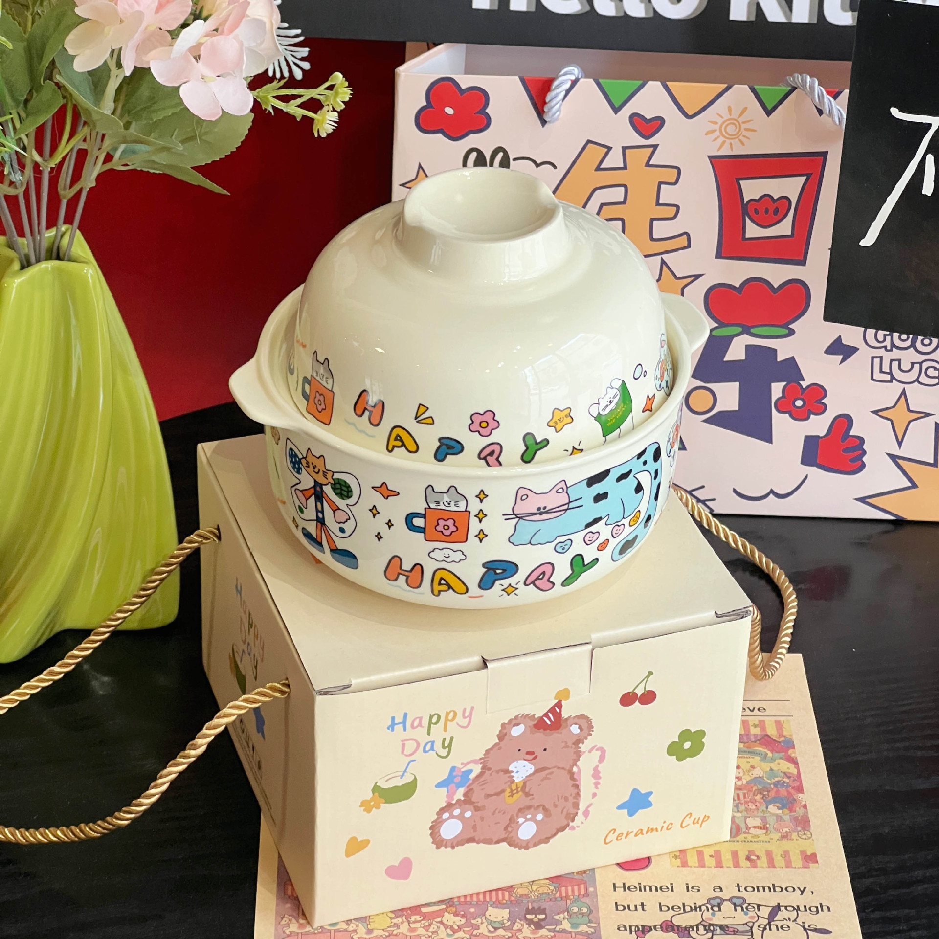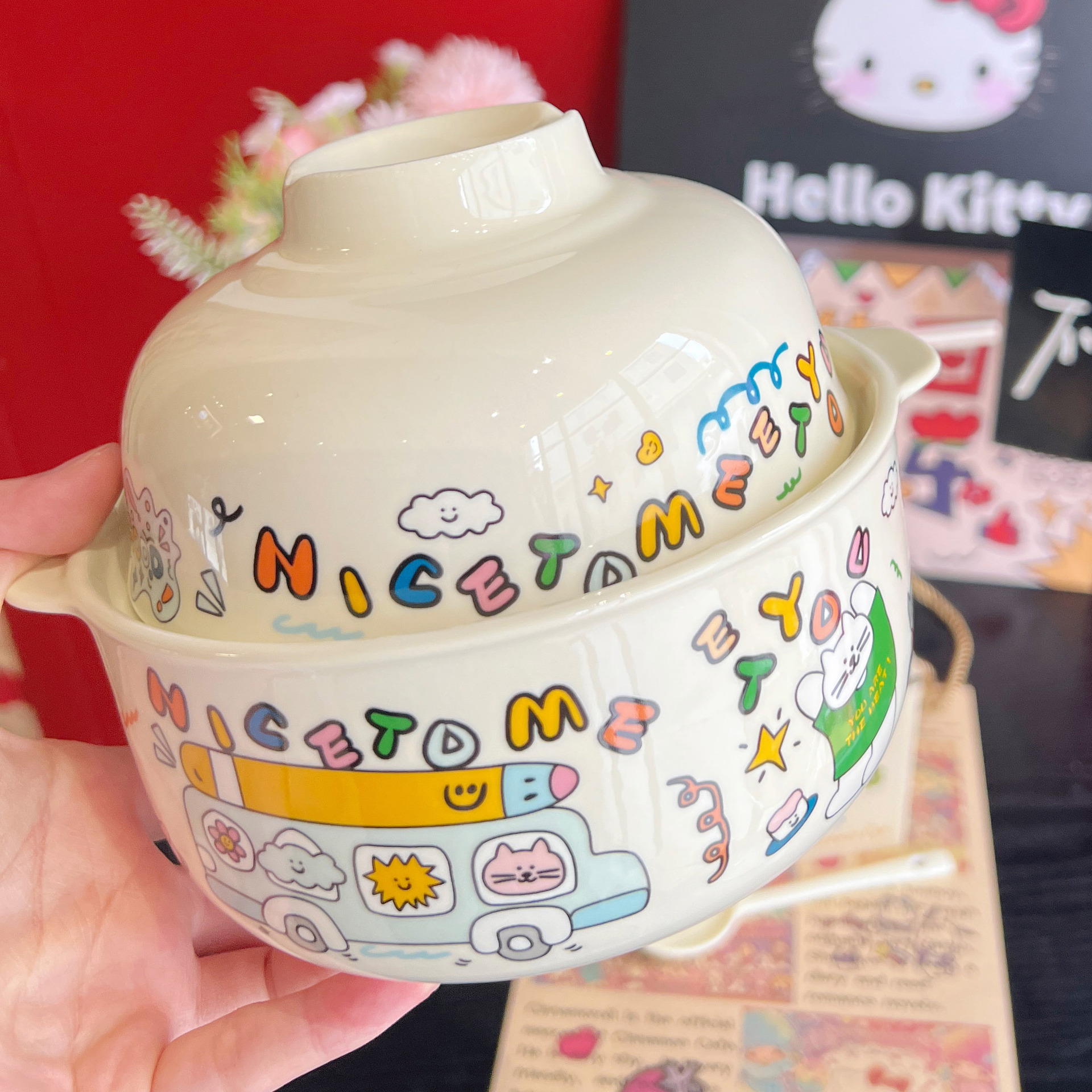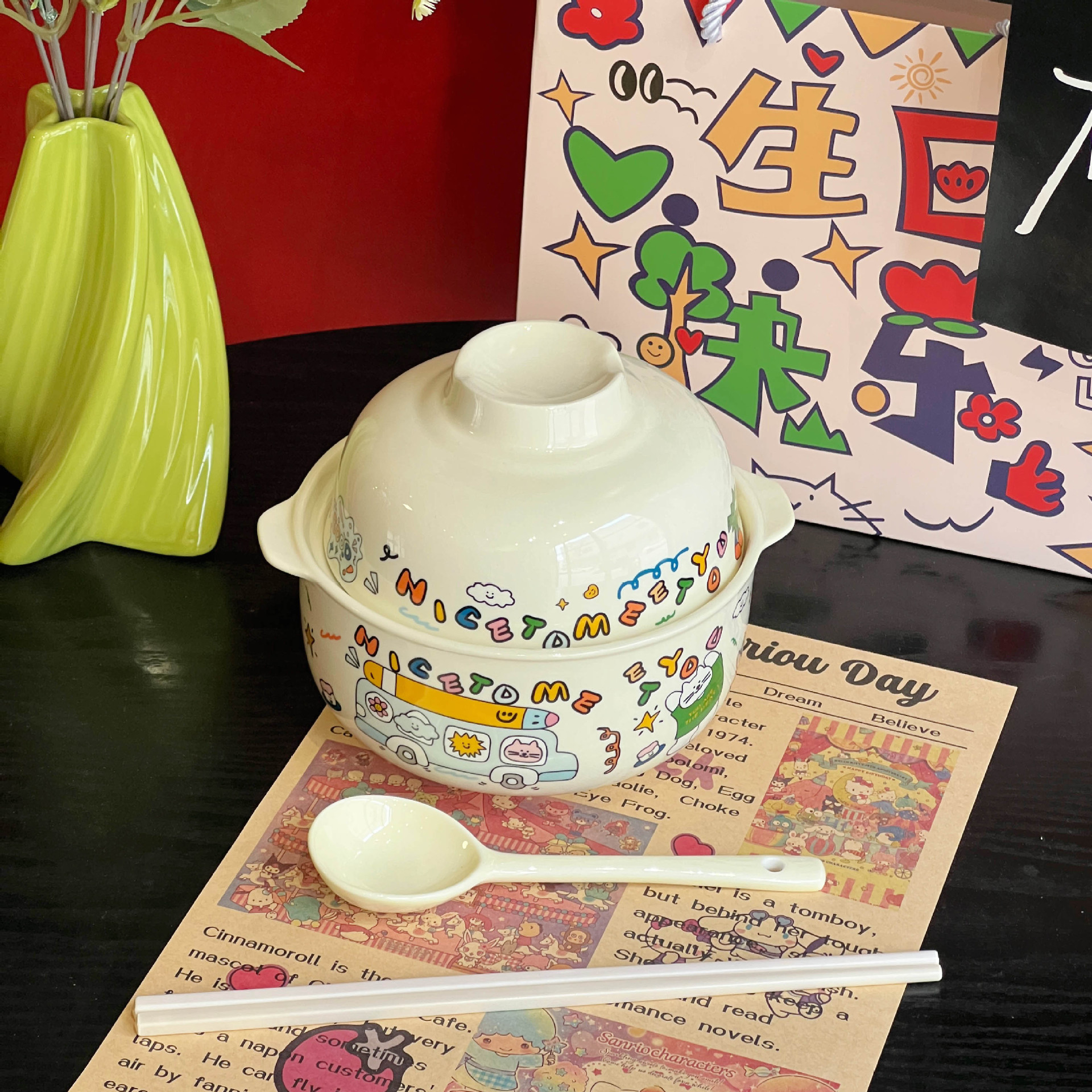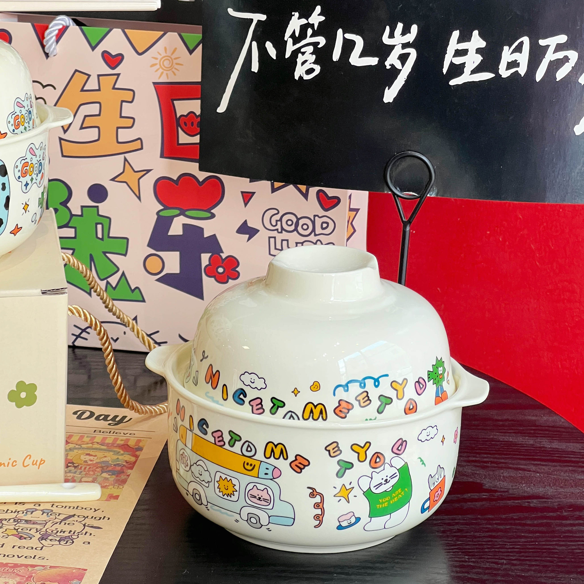 기숙사용 뚜껑이 있는 그래피티 세라믹 인스턴트 국수 그릇, 학생용 편리한 양쪽 귀 국수 그릇, 전자레인지 밥그릇, 매점 화상 방지스토어 가기