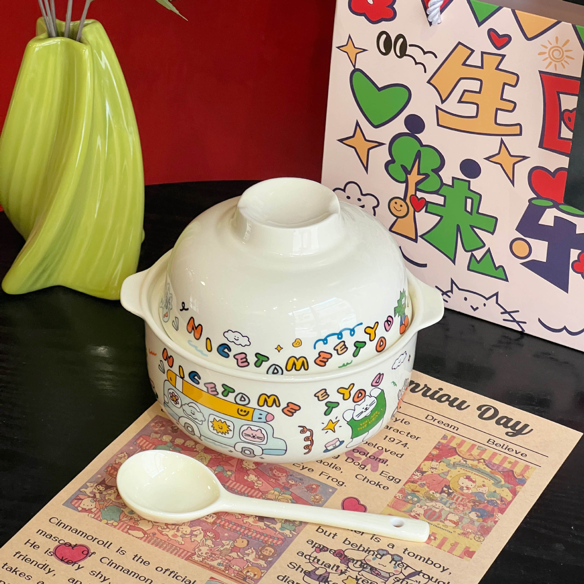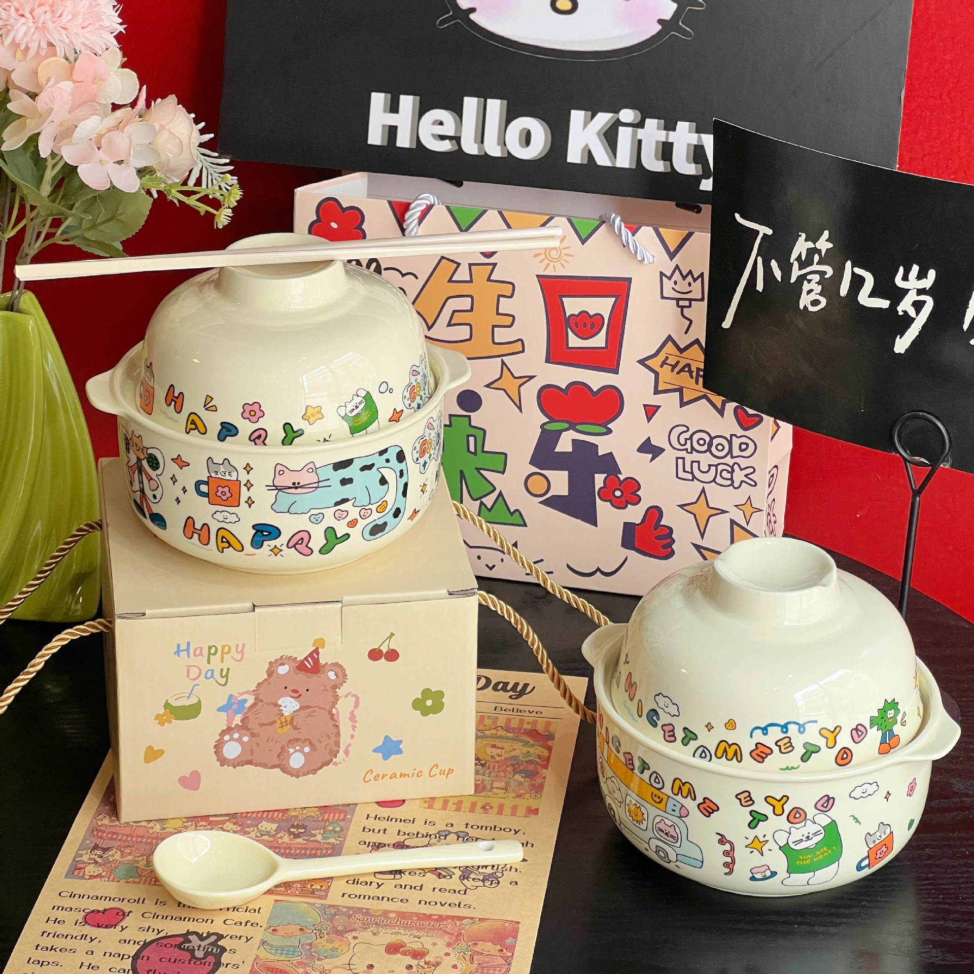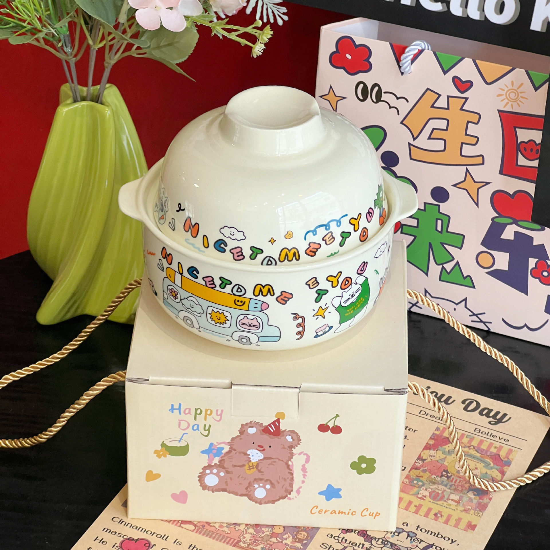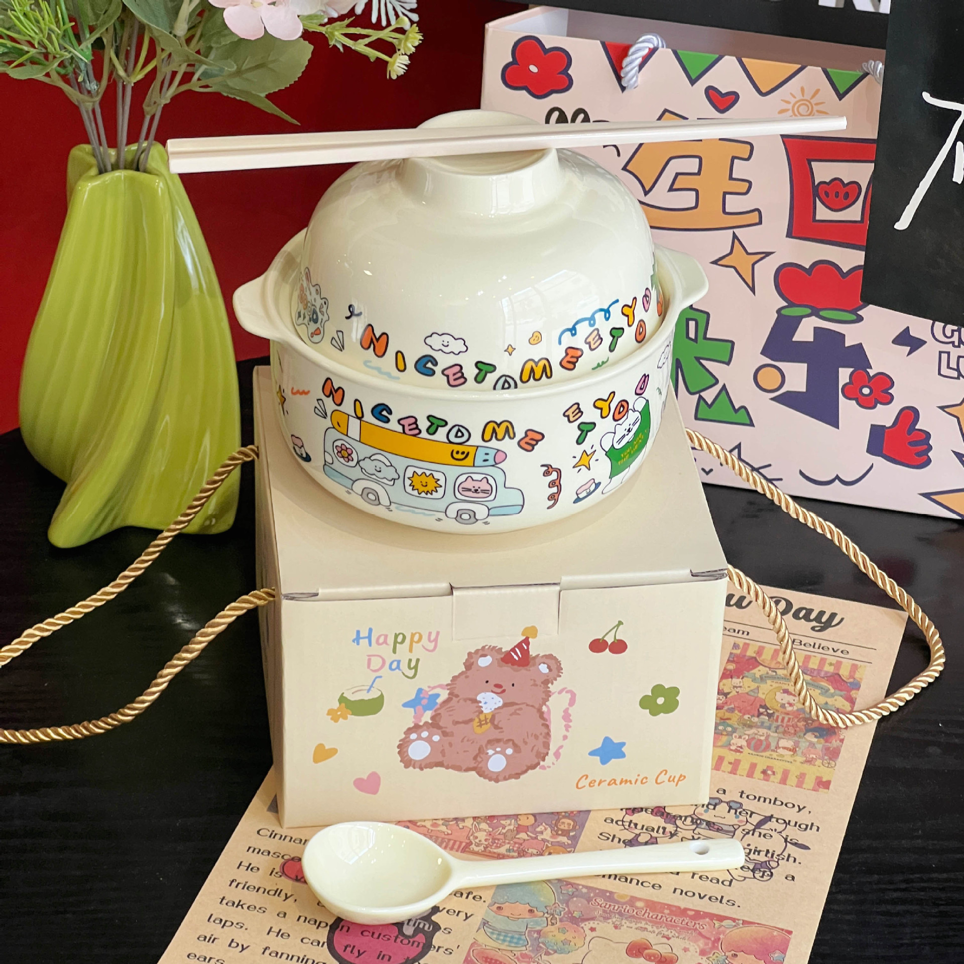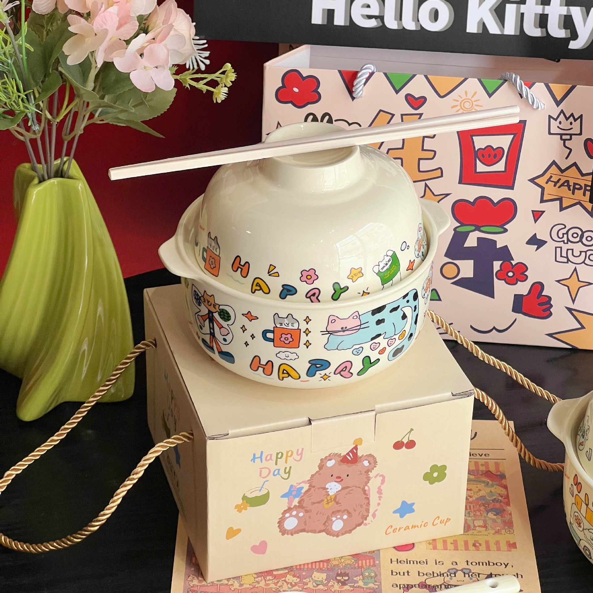 기숙사용 뚜껑이 있는 그래피티 세라믹 인스턴트 국수 그릇, 학생용 편리한 양쪽 귀 국수 그릇, 전자레인지 밥그릇, 매점 화상 방지스토어 가기