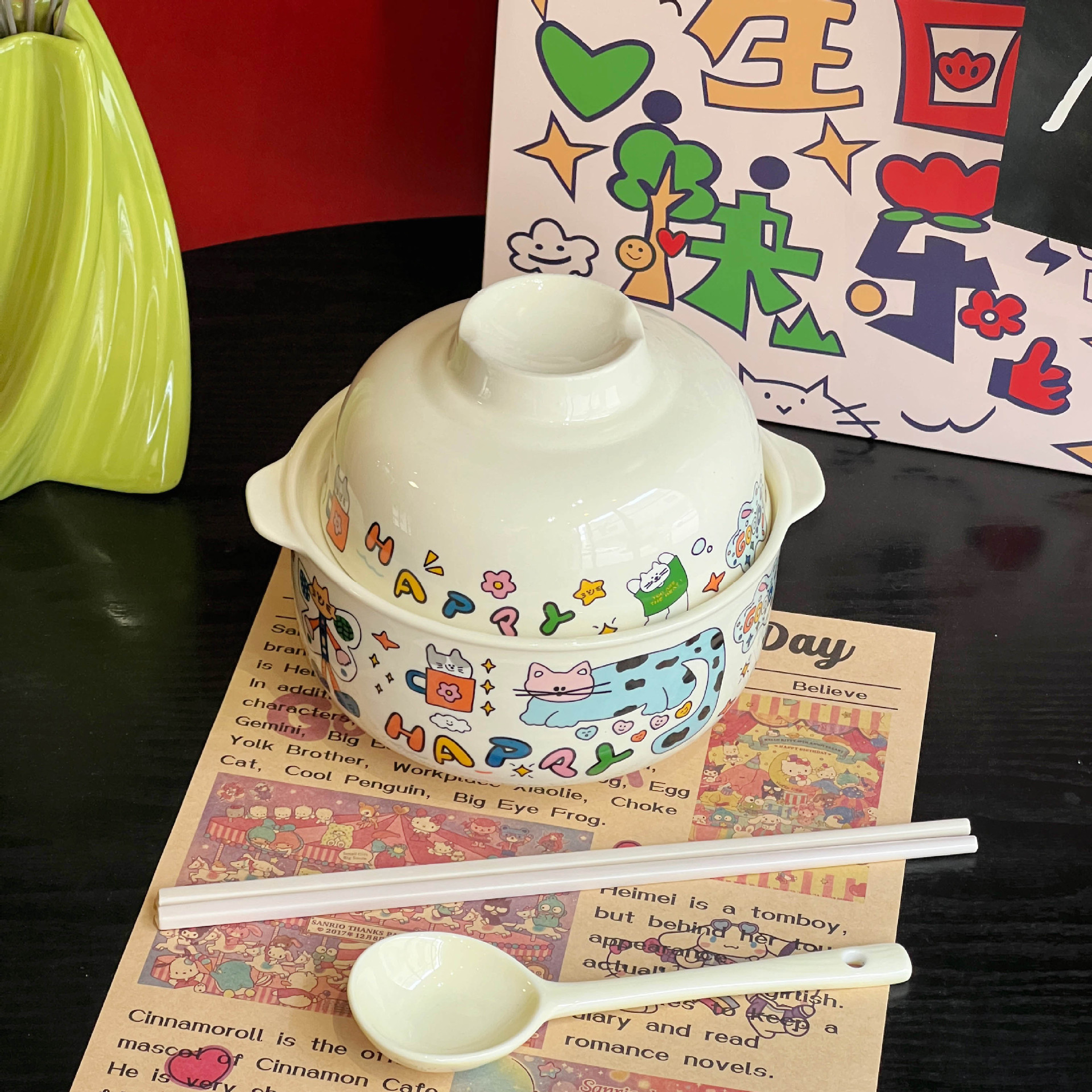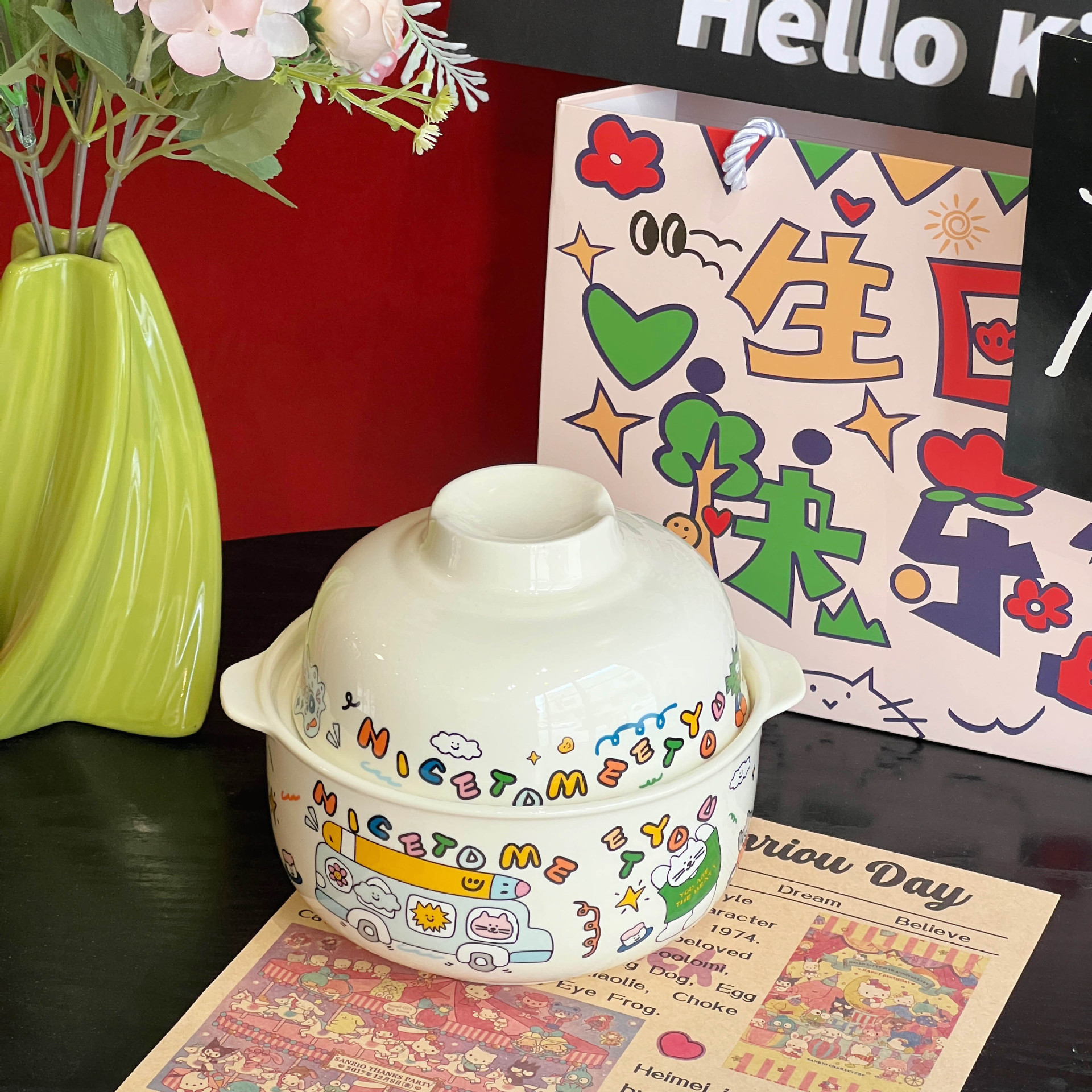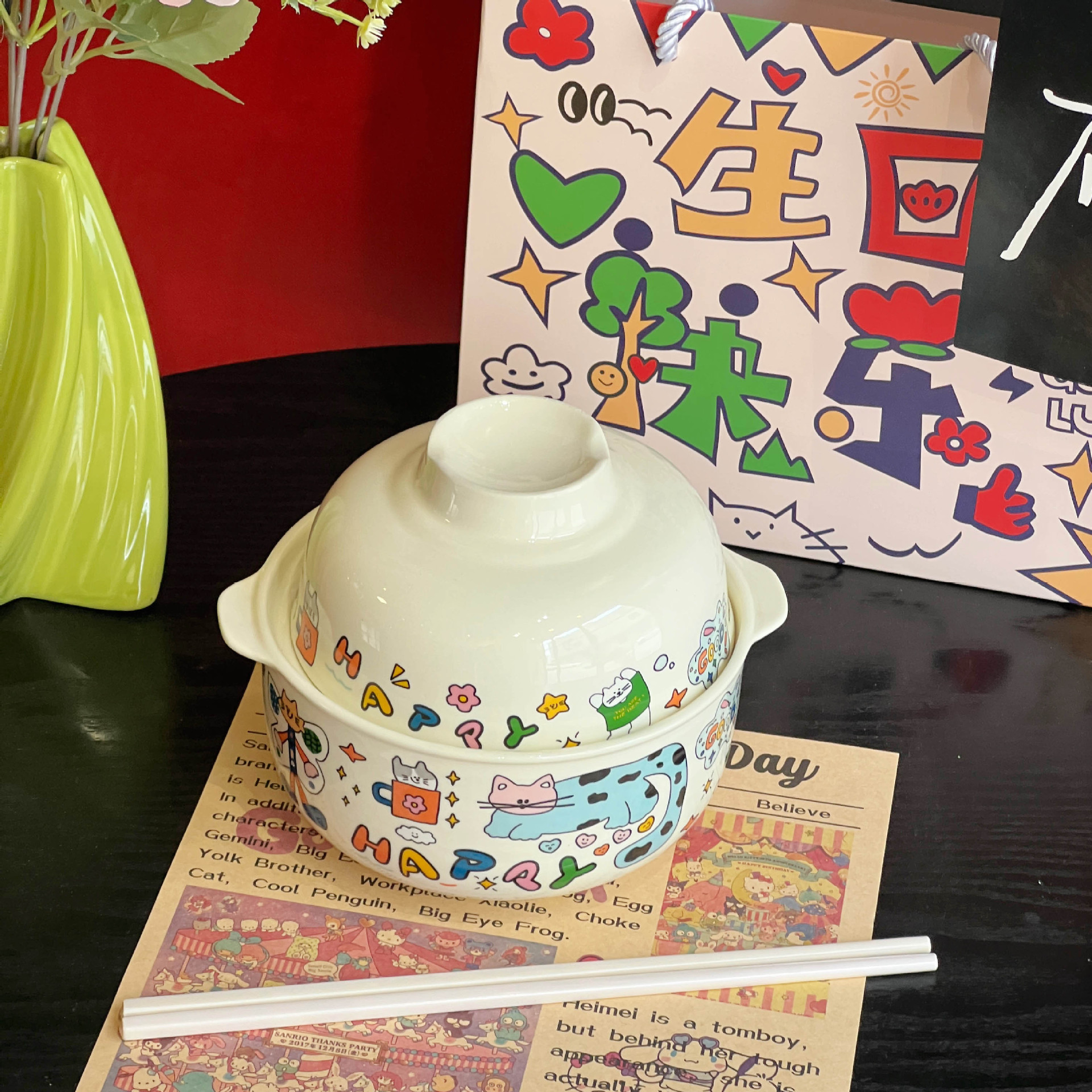 기숙사용 뚜껑이 있는 그래피티 세라믹 인스턴트 국수 그릇, 학생용 편리한 양쪽 귀 국수 그릇, 전자레인지 밥그릇, 매점 화상 방지
