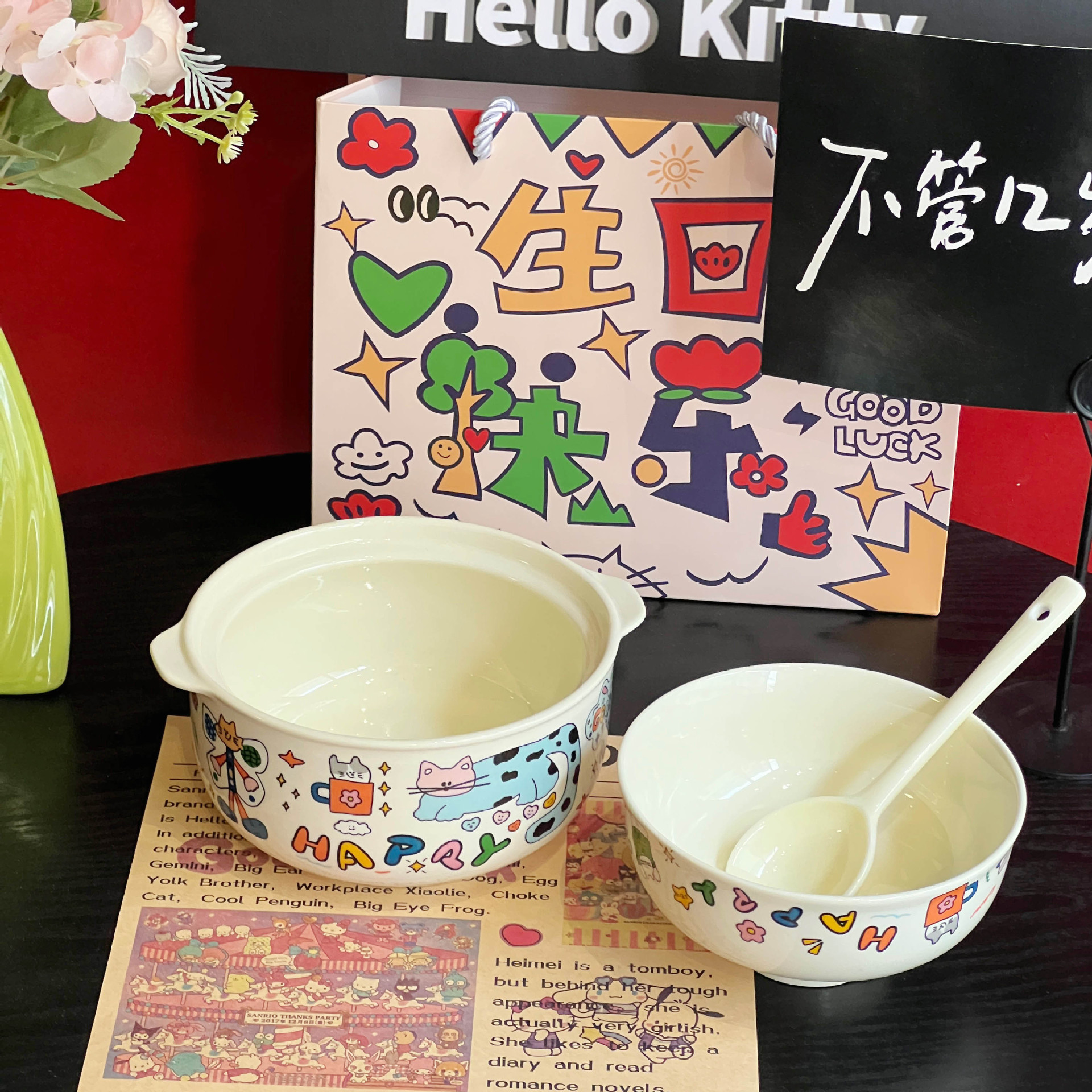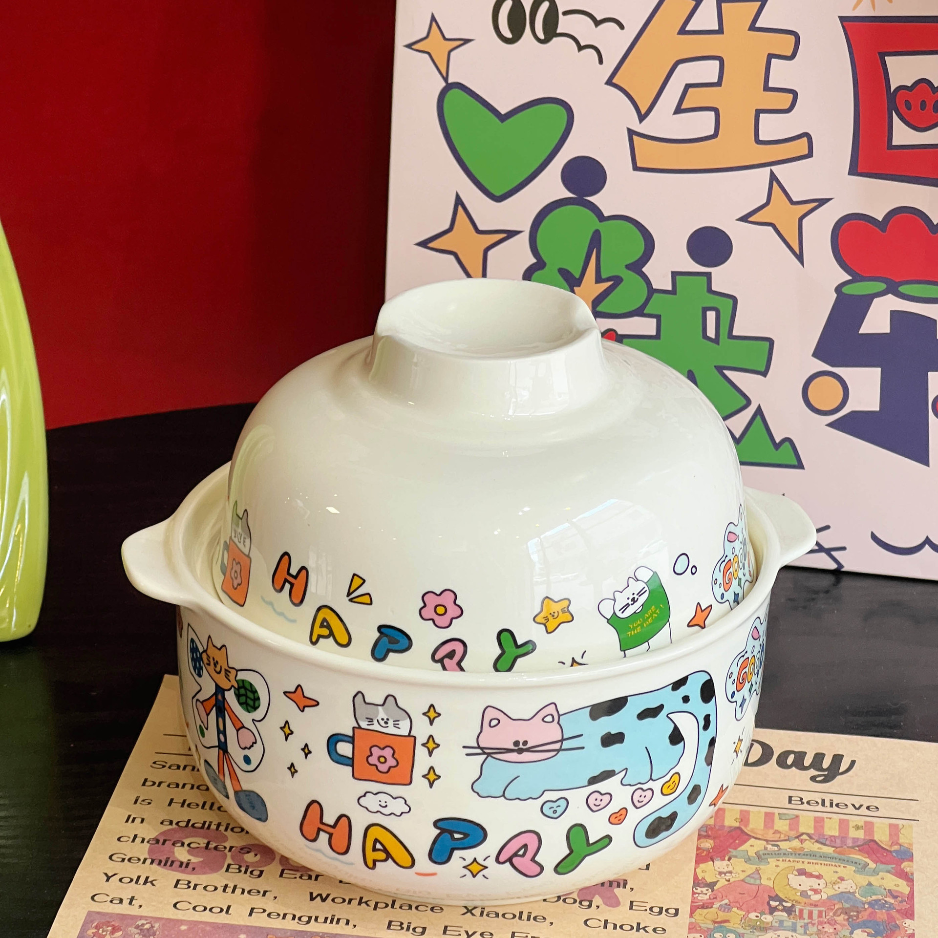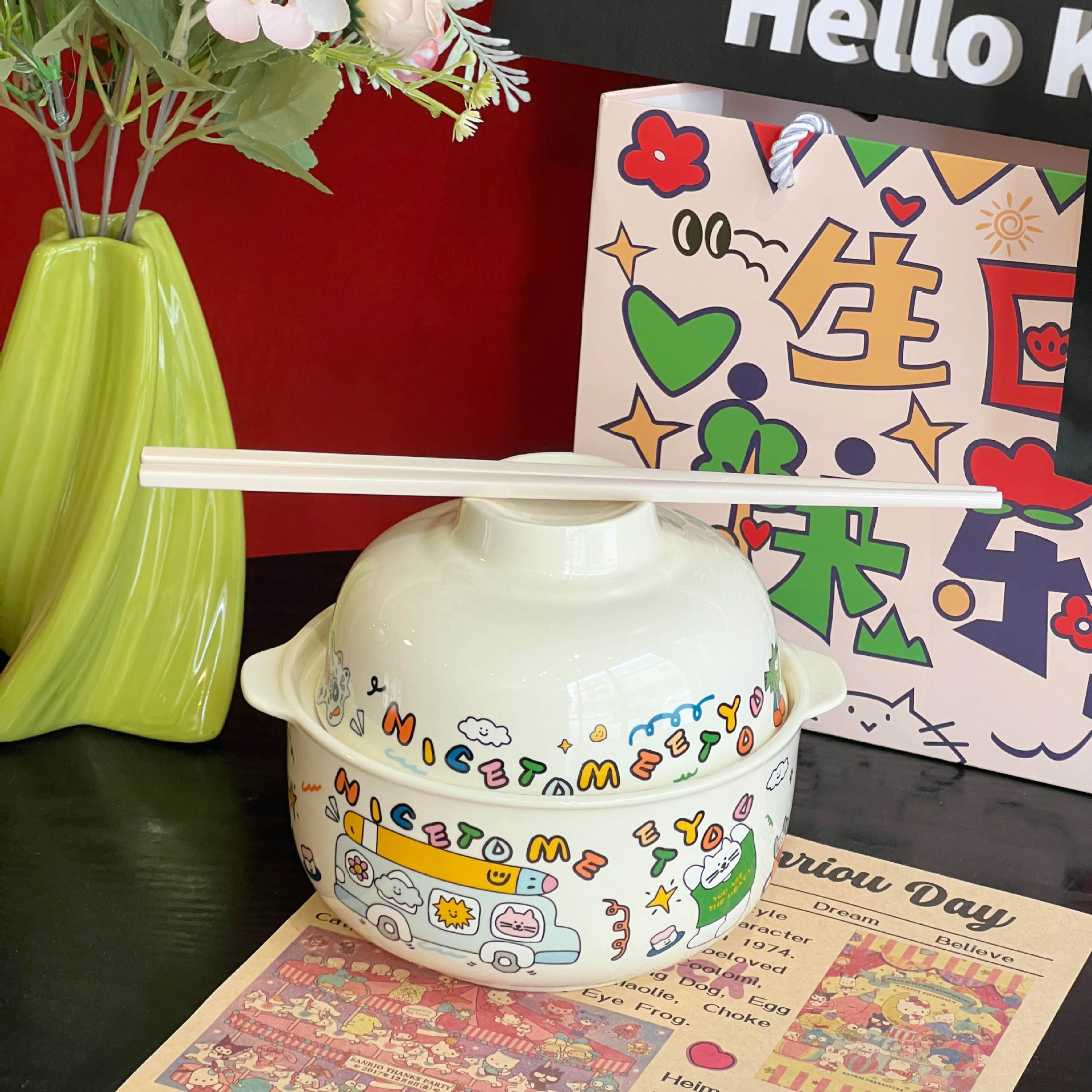 기숙사용 뚜껑이 있는 그래피티 세라믹 인스턴트 국수 그릇, 학생용 편리한 양쪽 귀 국수 그릇, 전자레인지 밥그릇, 매점 화상 방지