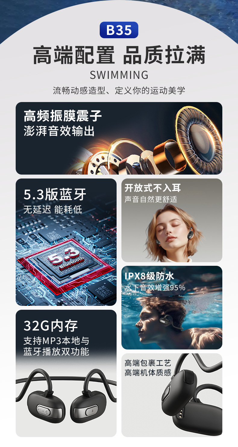 골전도 수영용 이어폰 IPX8 방수 2025 신형 블루투스 무선 러닝용 비삽입형 수영 이어폰