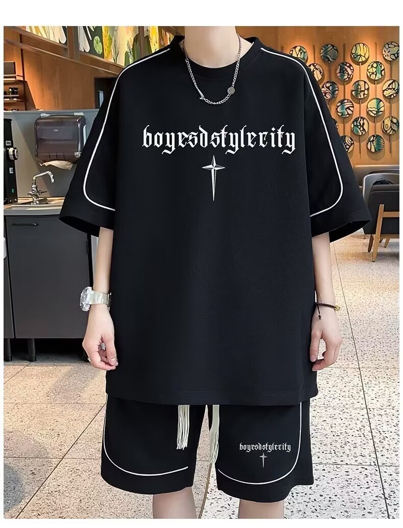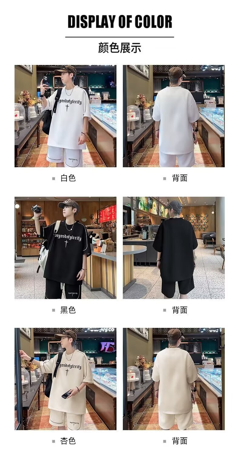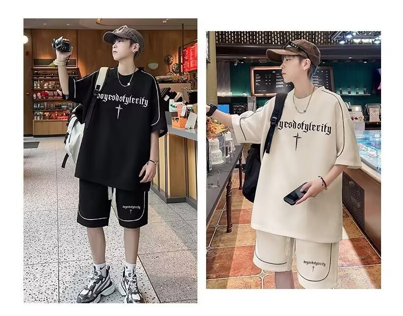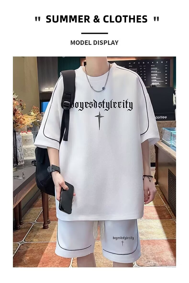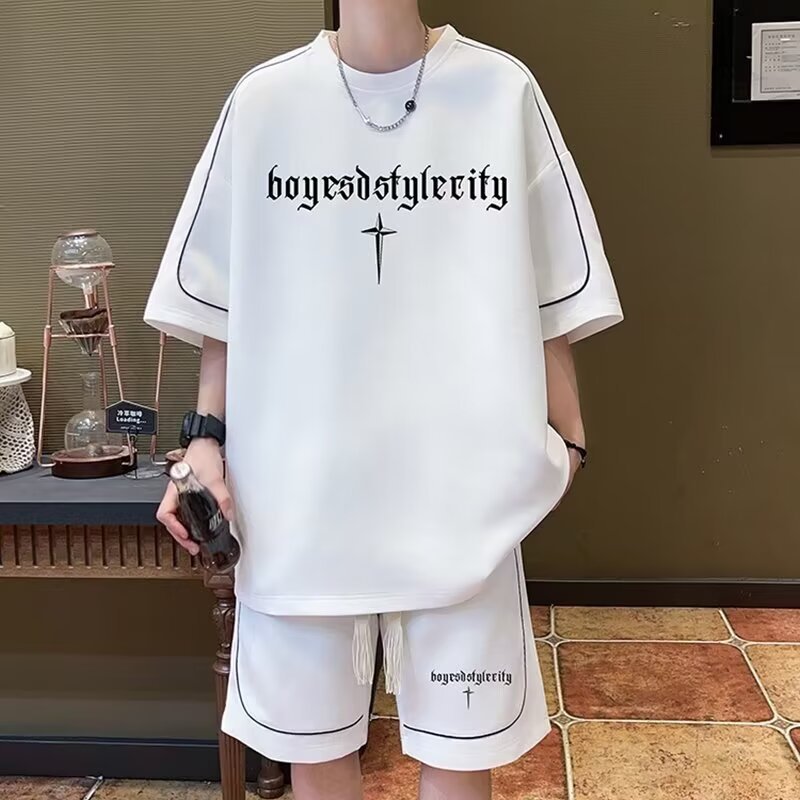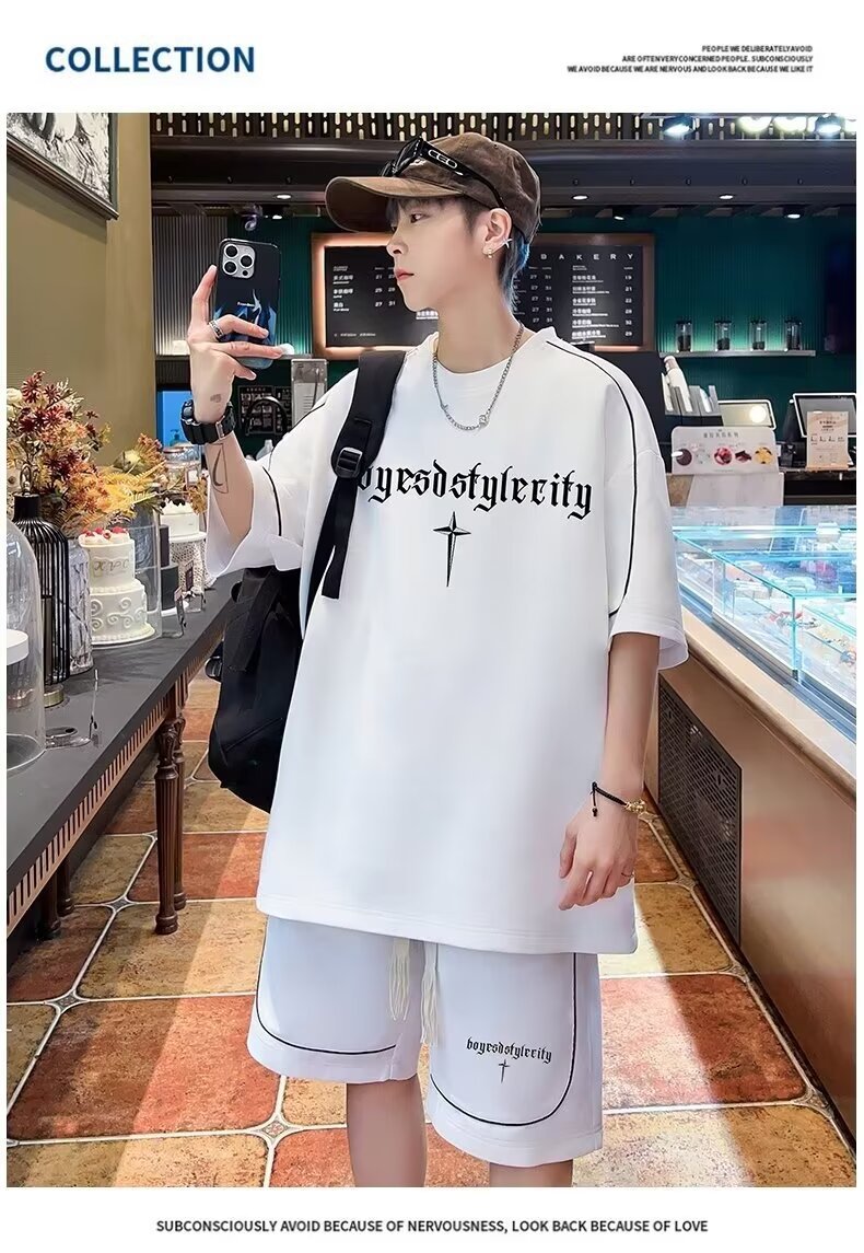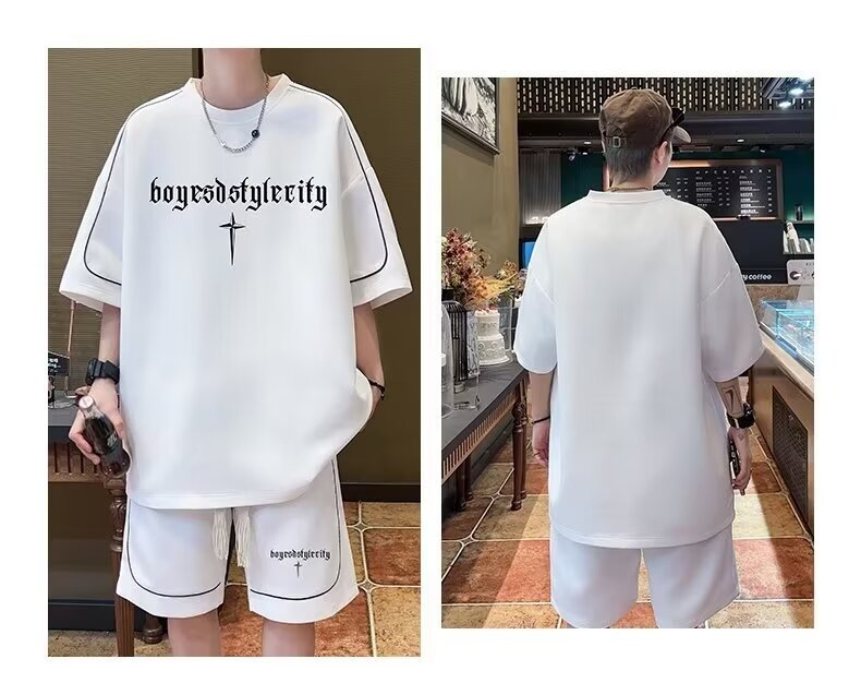 2024 홍콩 스타일 새로운 여름 홍콩 스타일 대형 파인애플 체크 학생 남성 반팔 티셔츠 캐주얼 반바지 정장 패션