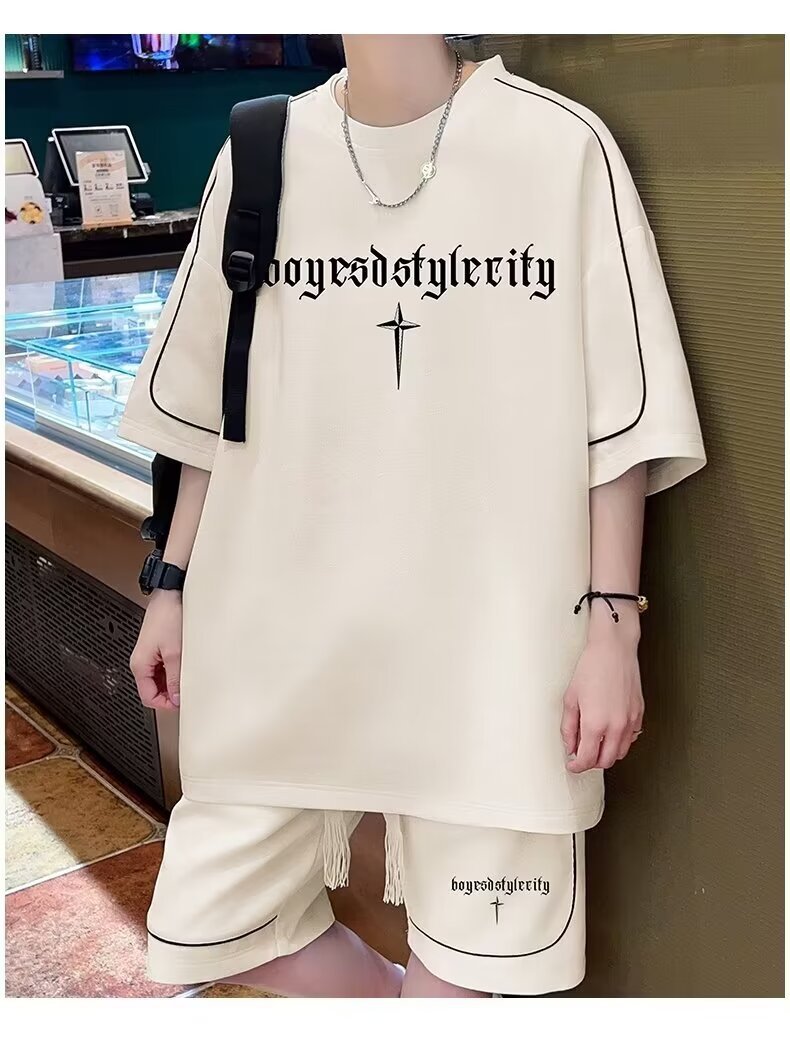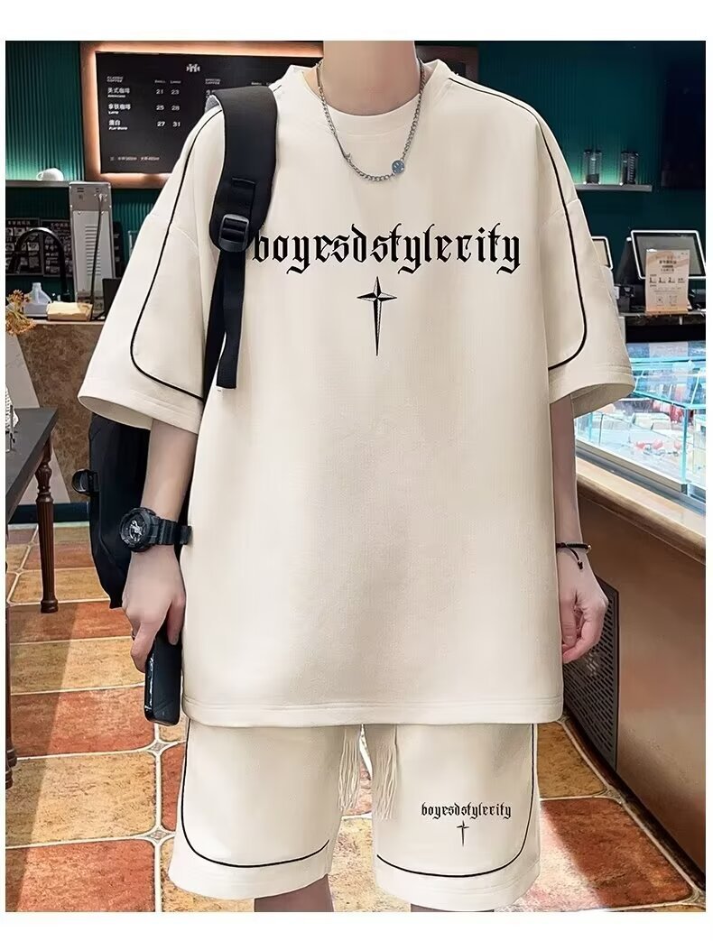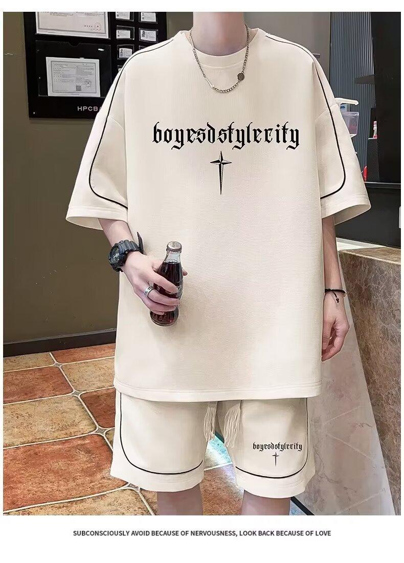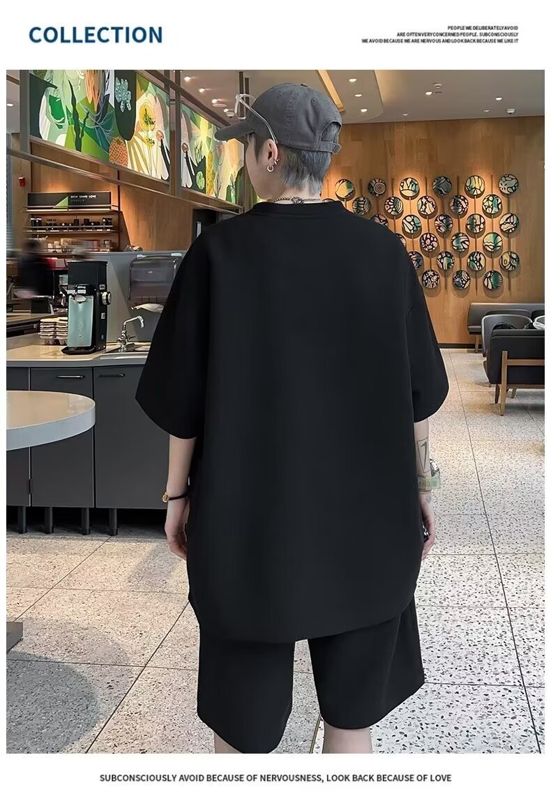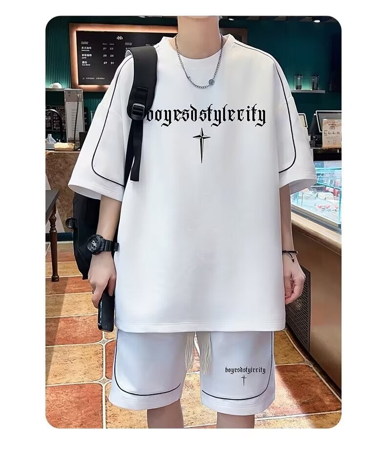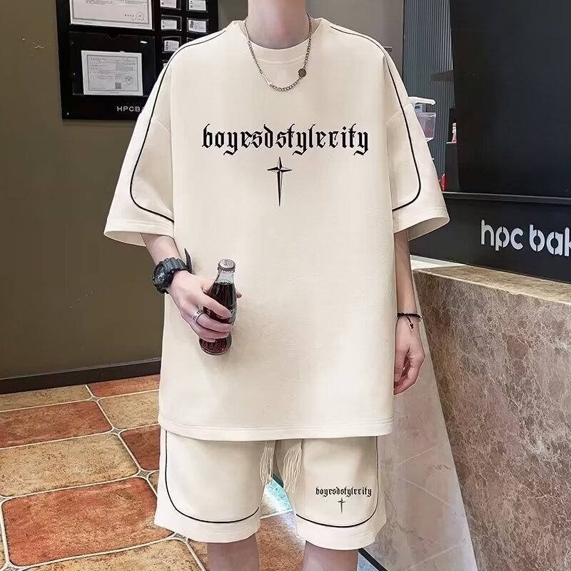 2024 홍콩 스타일 새로운 여름 홍콩 스타일 대형 파인애플 체크 학생 남성 반팔 티셔츠 캐주얼 반바지 정장 패션