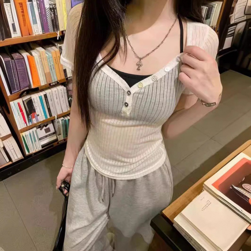 아메리칸 스타일 스파이스 걸스 V-Neck 버튼 어깨 반팔 티셔츠 여성의 여름 섹시한 타이트 슬리밍 틈새 쇼트 탑