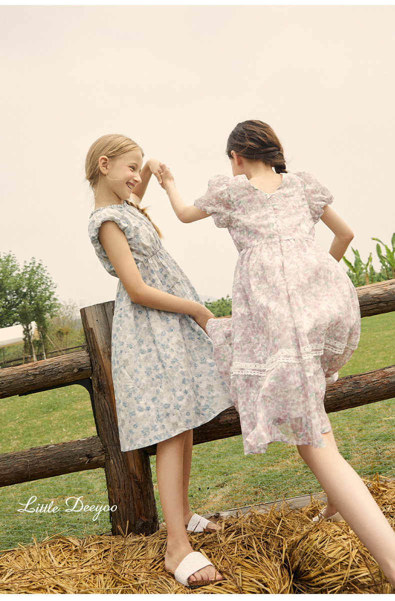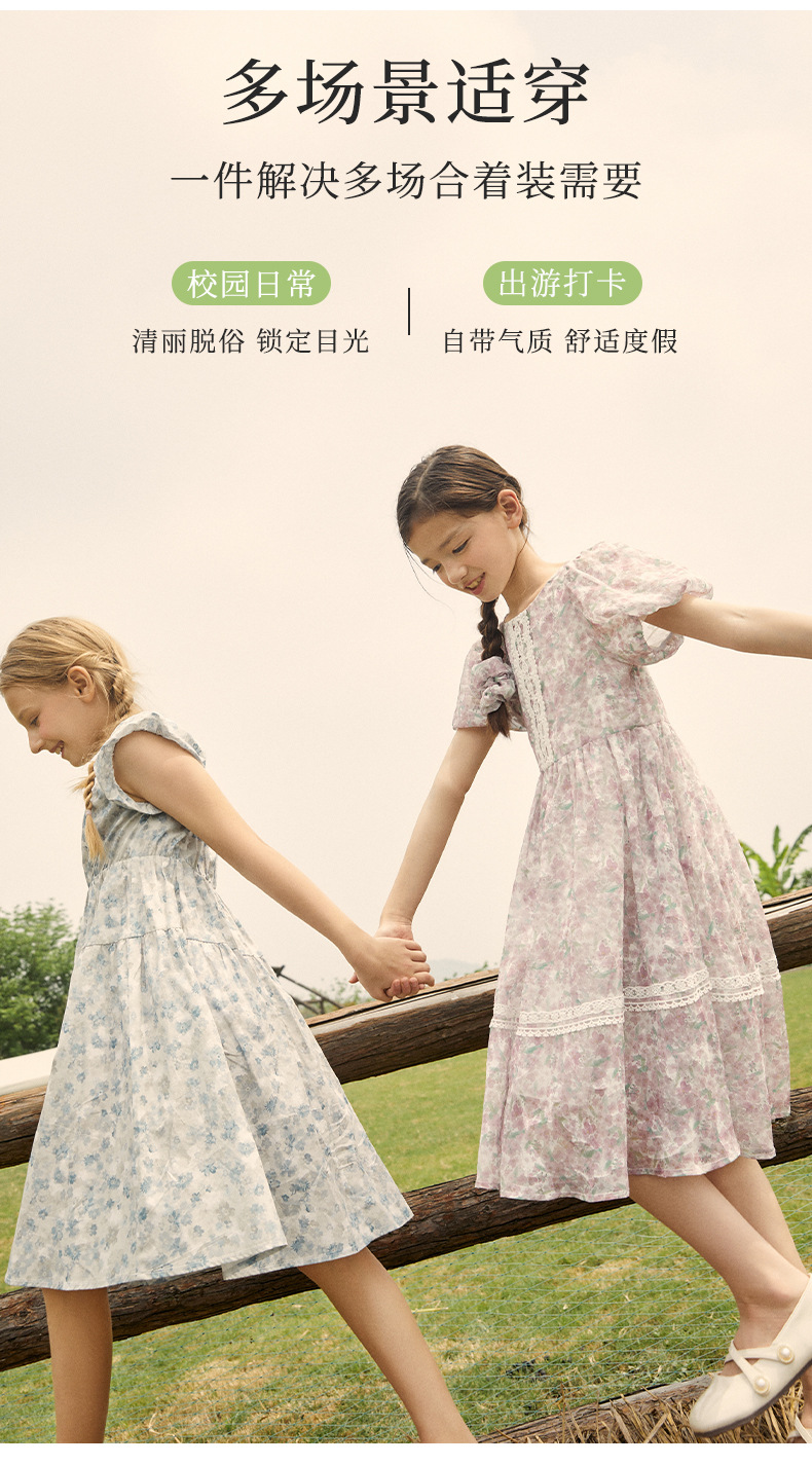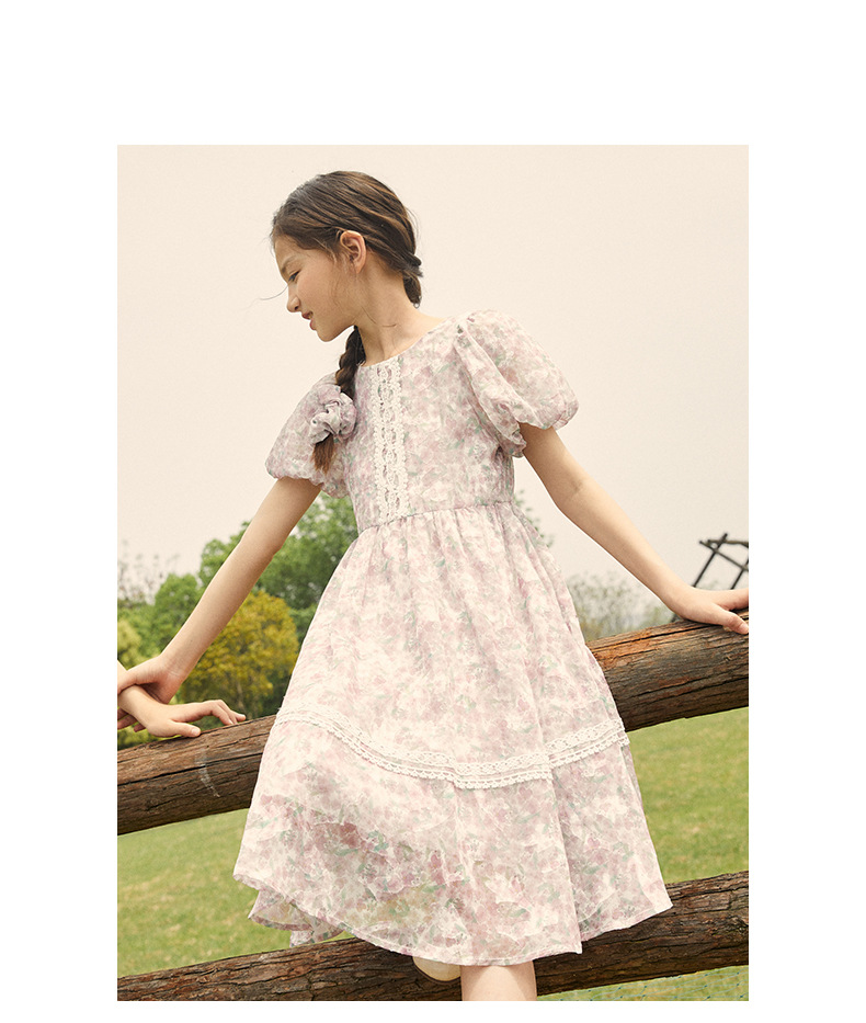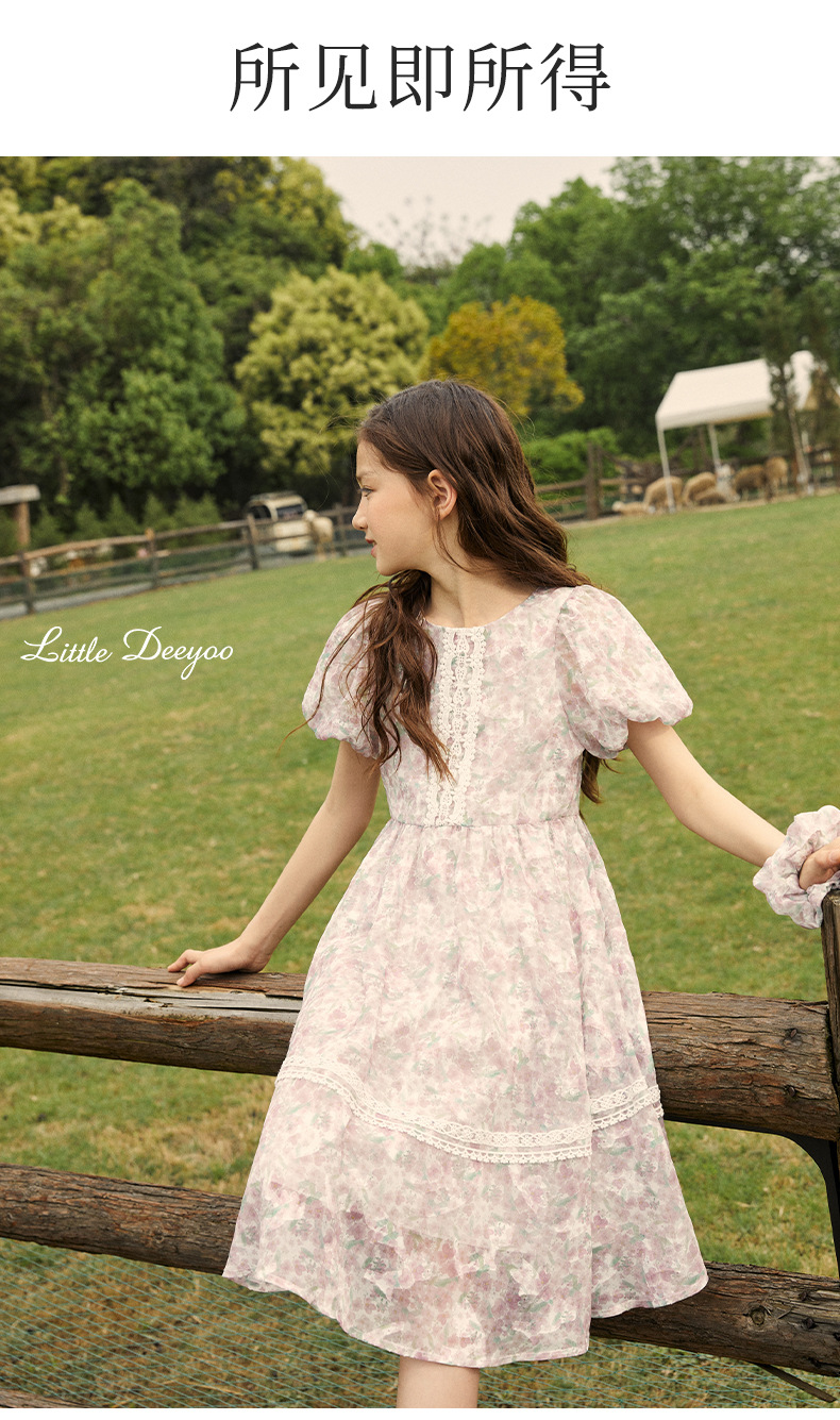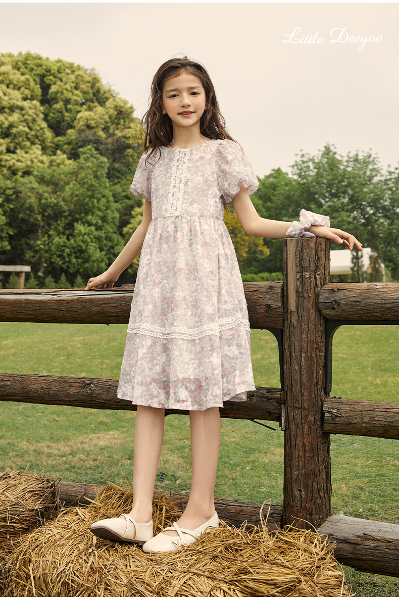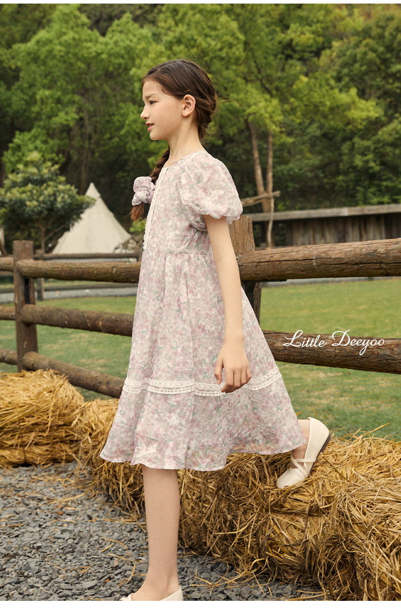 Sanluo 아동 의류 소녀 반팔 드레스 2024 여름 새로운 얇은 통기성 퍼프 슬리브 어린이 꽃 스커트