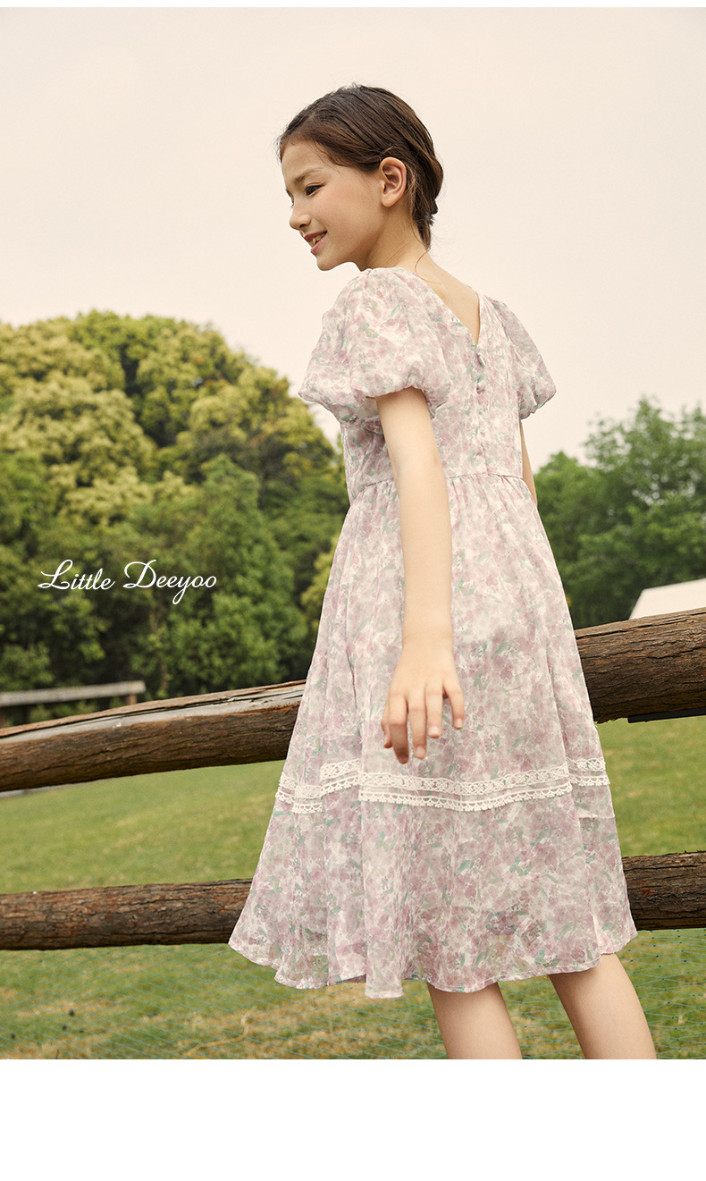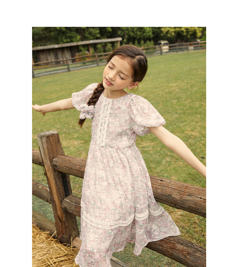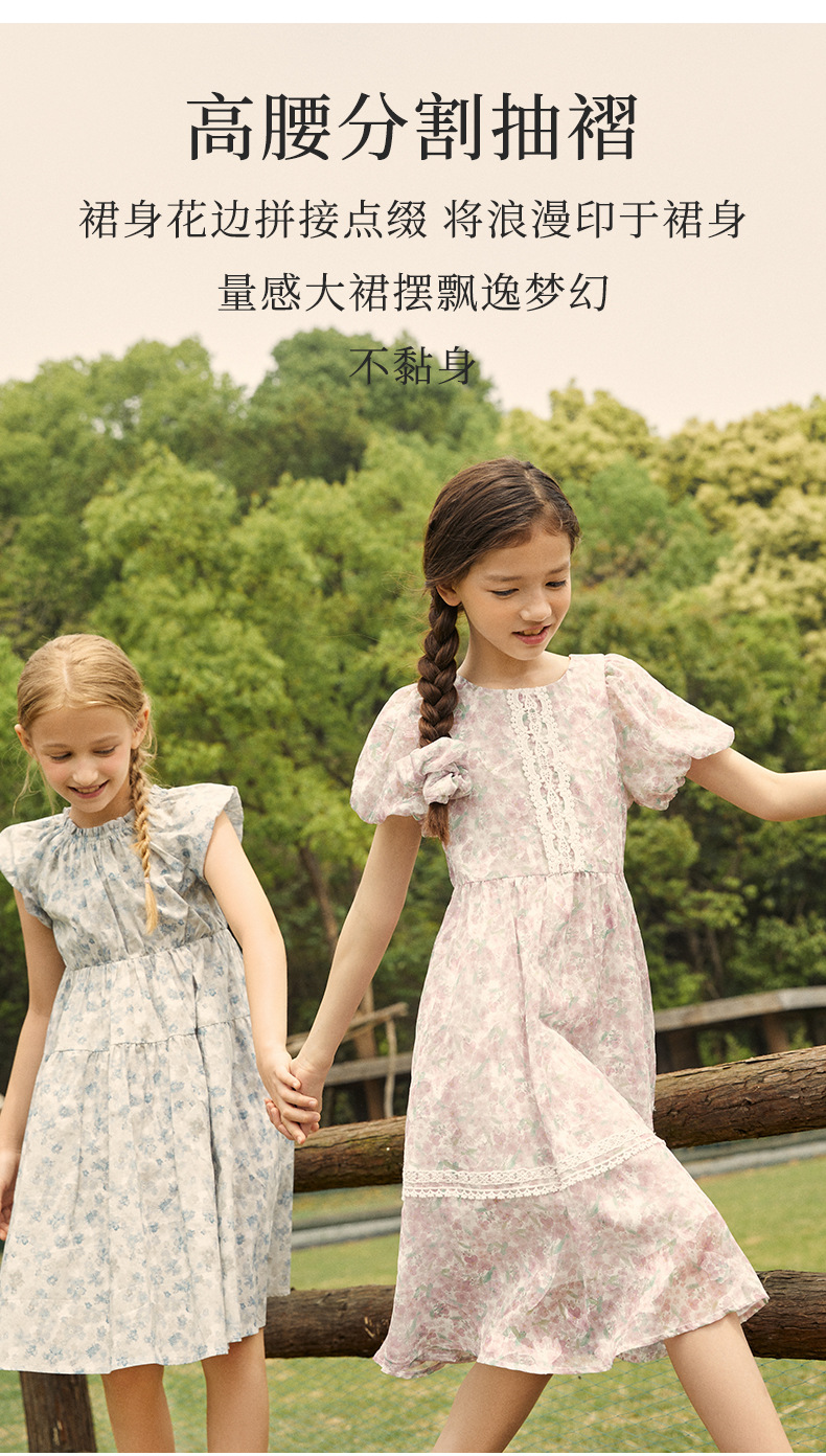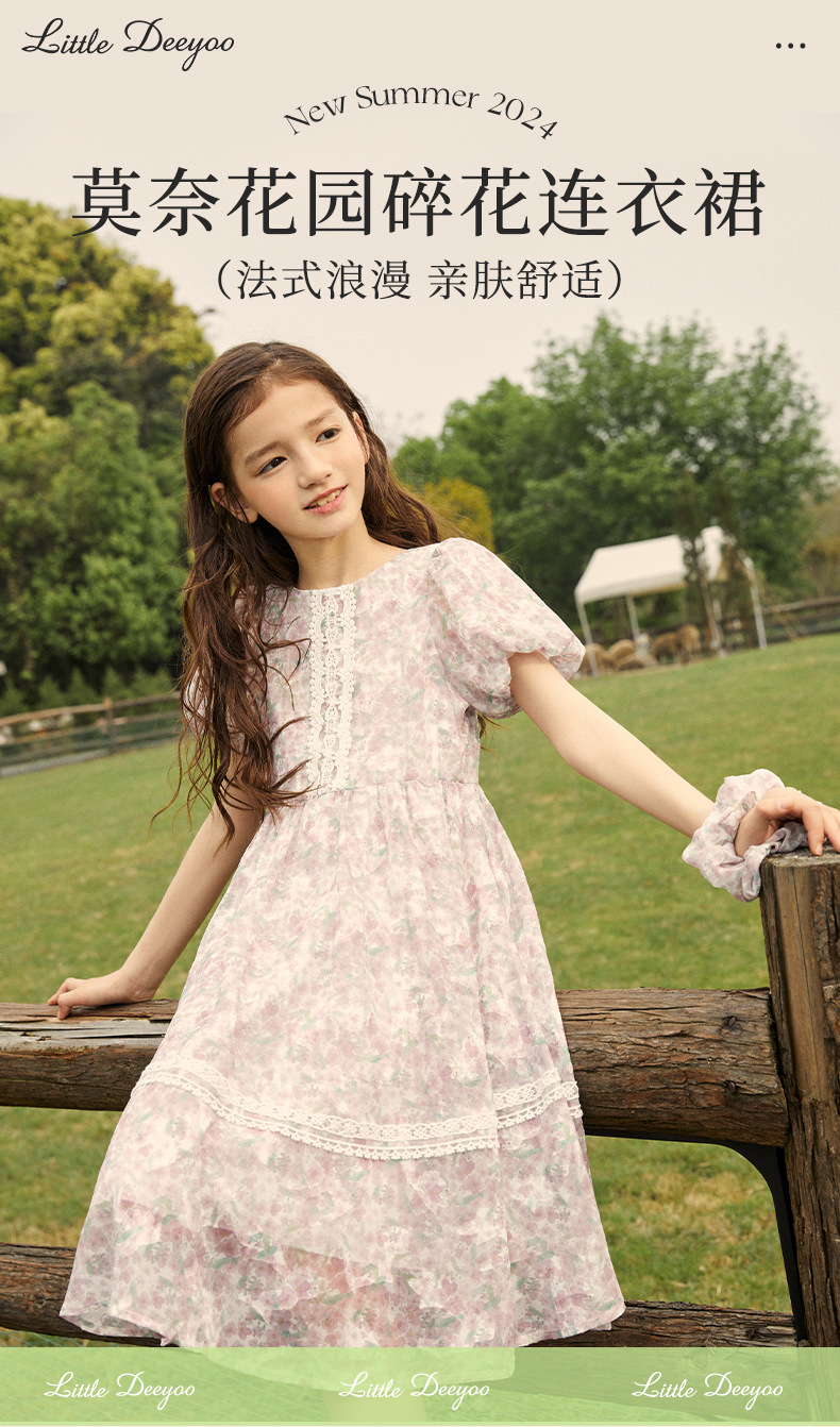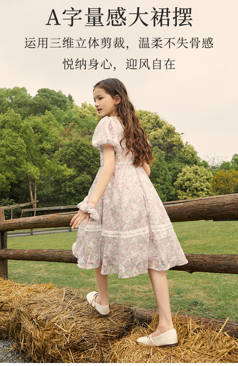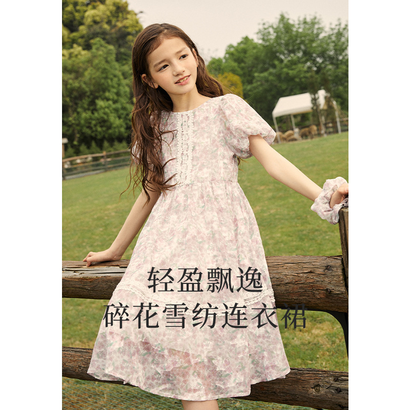 Sanluo 아동 의류 소녀 반팔 드레스 2024 여름 새로운 얇은 통기성 퍼프 슬리브 어린이 꽃 스커트