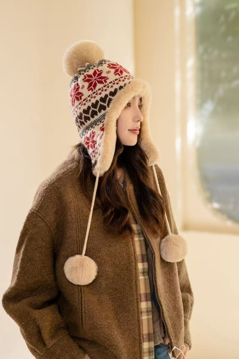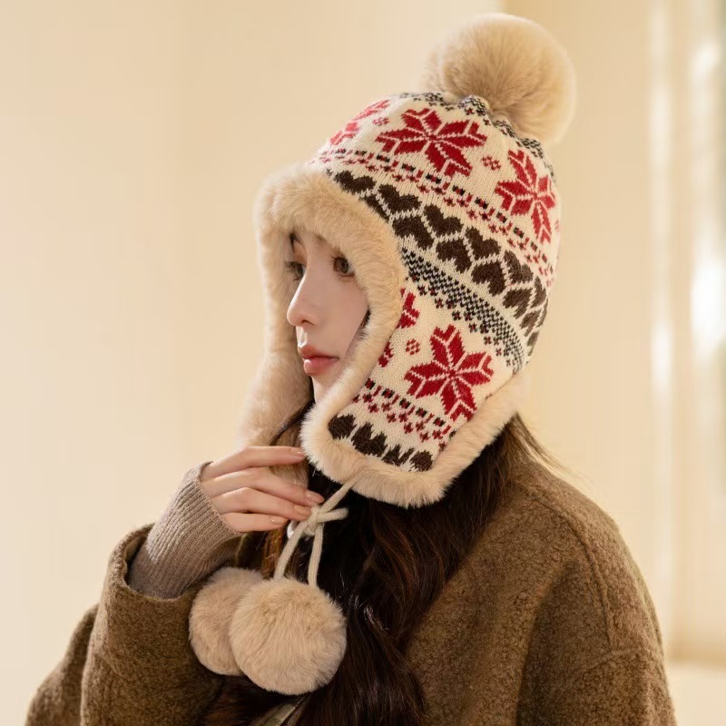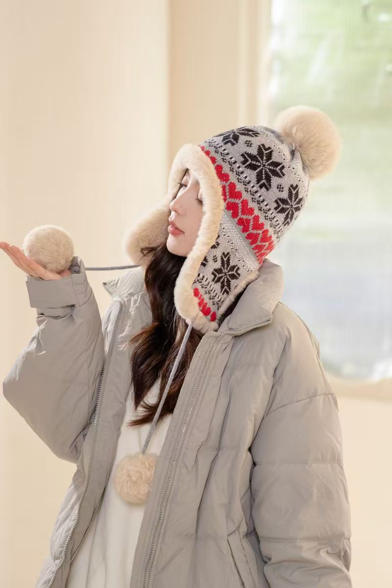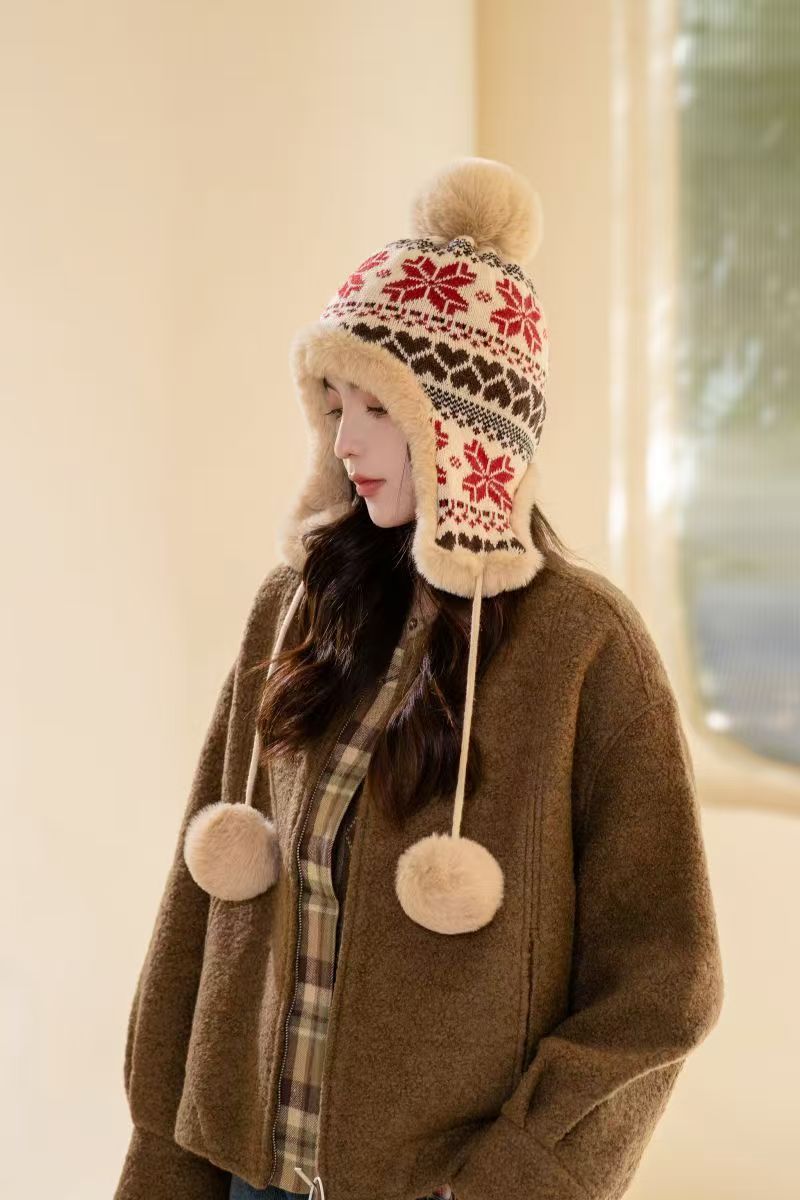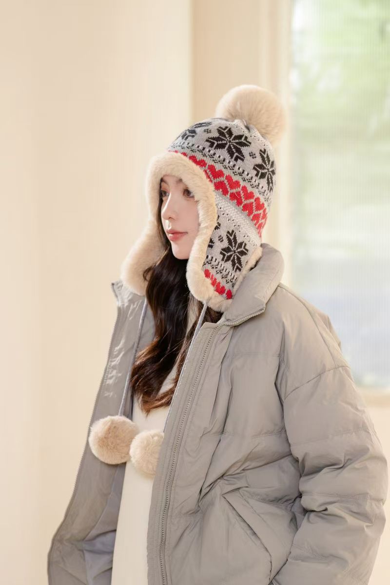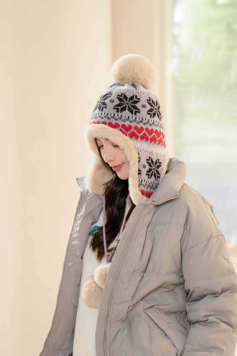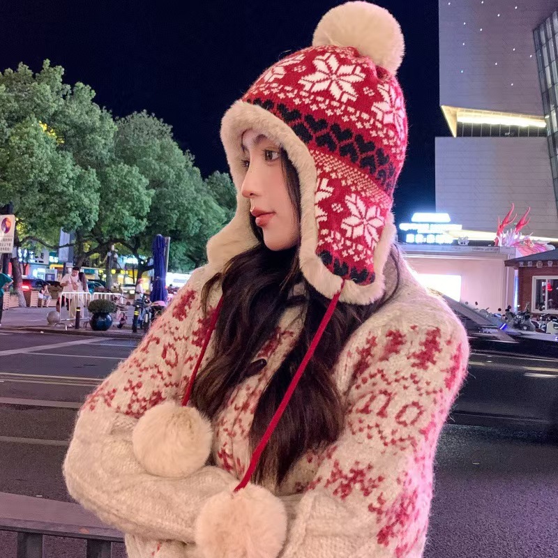 귀여운 봉제 눈송이 매달린 공 귀 모자 레이 펑 모자 여성의 겨울 새로운 따뜻한 양모 모자 크리스마스 모자스토어 가기