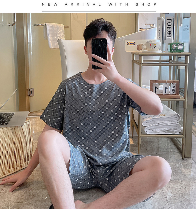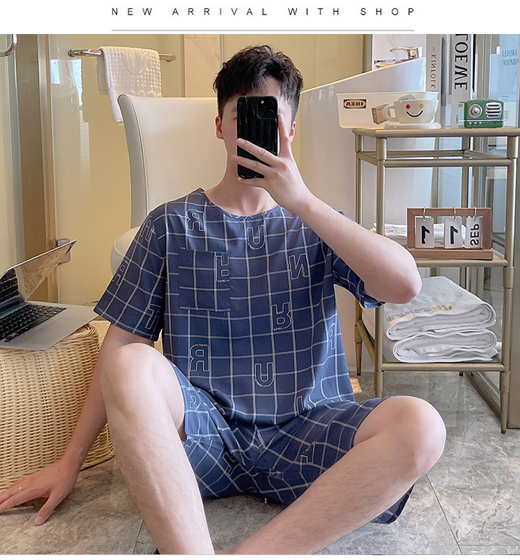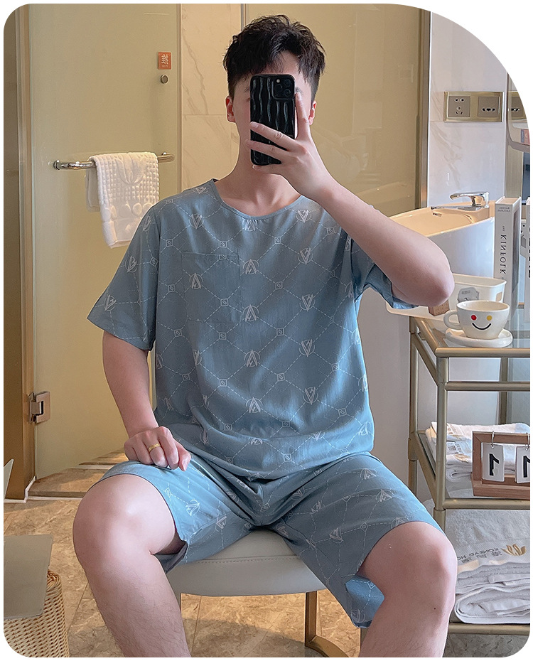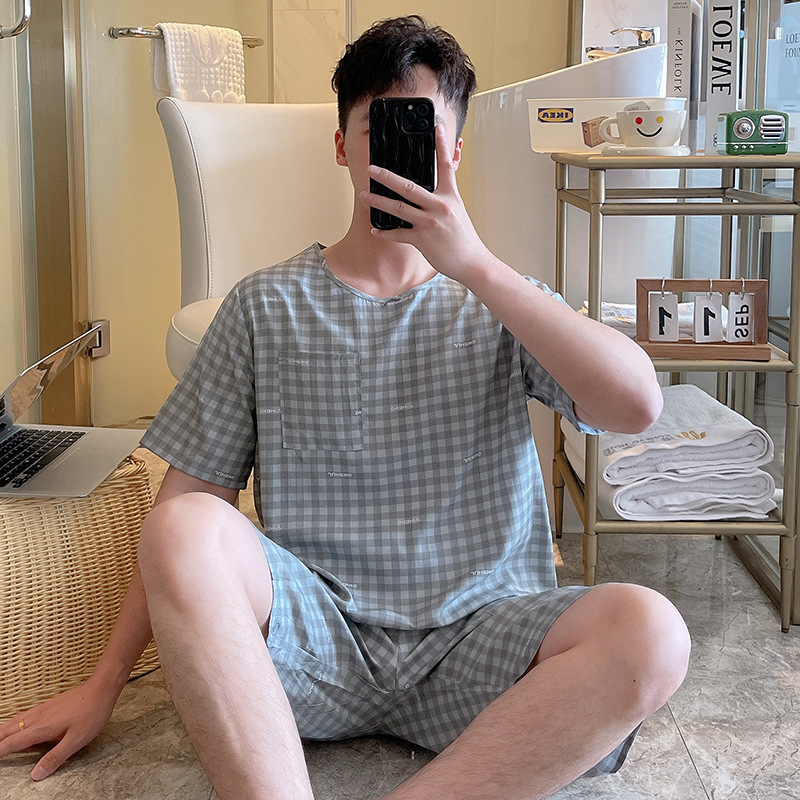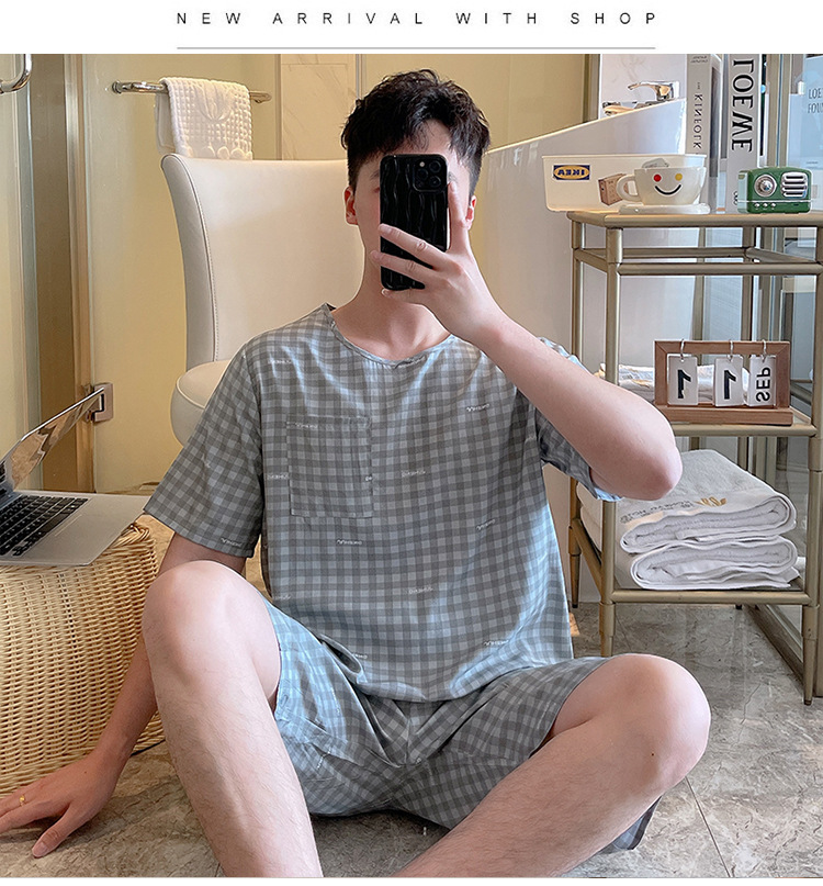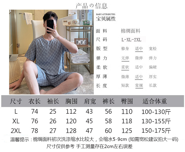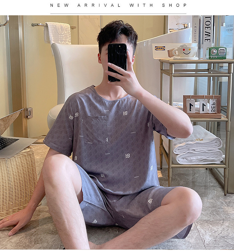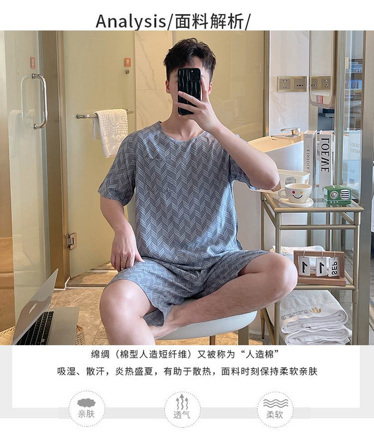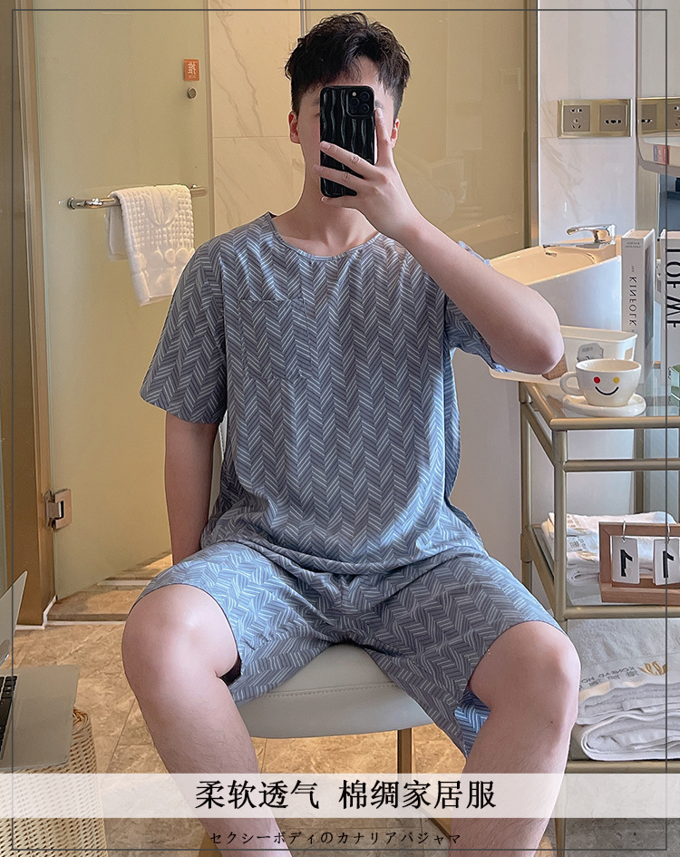 새로운 스타일 코튼 실크 잠옷 남성용 여름 얇은 반팔 반바지 홈 의류 인공 면화 플러스 사이즈 청소년 겉옷 세트스토어 가기