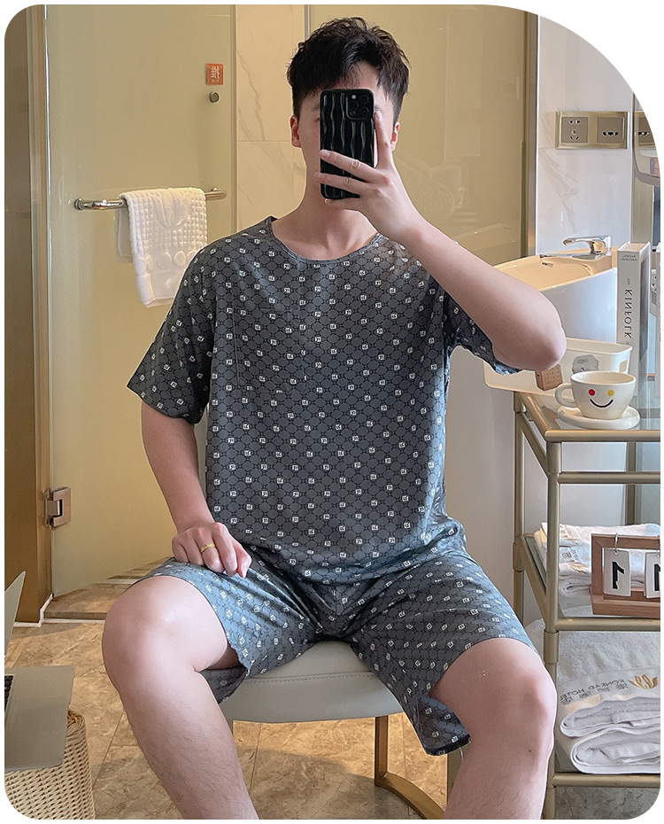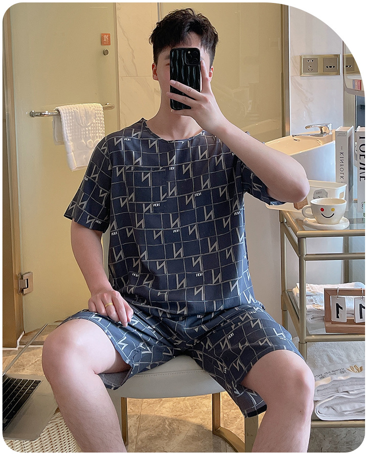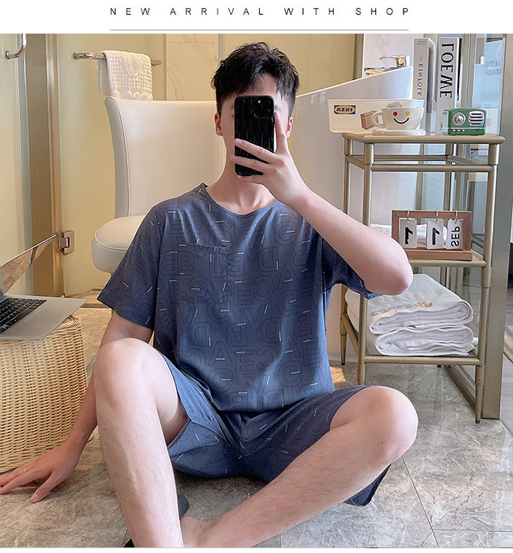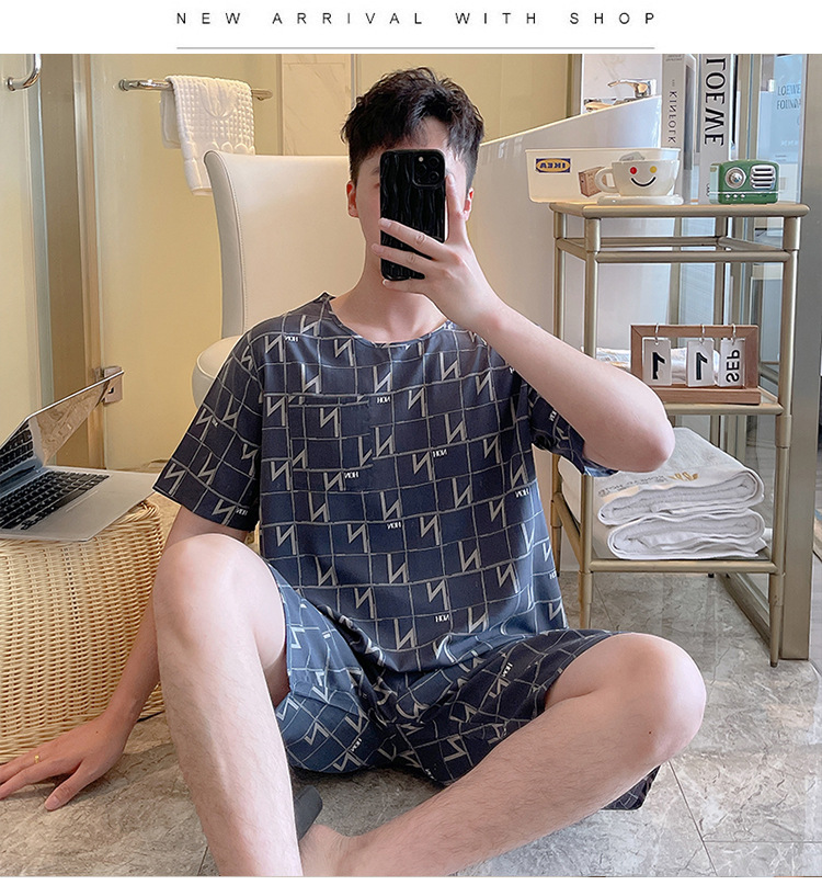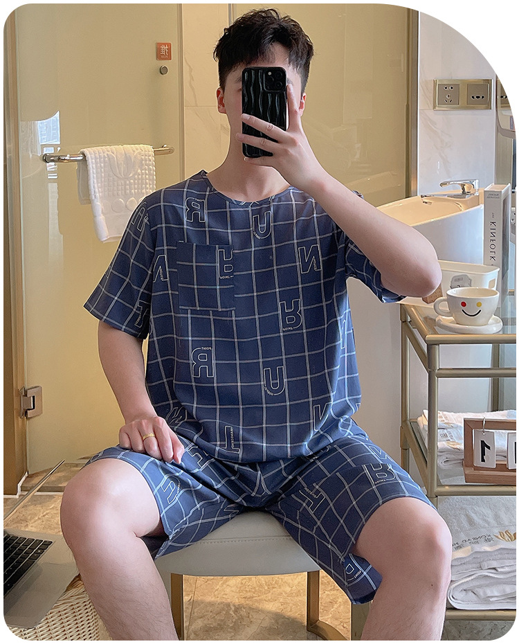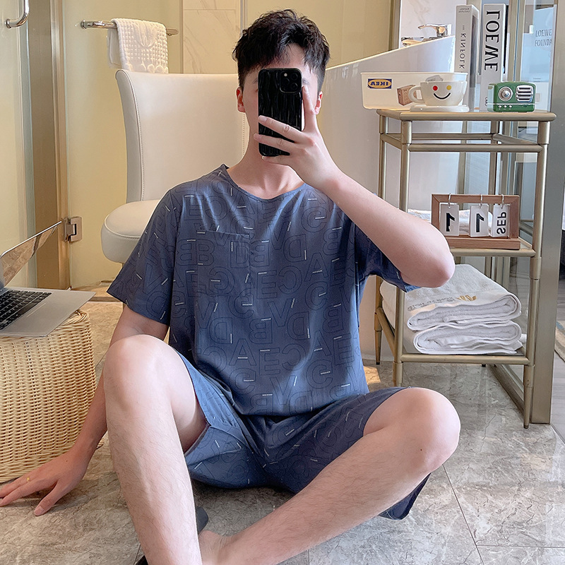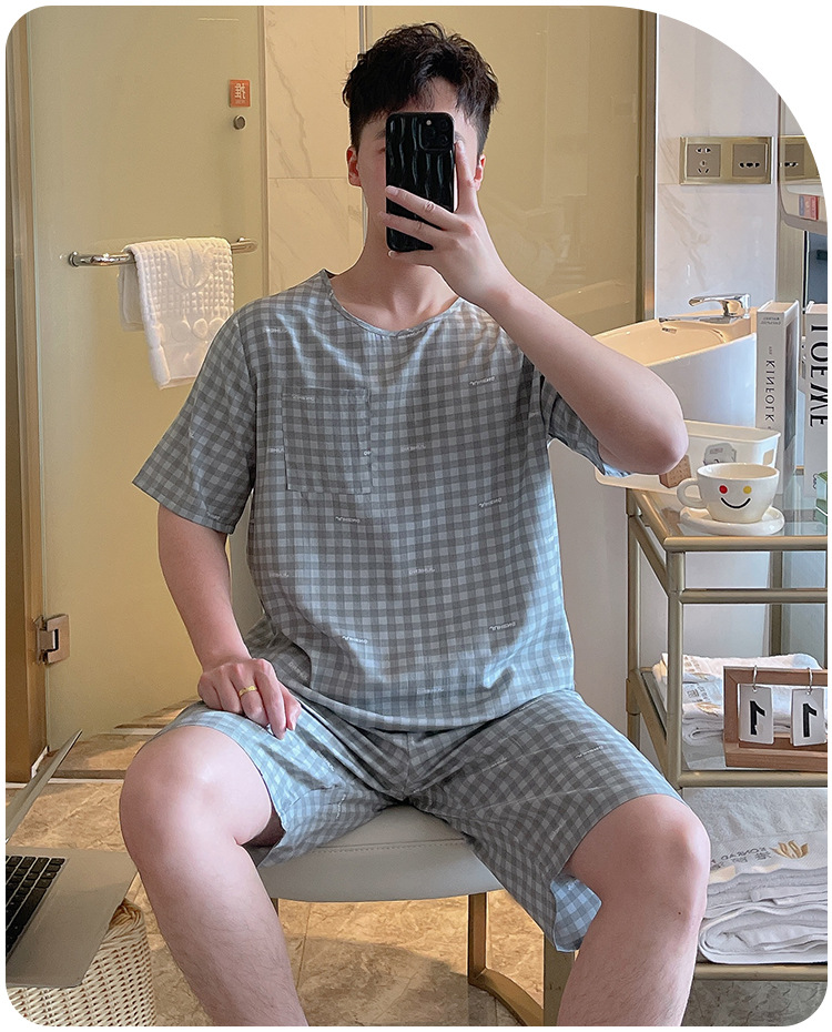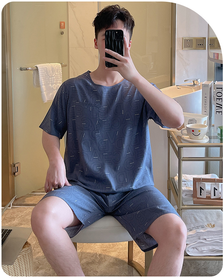 새로운 스타일 코튼 실크 잠옷 남성용 여름 얇은 반팔 반바지 홈 의류 인공 면화 플러스 사이즈 청소년 겉옷 세트스토어 가기