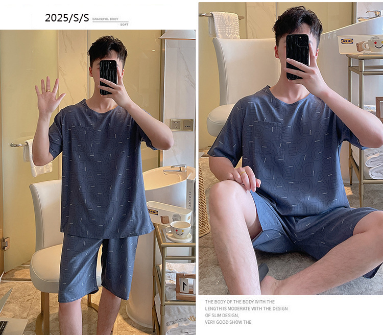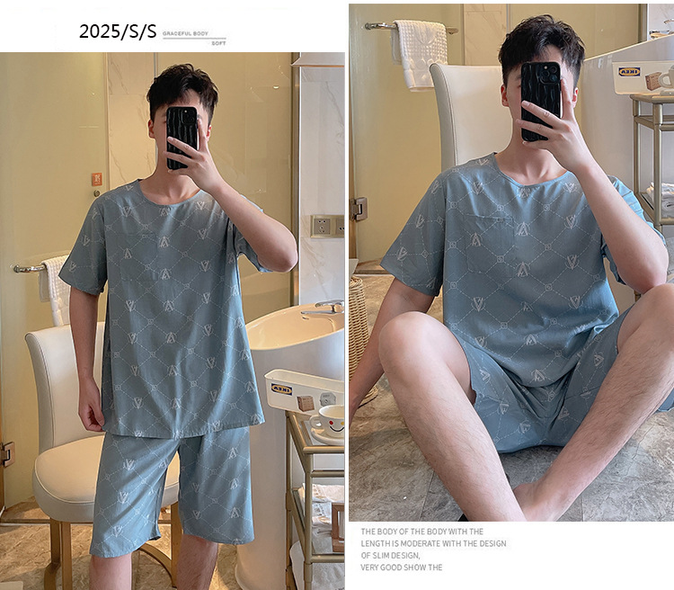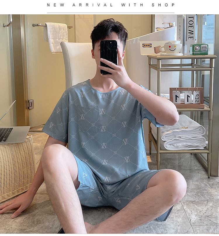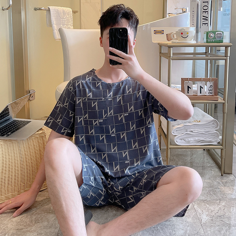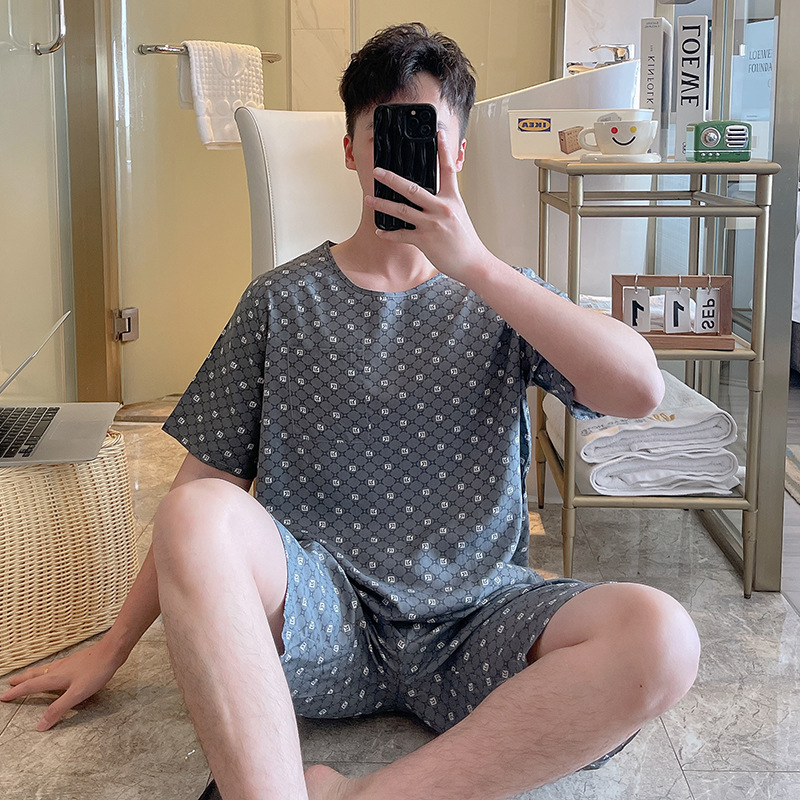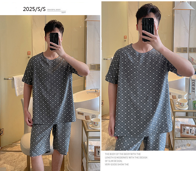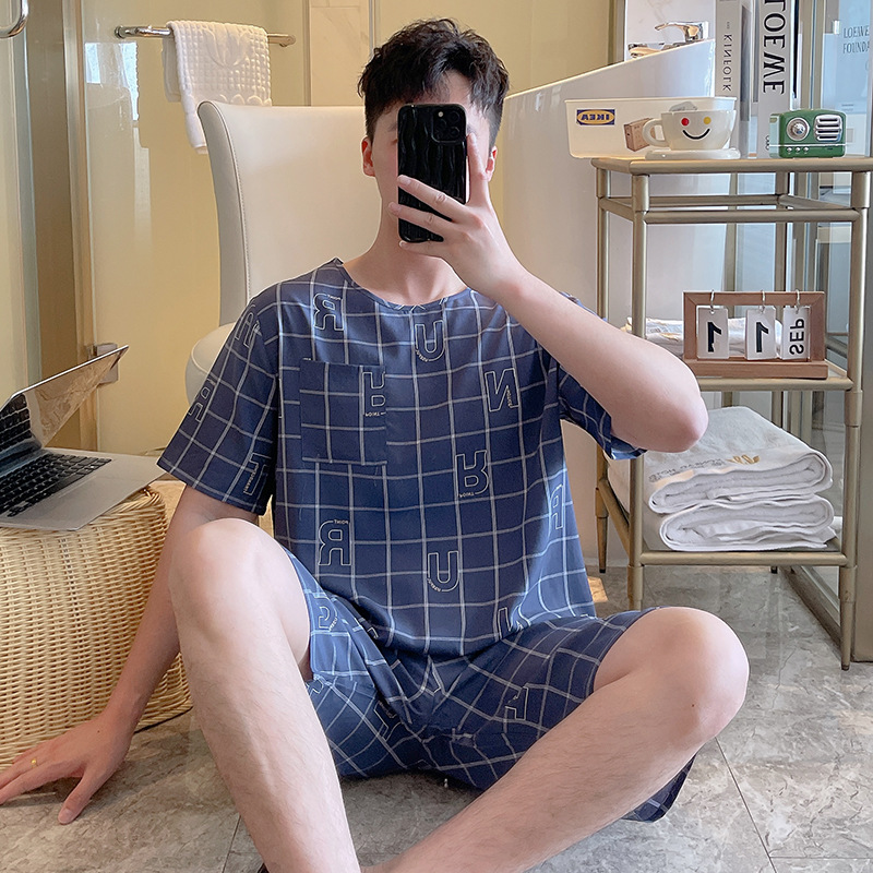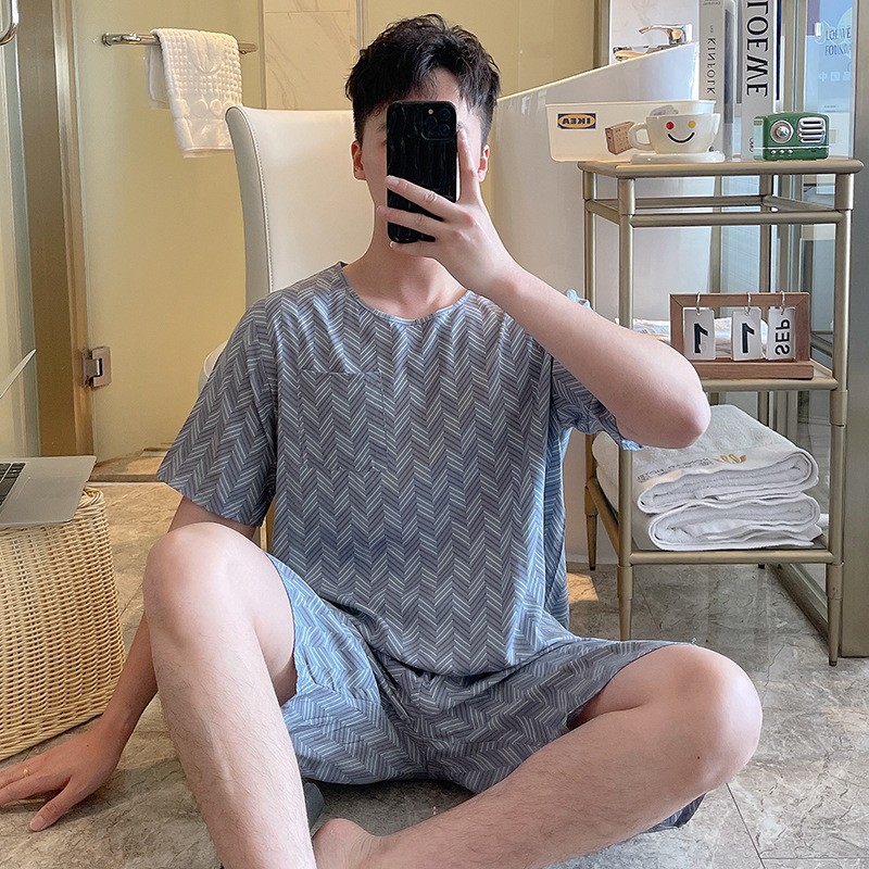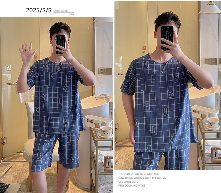 새로운 스타일 코튼 실크 잠옷 남성용 여름 얇은 반팔 반바지 홈 의류 인공 면화 플러스 사이즈 청소년 겉옷 세트스토어 가기