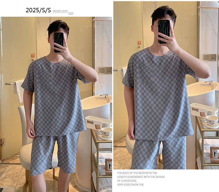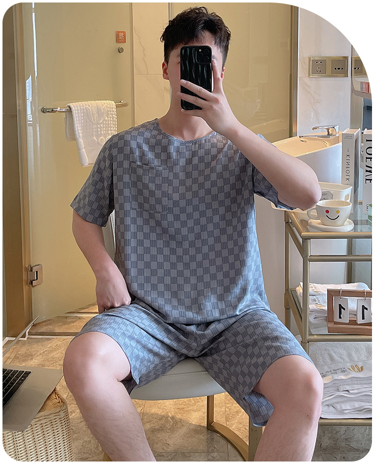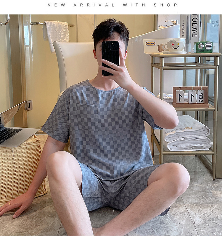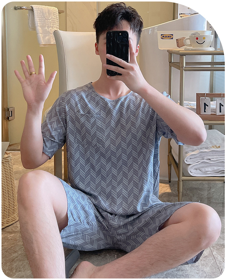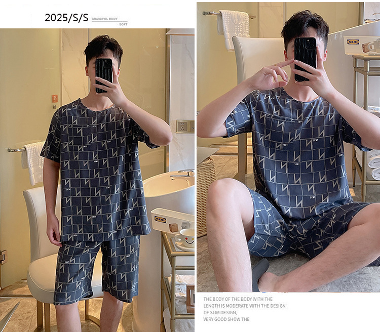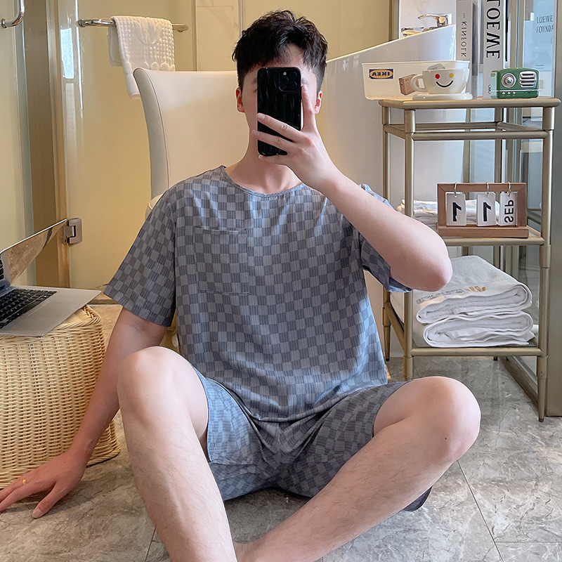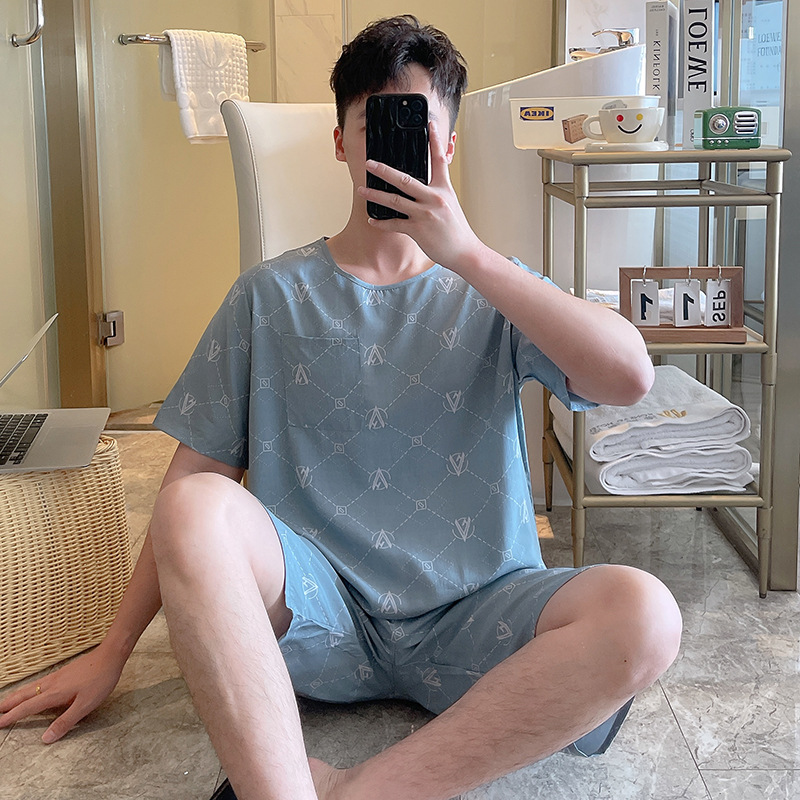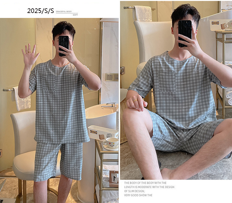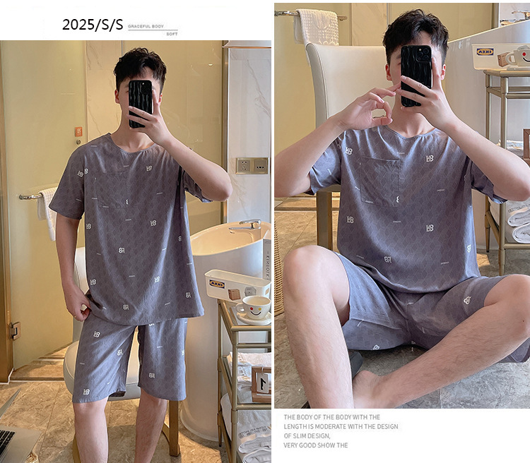 새로운 스타일 코튼 실크 잠옷 남성용 여름 얇은 반팔 반바지 홈 의류 인공 면화 플러스 사이즈 청소년 겉옷 세트스토어 가기