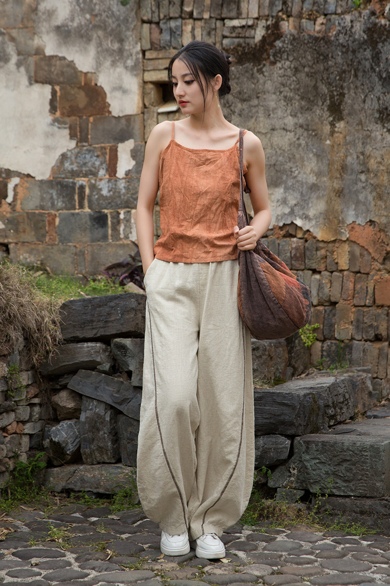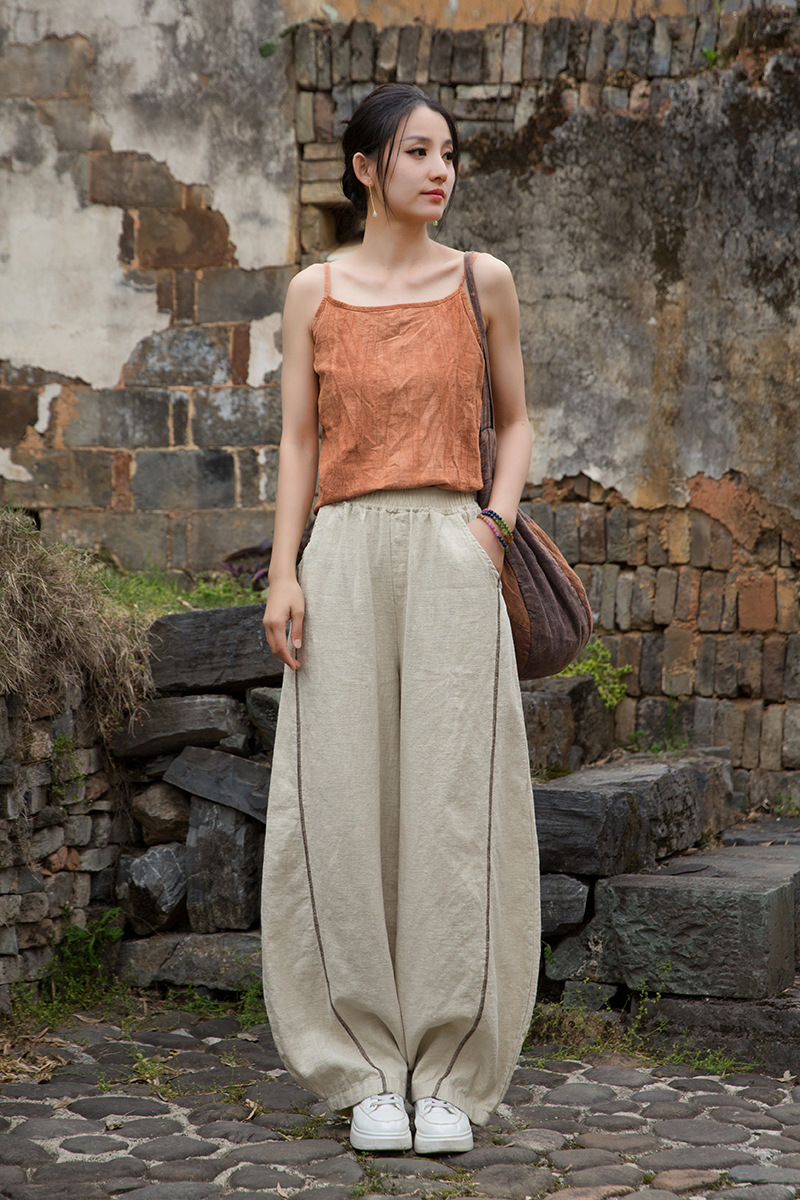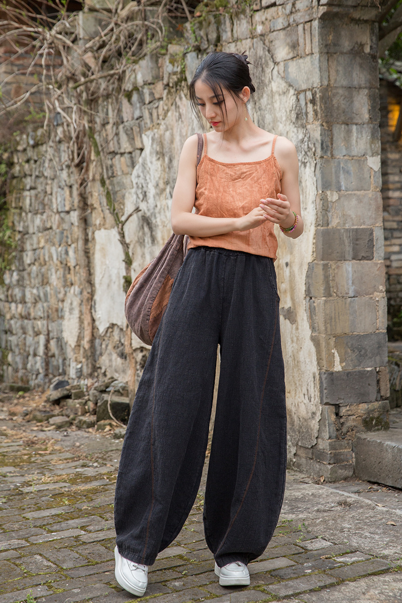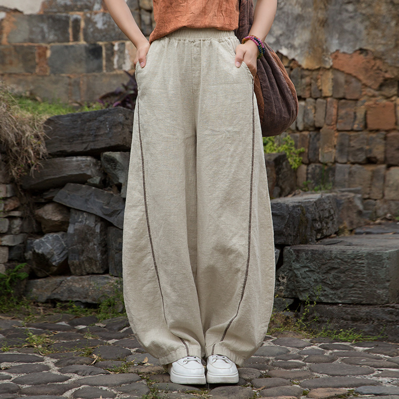 2025 가을 겨울 신상 여성용 면마 혼방 바지, 모시 샌드워싱, 색상 빈티지 처리, 명상용 랜턴 팬츠스토어 가기