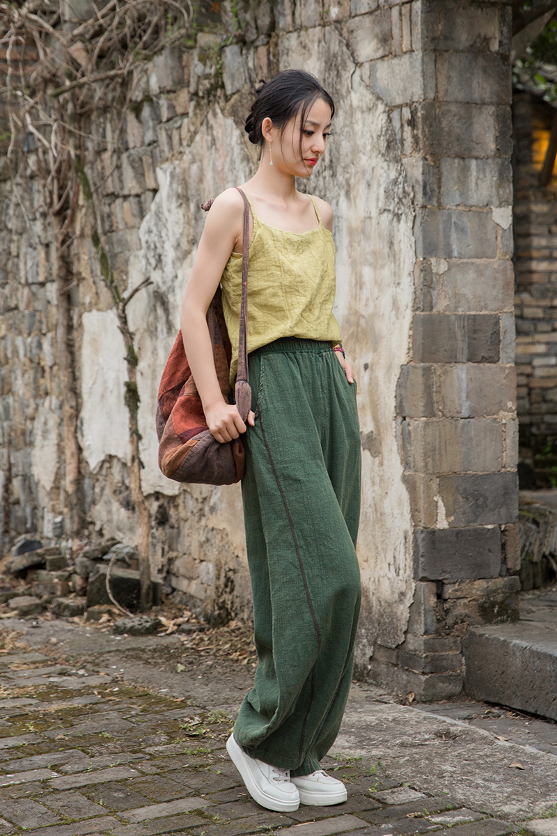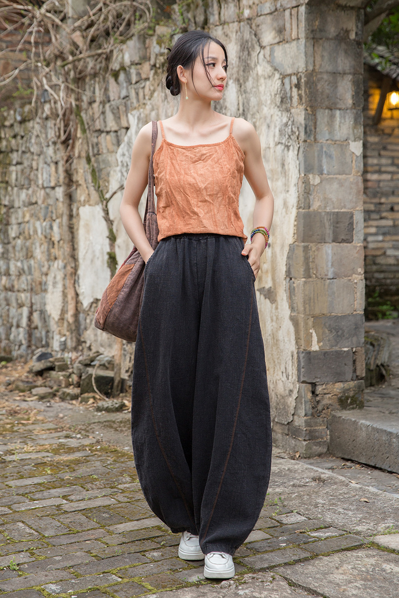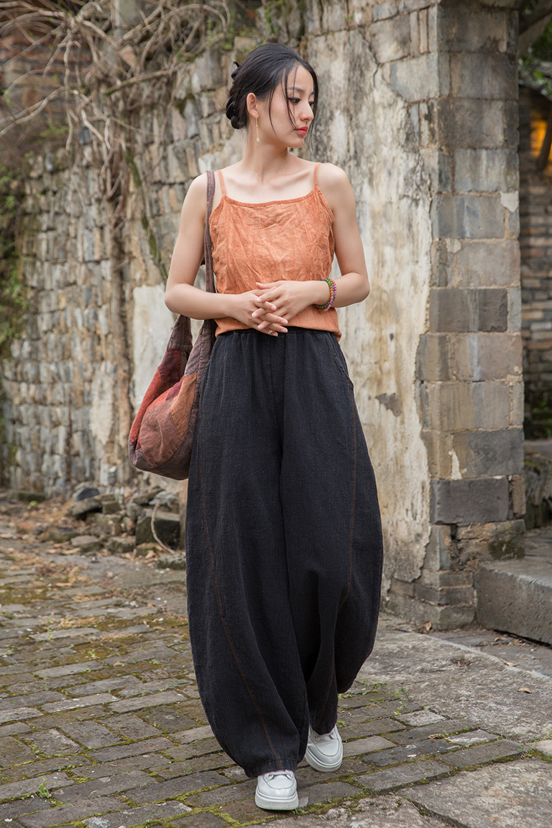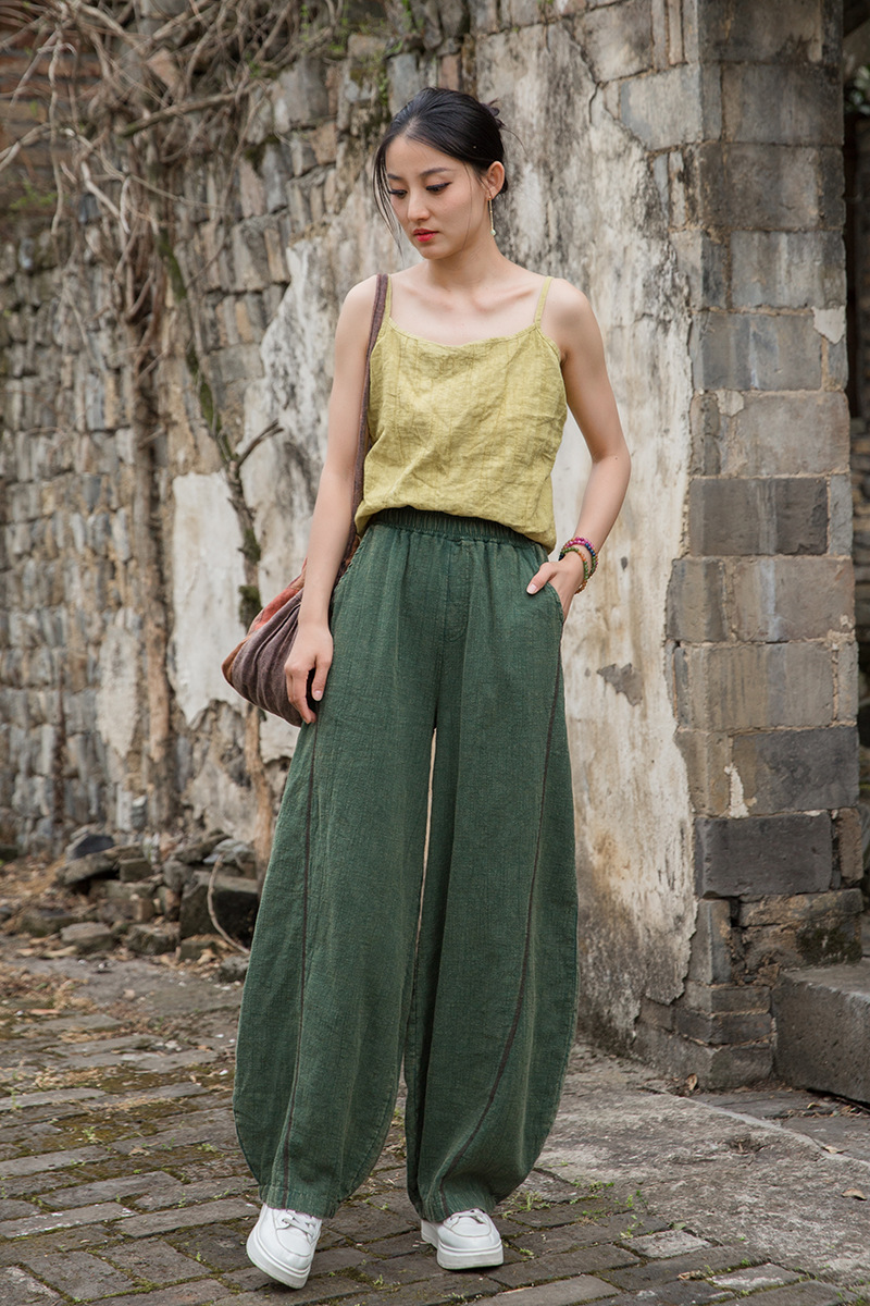 2025 가을 겨울 신상 여성용 면마 혼방 바지, 모시 샌드워싱, 색상 빈티지 처리, 명상용 랜턴 팬츠스토어 가기