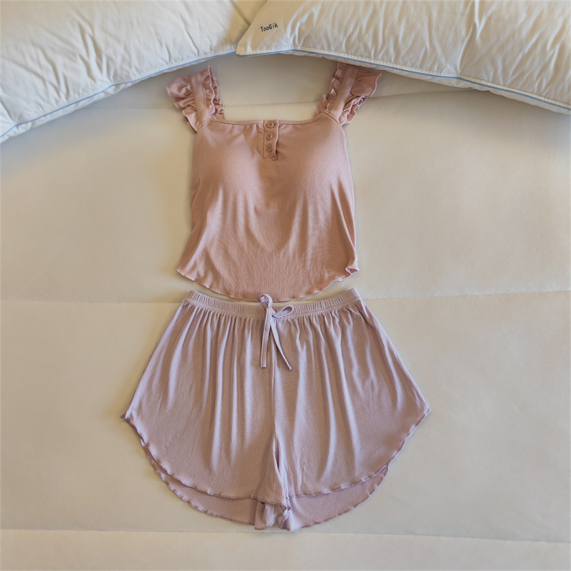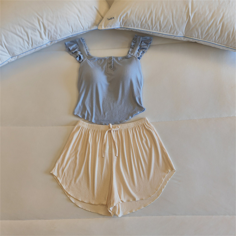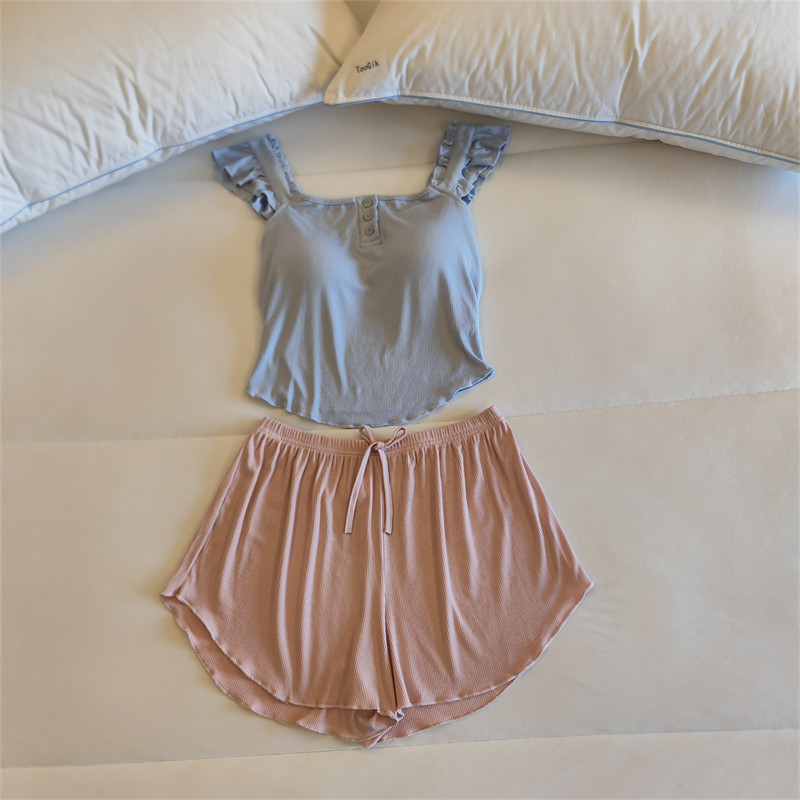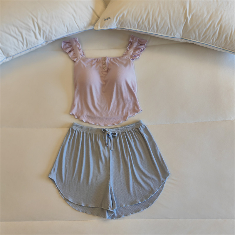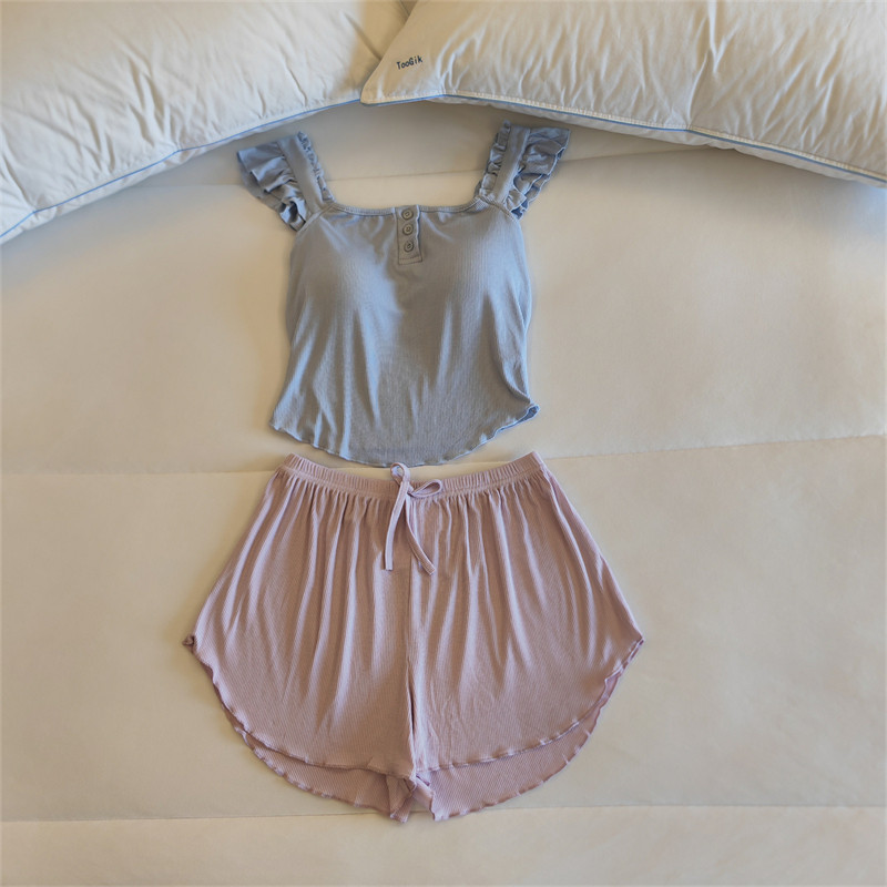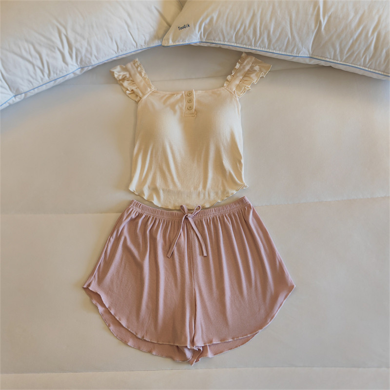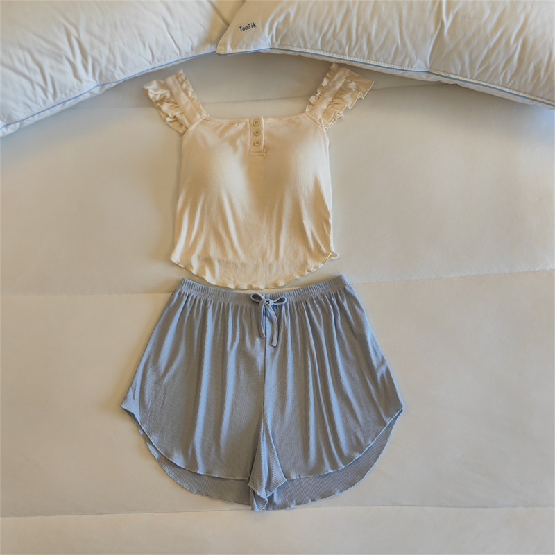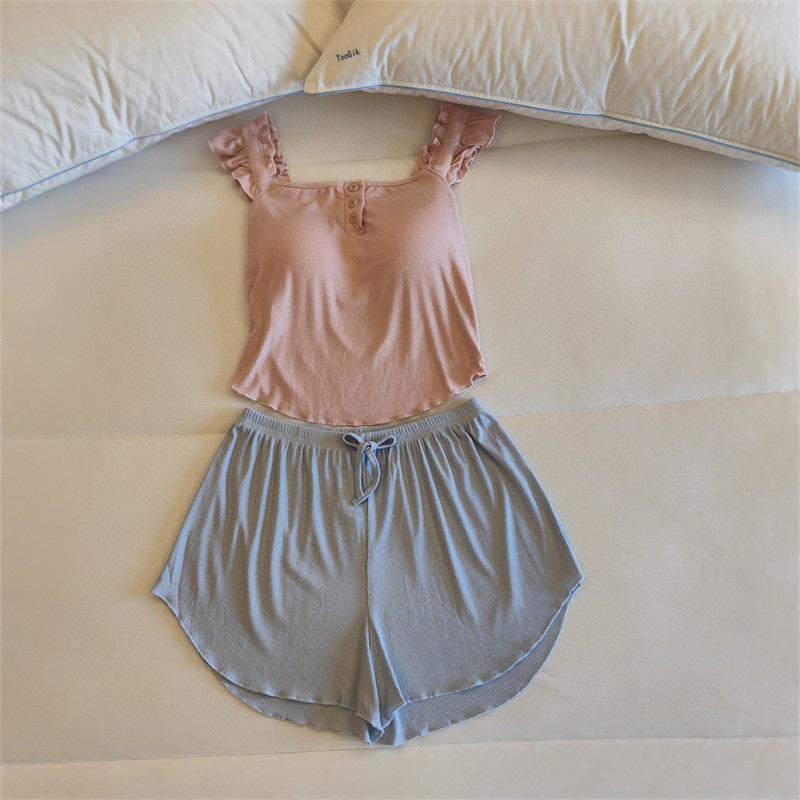 가슴 패드가 달린 원피스 파자마 여성용 여름 솔리드 컬러 슬링 반바지 투피스 새로운 스타일 순수한 욕망 스타일 모달 홈 의류