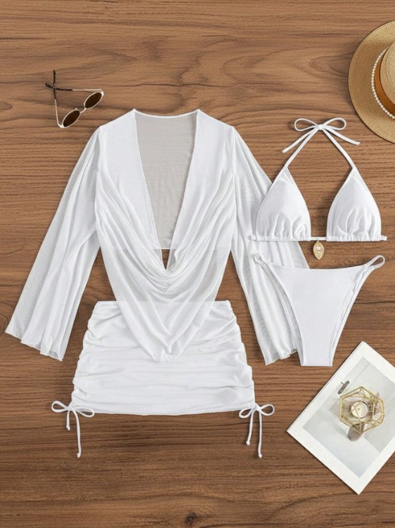 유럽과 미국의 스플릿 수영복, 여성스러운 4피스 세트, 가벼운 거즈 블라우스, 레이스업 비키니, 국경 간 대외 무역 새로운 비키니