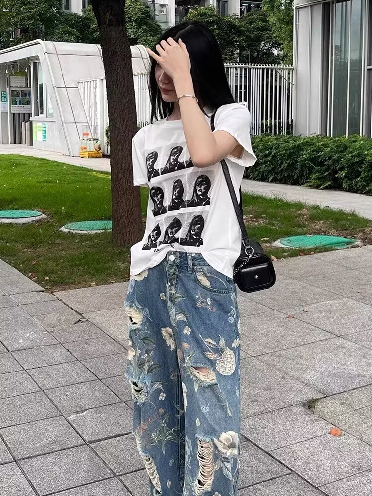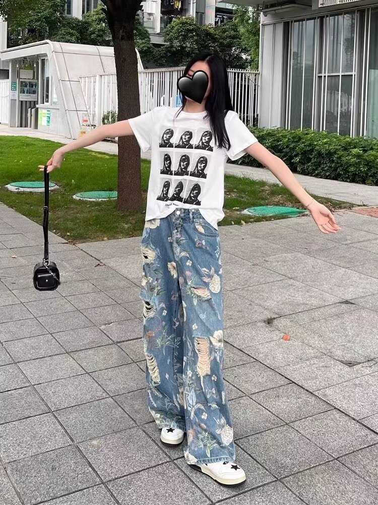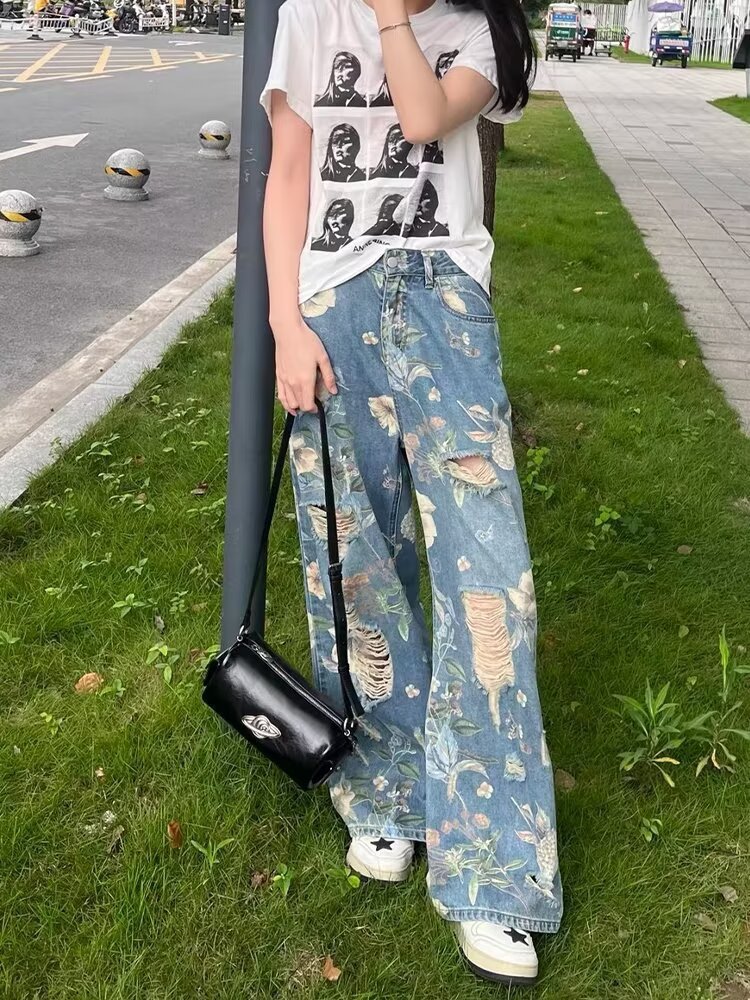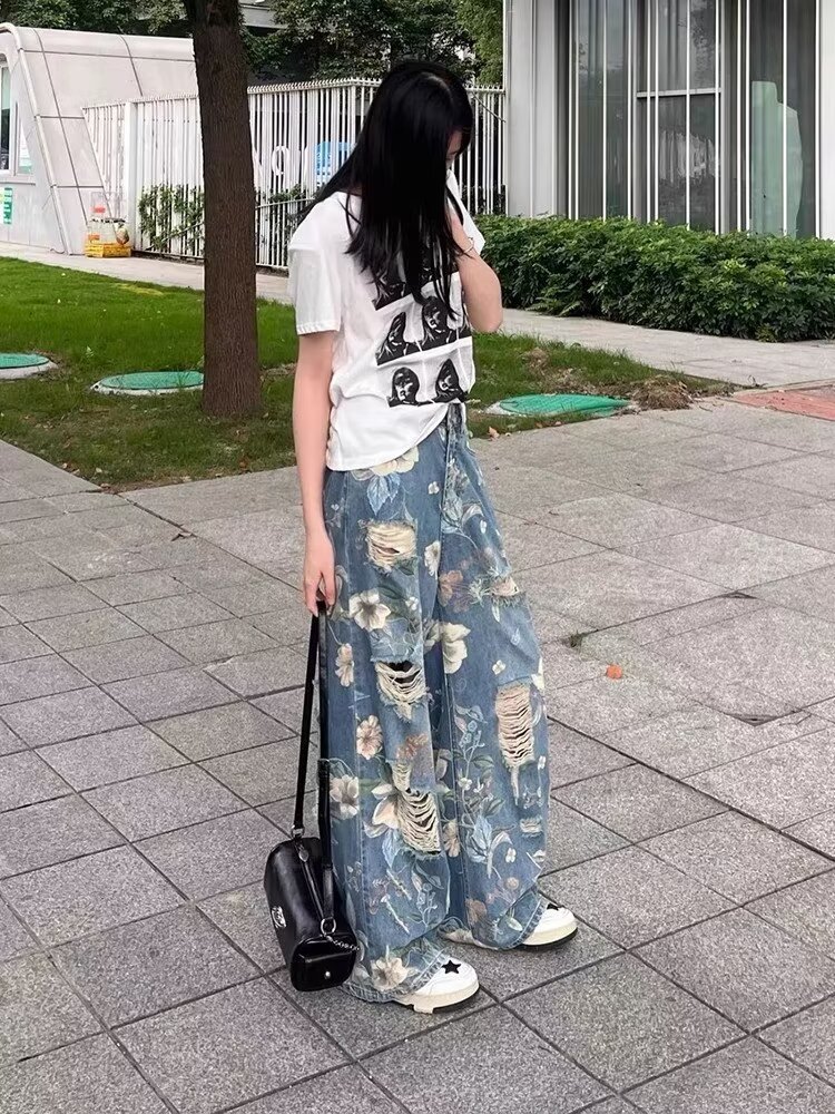 아메리칸 스타일 복고풍 꽃 낙서 인쇄 찢어진 청바지 여성 여름 디자인 높은 허리 느슨한 스트레이트 와이드 다리 바지스토어 가기