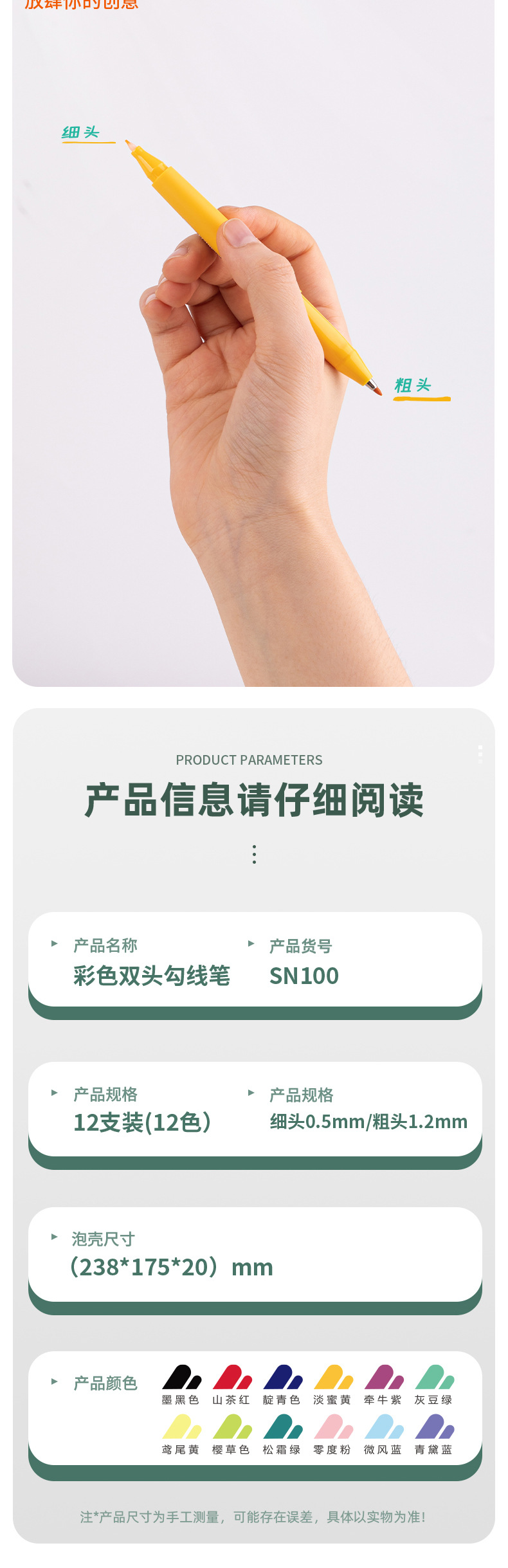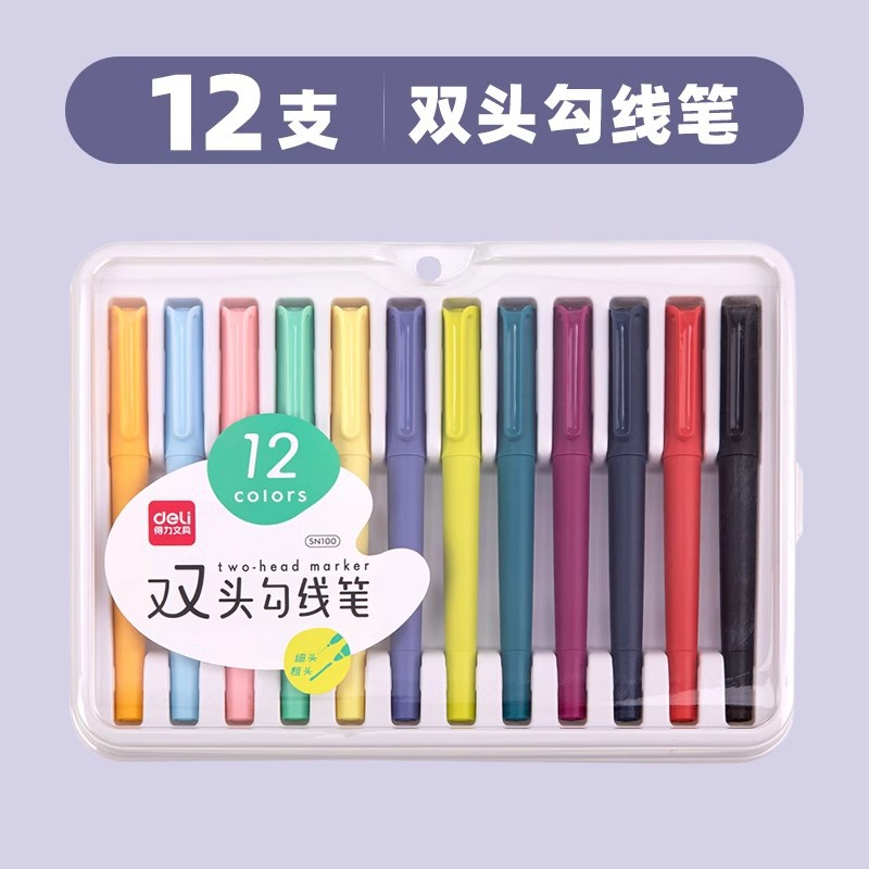 델리 SN100 후크 라인 펜 12색 세트 두께 이중 헤드 수제 핸드북 오피스 키 마커 후크 라인 펜