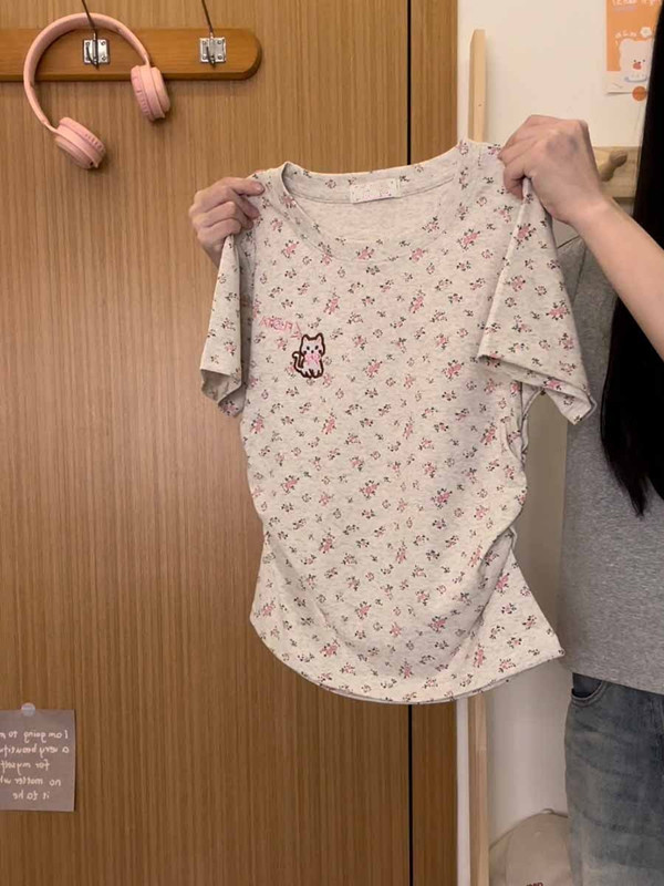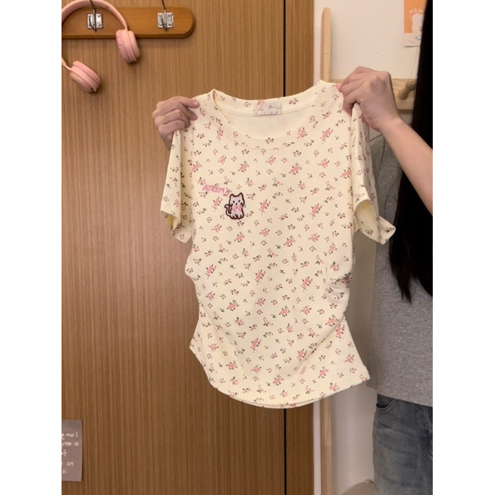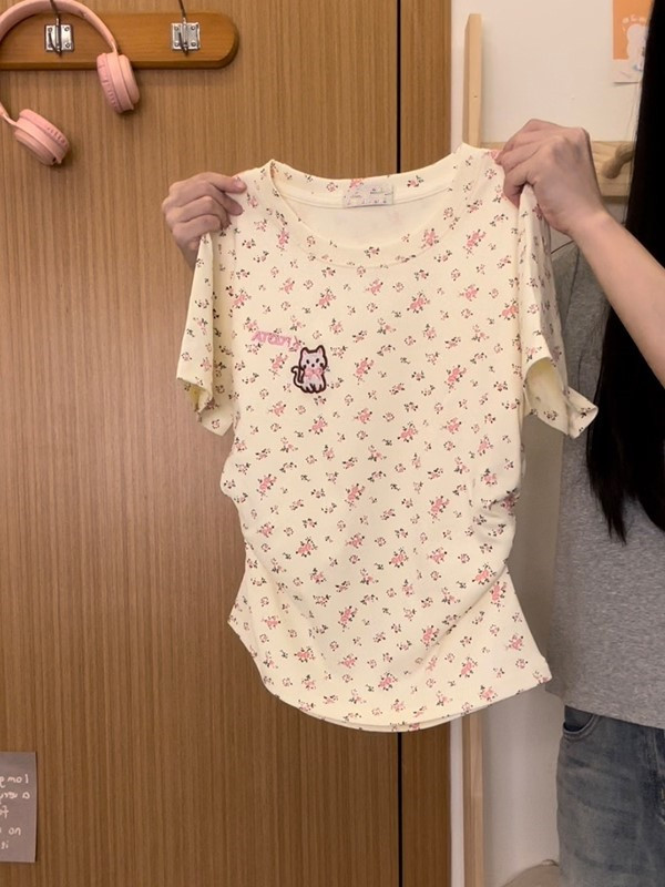 미국 스타일 뜨거운 소녀 어깨 꽃 반팔 여성 여름 고양이 자수 순수 슬림 핏 달콤한 소녀 짧은 정상스토어 가기
