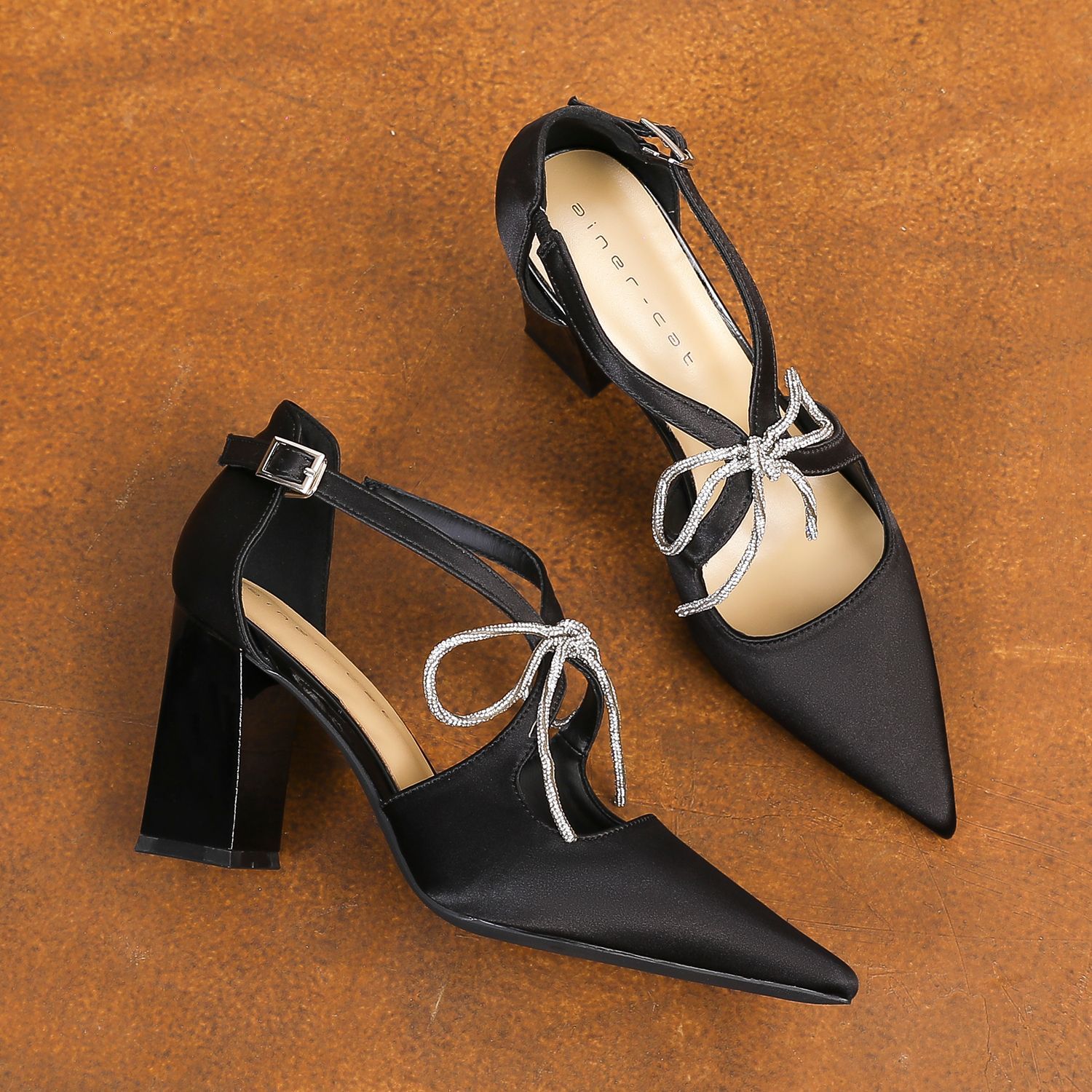 89812【양가죽】여성용 하이힐, 두꺼운 굽, 2026년 신상, 뾰족코, 속이 빈 디자인, 라인스톤, 리본 장식 구두스토어 가기