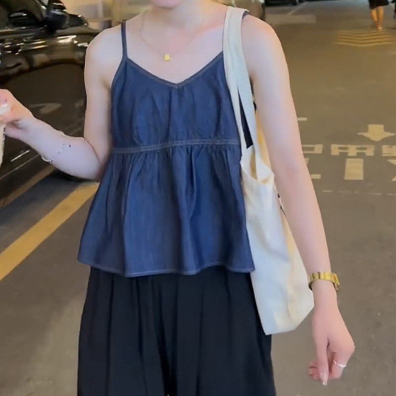 여성을위한 우아한 느슨한 올 매치 V 넥 민소매 짧은 데님 슬링 헴 러플 디자인 조끼 탑스토어 가기